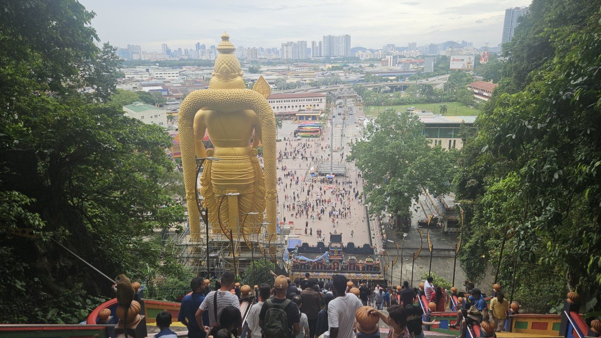 Poté se přesunujeme do pravé části areálu, kterému už dálky dominuje zlatá, 43 metrů vysoká socha boha Murugana. A také široké barevné schodiště s 272 schody, které vedou nahoru do hlavních jeskyní – Temple Cave, v tuto dobu na sestupném směru úplně plné. Výstup je v tropickém vedru trošku náročnější, ale výhledy z prudkého schodiště na město jsou parádní a ještě zpestřené pobíháním tlup opic, na které si po loňské zkušenosti z Langkawi dáváme pozor a všechno si pečlivě hlídáme.