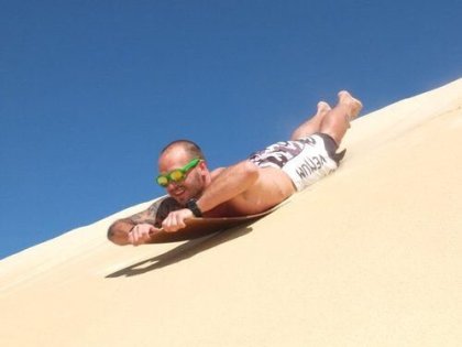 Dostáváme vouchery, instrukce a rozcházíme se po okolí. Dávám burger, VIP lounge kávu a na půl druhý jsem na startu Safari tour. Tu si nenechám ujít. Přeci jen jsme na druhém největším písečném ostrově na světě. Starej rozvrzanej 4WD autobus s větrem ošlehaným „ozí rančerem“ a 20ti dalšími míchanými pasažéry (převážně asiati; jak jinak) nás veze k dunám. Po 20ti minutách lesem jsme na místě. (pozn. cestu lesem asiati k mému údivu velmi kvitují. tak čechů je jen 10milonů, ale aspoň víme, jak les vypadá a někteří z nás už v něm třeba i párkrát – světe div se – byli). Rozlehlá poušť s obrovskou dunou. Všichni vystupujeme a driver nám ukazuje jak na to, pokud chceme sandboardingovat. Já samozřejmě a tak se jdu převlíct. Nakonec to na tom navoskovaným kusu plavoucí podlahy chce zkusit zhruba 70% z nás. Šplháme na dunu. Postupně to v tom vedru odpadá, předbíhám a nahoře jsem s driverem mezi prvními 5ti. Asi proto, že mezi ostatními vypadám nejvíce sportovně (nemachruju, to je prostě fakt) zvolí mě jako pokusného králíka. Odhazuji věci, lehám na board a už se řítím dolů. Slušná jízda ve slušných 60km/hod. Sklízím potlesk. Tvářím se jako hrdina:-)) Juch, dám to ještě jednou (za odměnu prej můžu). A tak opět vybíhám! Některým se nedaří prkno nebo své tělo ovládnout a tak se rychle opět dostávám na řadu. Tentokrát to sesvištím i s výbavou a zapnutou gopro. Teď jsem hrdina absolutní :D. No problém, čínská bando!