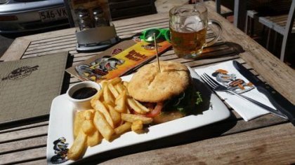 Po 15té hodině, po cestě odnikud nikam, narazím na restauraci Outback Jack. Na tabuli mají „crocodile burger“. Wow, neváhám. Dávám si ho s hranolkami, BBQ omáčkou a pintou studeného piva. Je to za 25, což není málo, ale dnes už jiný výdaj asi nehrozí. Pomlaskávám si a na protější straně mi do toho řve plná koruna stromu kaloňů. Fly fox!
