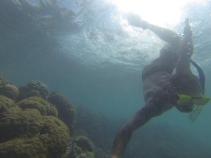 Už se spouští kotvy. Dechberoucí scenérie. Písečný ostrůvek plný ptáků, průzračný oceán s barevnými korály a rybkami viditelnými už z paluby. Jsme tu jen my, slunce a oceánský život v plné své kráse. Někteří se nechávají odvézt člunem na ostrůvek na pláž. Potápníci se potápějí. Nás asi 10 šnorchlerů lezeme do vody a dostáváme přísné instrukce. Nešlapat na korály, nedotýkat se jich! Tentokrát jsou totiž opravdu na dosah ruky v rozmezí půl až tří metrů od hladiny. Úchvatné struktury plné ryb, sasanek a jiných vodních živočichů, tak jak to znám z dokumentů. Paráda. Nevím kam dřív koukat, když v tom se polekám. Pár centimetrů pod pravou rukou mě ladně podplouvá velká mořská želva (kareta?). Přestanu se bát a ona se evidentně nebojí mě. Plaveme si spolu takových 10 minut všude po okolí. Když se vynořím, abych zkontroloval, zda nejsem moc daleko a zase ponořím zpět, už je pryč. Plav si krásko a díky moc!!
