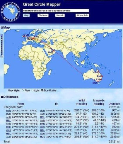 Absolvoval jsem celkem 9 letů, celkem přes 40800 km a 53 hodin ve vzduchu. Autobusem, vlakem, minibusem, taxíkem apod. jsem najezdil přes 850 km. Na člunech,loďkách,lodích a trajektech strávil celkem přes 10 hodin. A pěšky jsem ušel přes 245 km (průměrně přes 15km za den!). Navštívil jsem (na půl dne a více) 8 měst v 6ti státech a čtyřikrát jsem přeřizoval hodinky cestou tam, 3krát cestou zpátky.
