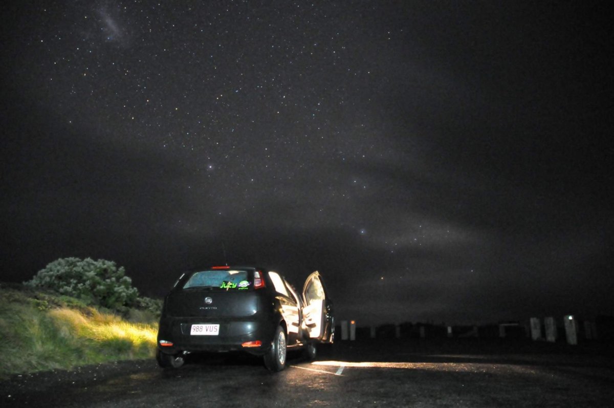 S mým kamarádem Michalem jsme vyrazili na cestu těsně po brzké večeři. Auto jsme si půjčili v půjčovně JUCY na letišti. Neměli jsme problém, ani když nám ještě nebylo dvacet pět (díky facebooková skupino Češi a Slováci v Melbourne!). Za necelé tři hodiny jsme dorazili do cíle – na parkoviště jedné z nejslavnějších zastávek této trasy, Twelve Apostles. Zaparkovali jsme hned vedle cedule, na které byl výrazně přeškrtnutý znak stanu. Sklopili jsme sedačky a lehli si. Necítila jsem se vůbec provinile. Stan jsme neměli a o spánku se nedalo mluvit už vůbec.