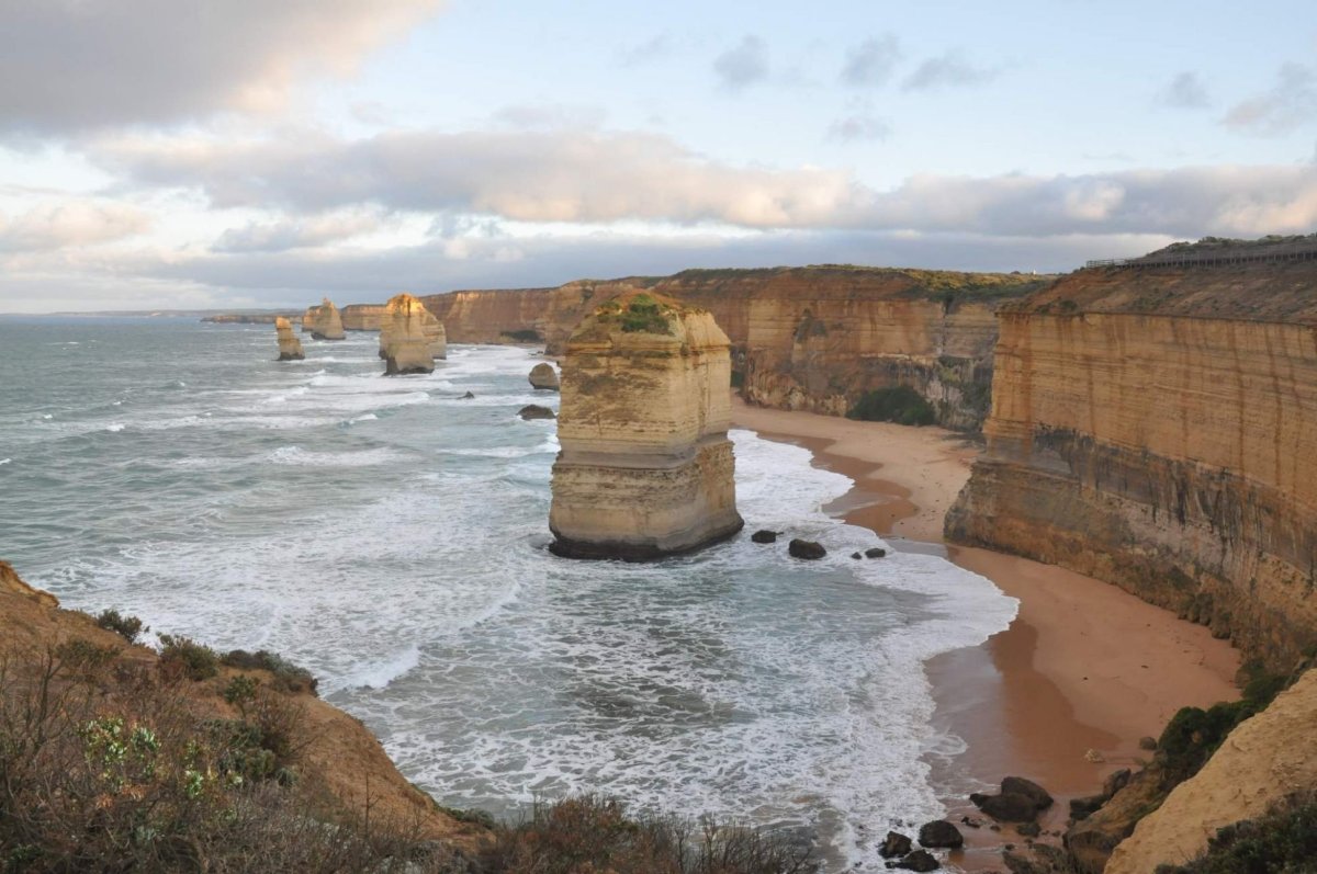 Vlny se ještě před pláží zakončenou vysokými kolmými útesy lámaly o skalnaté pozůstatky k nebi se tyčících Apoštolů. Některé z výčnělků dosahovaly do stejné výšky jako pobřeží, jiné už byly pouze pod erozí se ztrácejícím pozůstatkem. Už dávno jich není dvanáct. Rozpouští se v oceánu. I tak ale dokáží ohromit. Zvlášť, když naproti nim vychází slunce a jejich písková barva kontrastuje s prvními ranními paprsky.