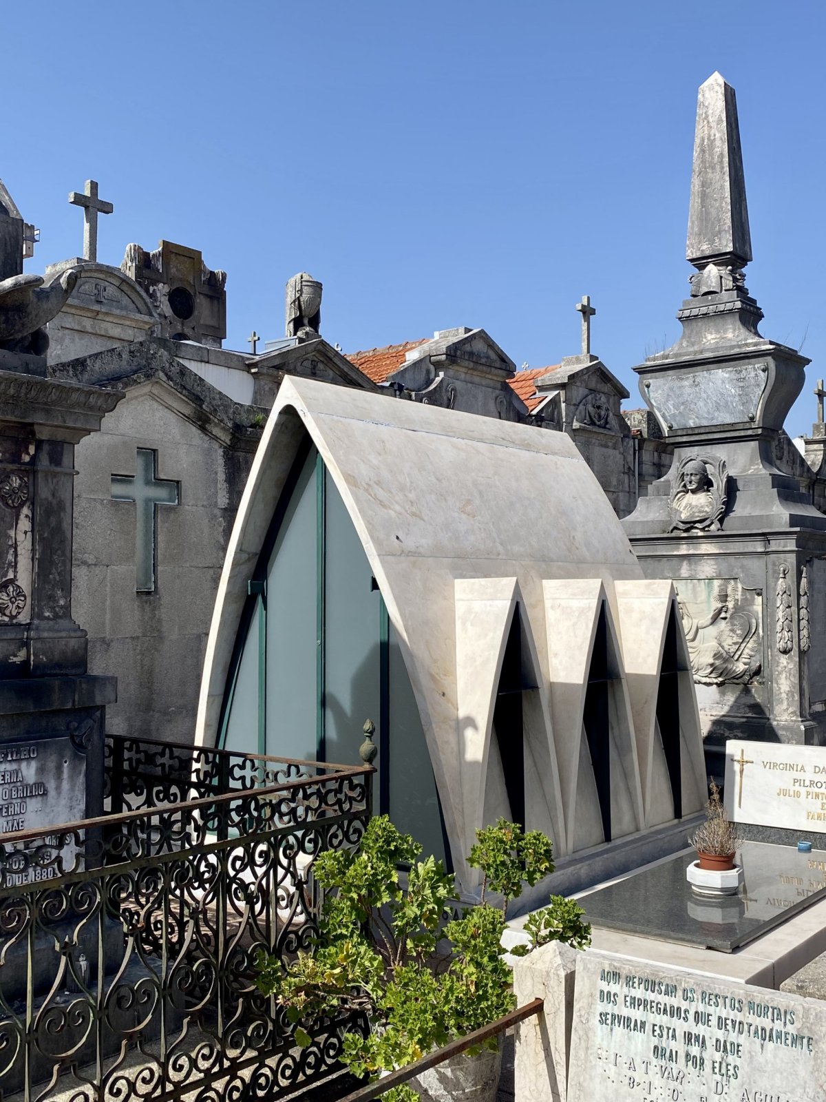 Další ráno jsme si u snídaně domluvili s paní bytnou, že nám na poslední den udělá balíček s jídlem, když nebudeme snídat a vyrazili na Trindado, kde jsme vzali metro ke stadionu FC Porto. Ne, že bychom byli nadšenými fotbalovými fanoušky, ale když už jsem někde, kde se hraje dobrej fotbal, chci vidět stadion. Obešli jsme si ho kolem dokola, mrkli do shopu , uznali, že to tam mají „Draci“ pěkný a pokračovali metrem ke Casa da Música. Je to zajímavá, moderní budova, která vypadá jako betonovej kontejner a uvnitř je úžasná jak výzdobou, tak světlem a určitě i akustikou. Jen škoda, že není hezčí okolí, všude beton a nějaká obchodní střediska, okolní ulice jsou pěkně ušmudlaný. Posunuli jsme se autobusem na hřbitov Da Lap (v každým městě potřebuju vidět hřbitov), kde jsme mezi klasickými náhrobky objevili i úplně moderní hrobku, to jsem ještě nikde neviděla. Kostel (výjimečně ne modrobílý) byl bohužel zavřený, ale s krásnými věžemi, kde zrovna tlouklo poledne.
