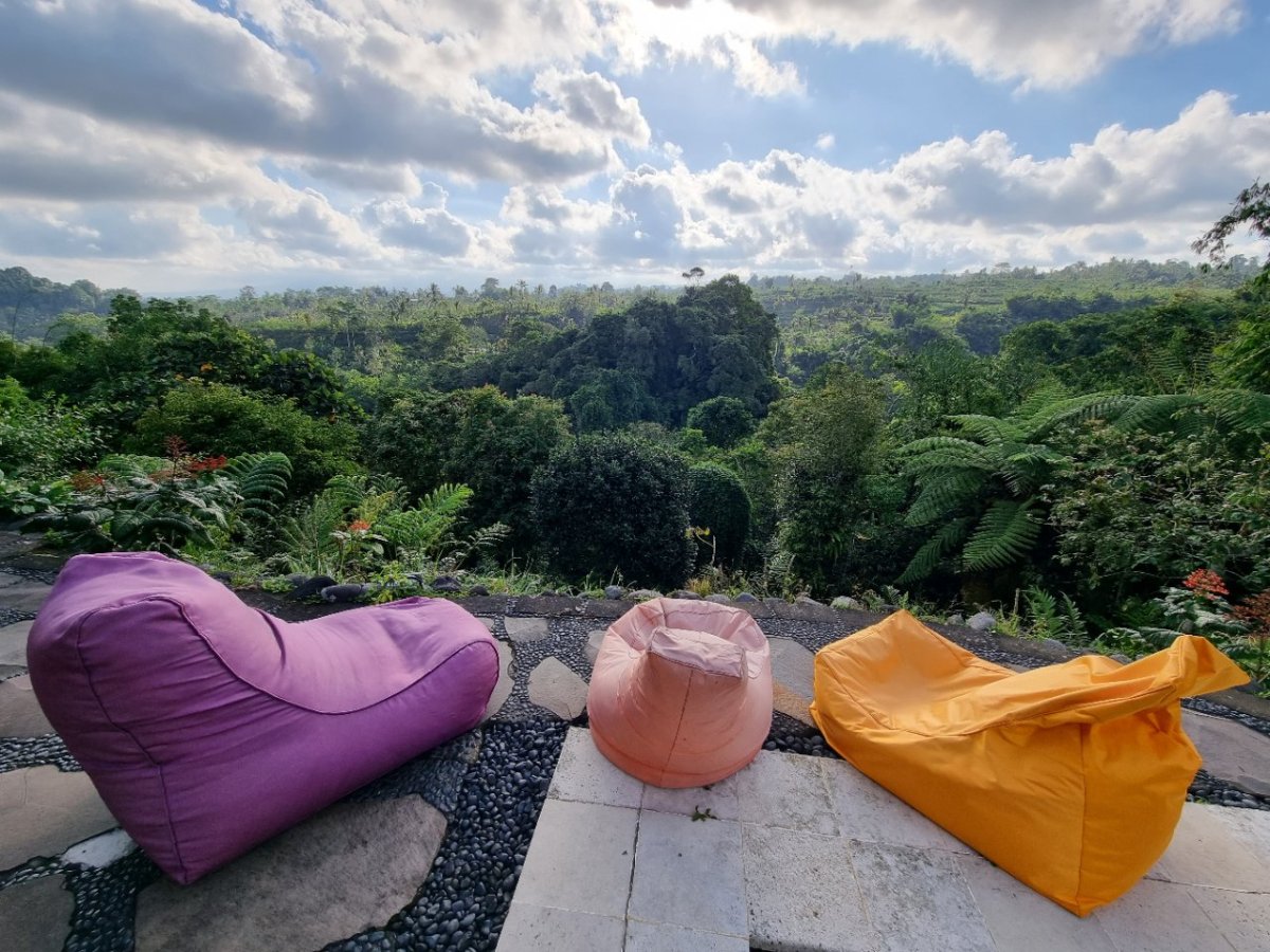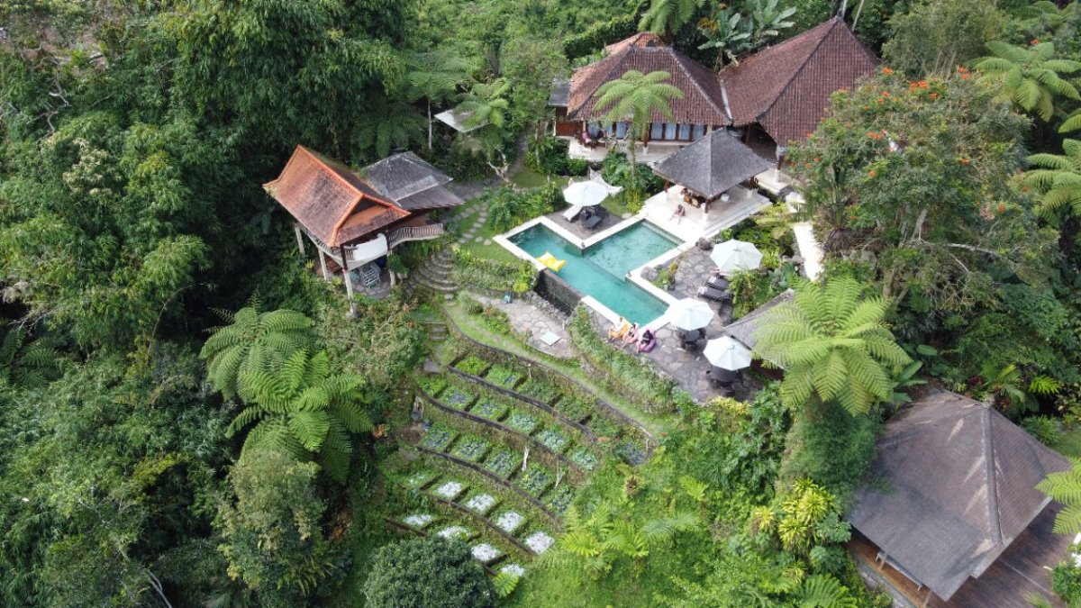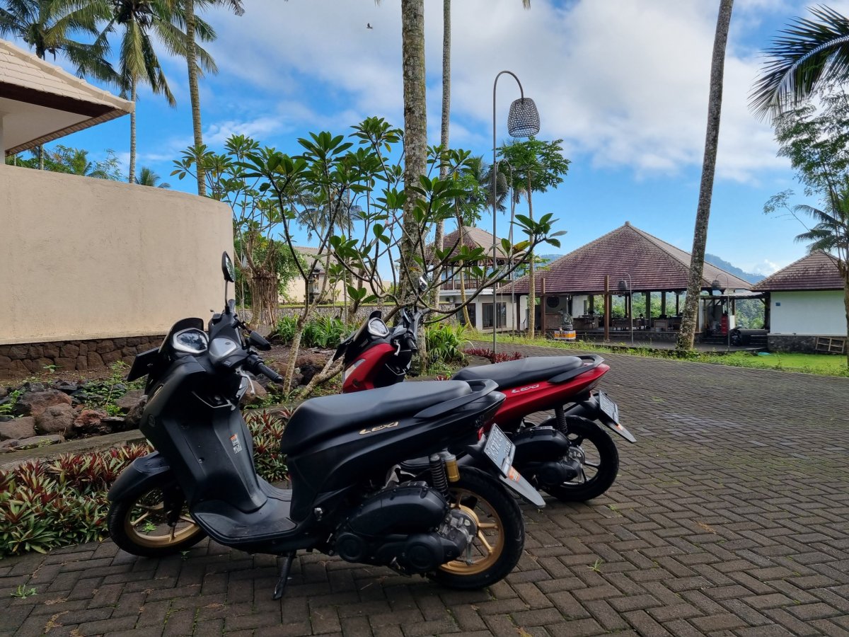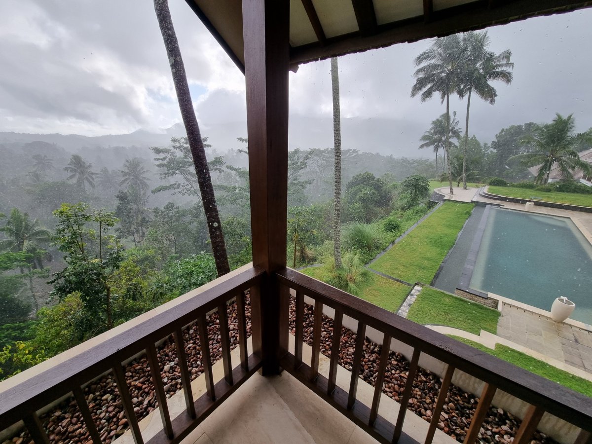 Zaplatili jsme Chetutovi za odvoz a motorky, ubytovali se a šli se podívat do našeho apartmánu. Spadla nám brada. Měli jsme očekávání, že to bude nádhera, ale taková pecka se nedá ani očekávat. Připlatili jsme si za nejlepší apartmán, který nabízeli, ale díky tomu, že jsme ho rezervovali už téměř před rokem, byl i za dobrý peníz. Jednalo se v podstatě o celý byt v prvním patře (pod námi byl ještě přízemní apartmán) s dechberoucím výhledem do údolí a na nekonečný bazén. V dálce byl na protějším kopci při dobré viditelnosti vidět chrám Lempuyang a často z té strany byly slyšet modlitby. Ten pohled do palmového lesa byl neuvěřitelný i při dešti a převalujících se mracích. A tyto mraky bohužel nezklamaly. Jakmile jsme se vydali do bazénu, spustil se déšť, který prakticky nepřestal dva dny. A že byl chvílemi pořádný – o tom ale až později. Navečeřeli jsme se na hotelu, protože jsme si netroufali v dešti a tmě vyjet. Hotel byl totiž umístěný uprostřed palmového lesa a do nejbližší zástavby cca 2 km daleko. Jídlo bylo dobré, ale na místní poměry dost drahé a málo ochucené.