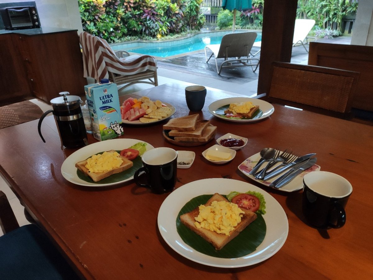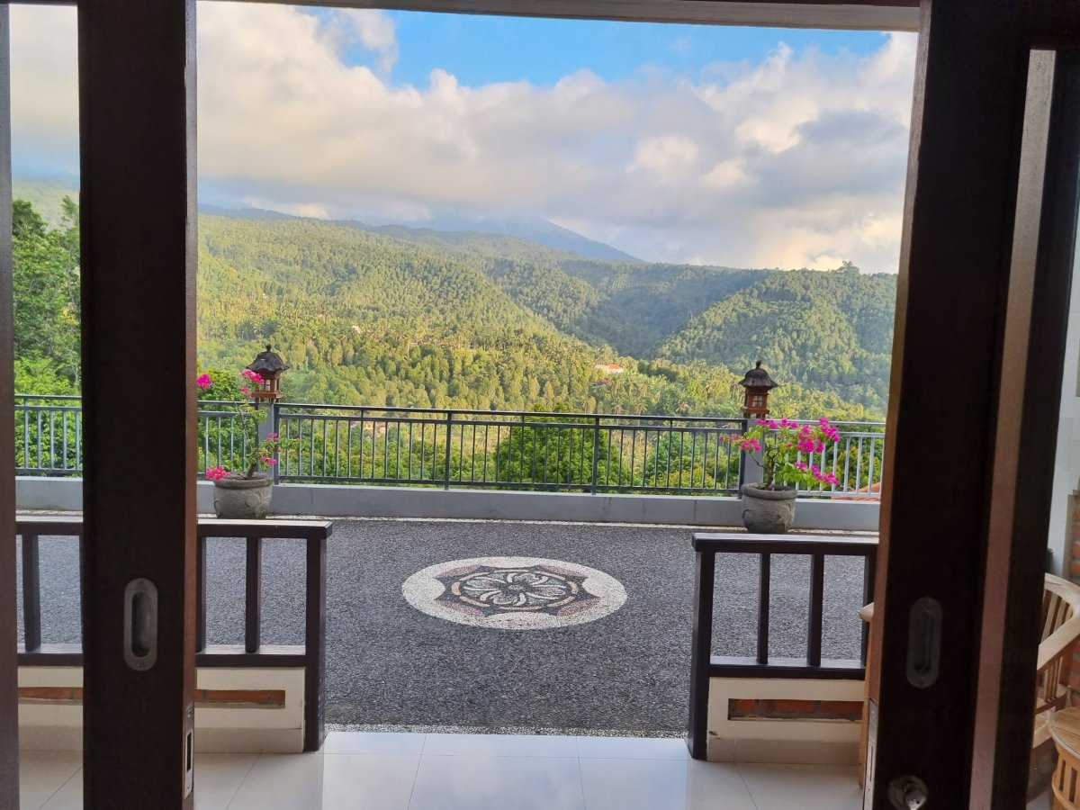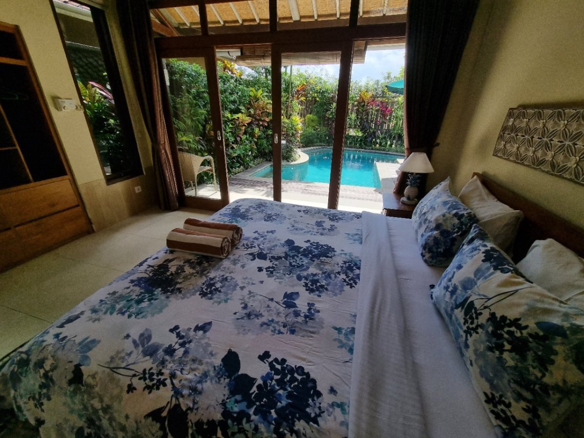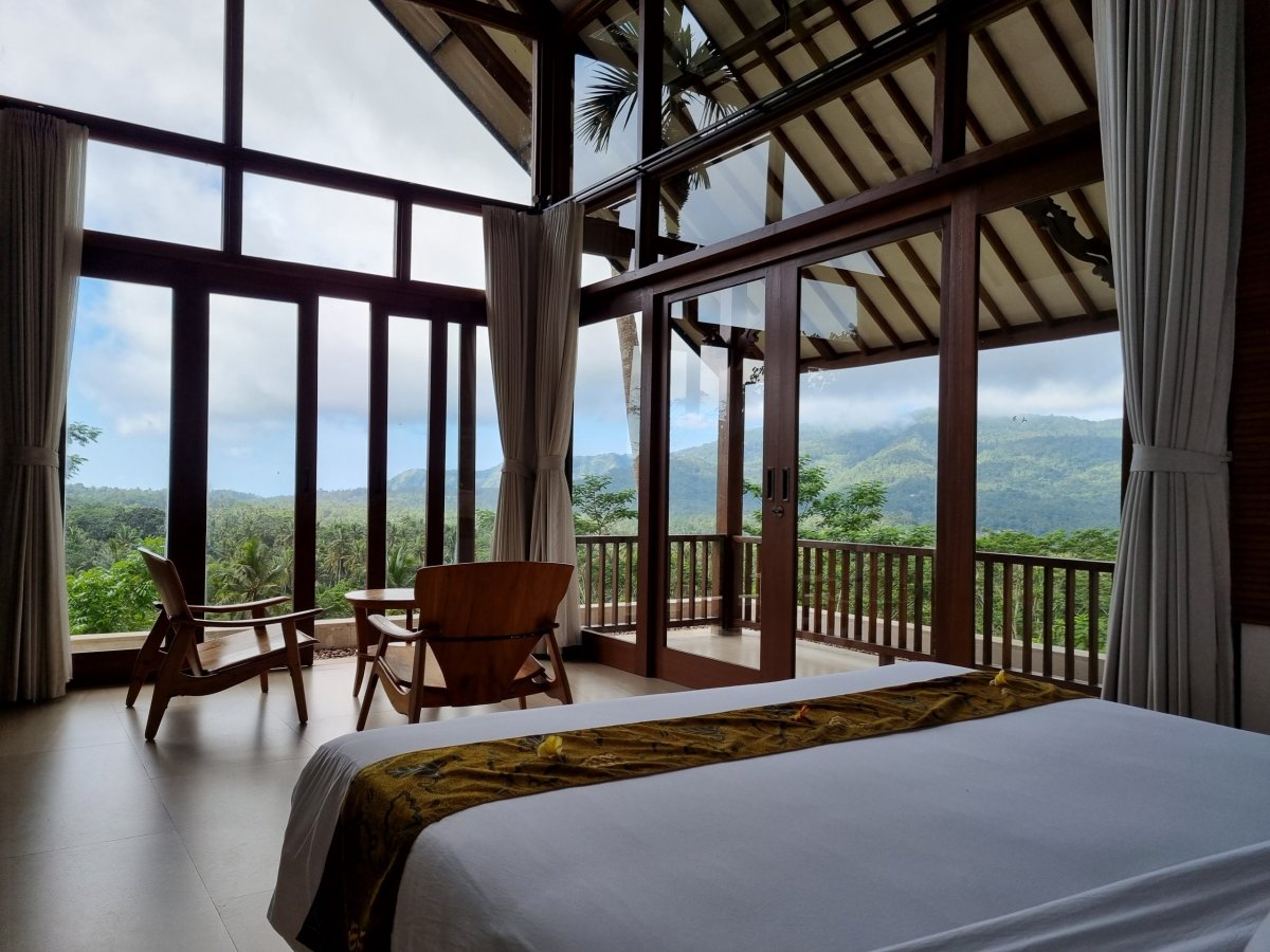 Zaplatili jsme Chetutovi za odvoz a motorky, ubytovali se a šli se podívat do našeho apartmánu. Spadla nám brada. Měli jsme očekávání, že to bude nádhera, ale taková pecka se nedá ani očekávat. Připlatili jsme si za nejlepší apartmán, který nabízeli, ale díky tomu, že jsme ho rezervovali už téměř před rokem, byl i za dobrý peníz. Jednalo se v podstatě o celý byt v prvním patře (pod námi byl ještě přízemní apartmán) s dechberoucím výhledem do údolí a na nekonečný bazén. V dálce byl na protějším kopci při dobré viditelnosti vidět chrám Lempuyang a často z té strany byly slyšet modlitby. Ten pohled do palmového lesa byl neuvěřitelný i při dešti a převalujících se mracích. A tyto mraky bohužel nezklamaly. Jakmile jsme se vydali do bazénu, spustil se déšť, který prakticky nepřestal dva dny. A že byl chvílemi pořádný – o tom ale až později. Navečeřeli jsme se na hotelu, protože jsme si netroufali v dešti a tmě vyjet. Hotel byl totiž umístěný uprostřed palmového lesa a do nejbližší zástavby cca 2 km daleko. Jídlo bylo dobré, ale na místní poměry dost drahé a málo ochucené.