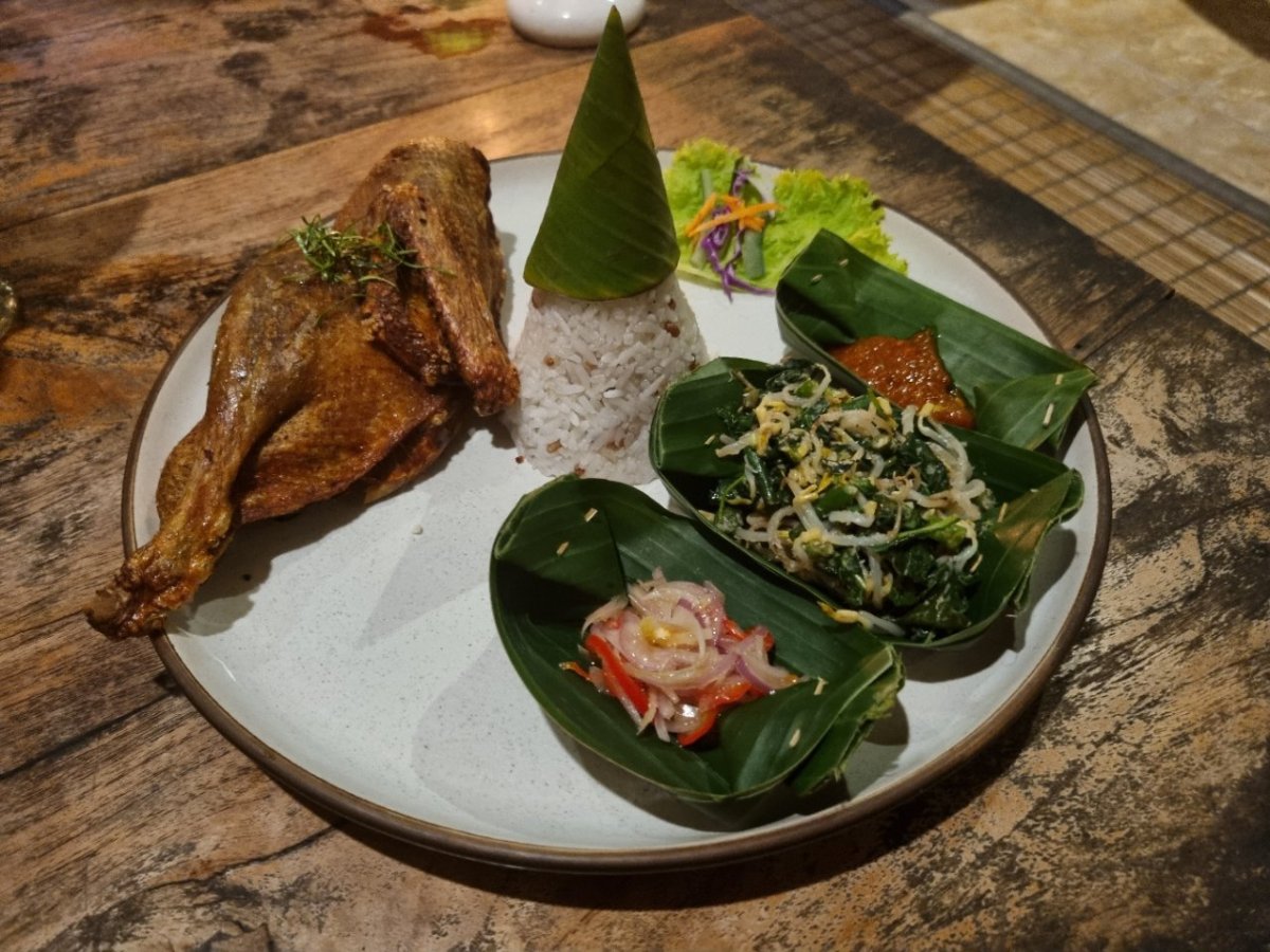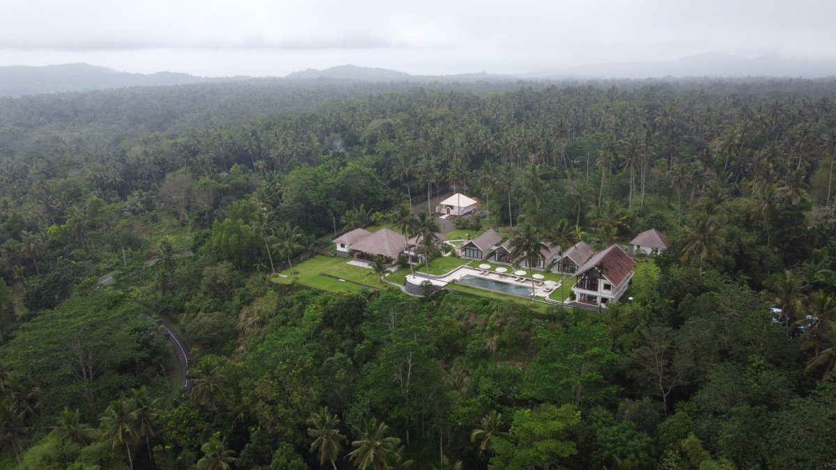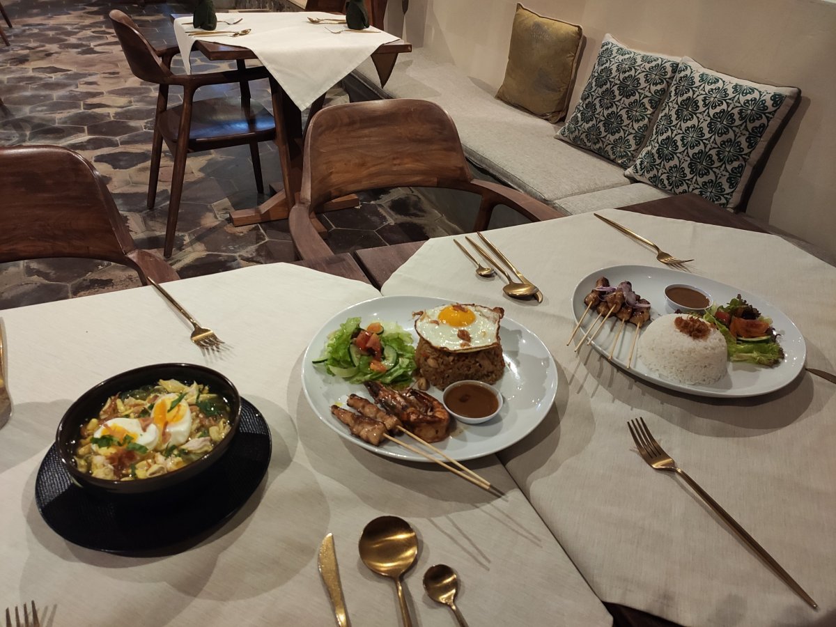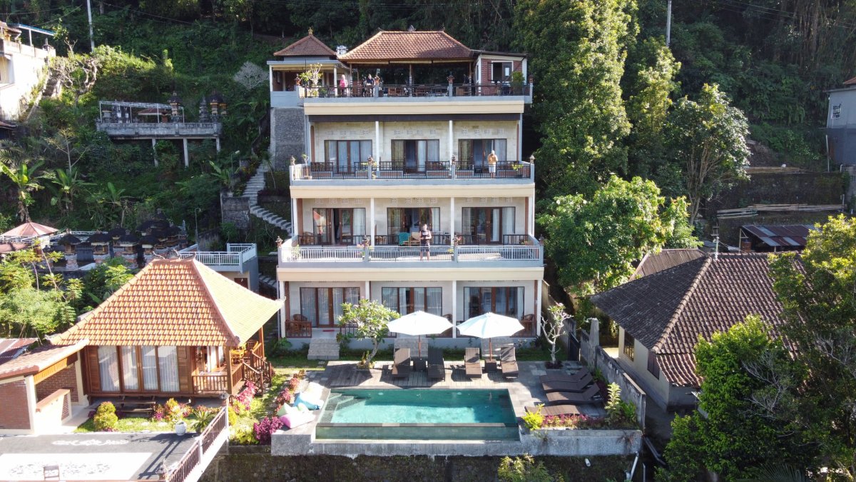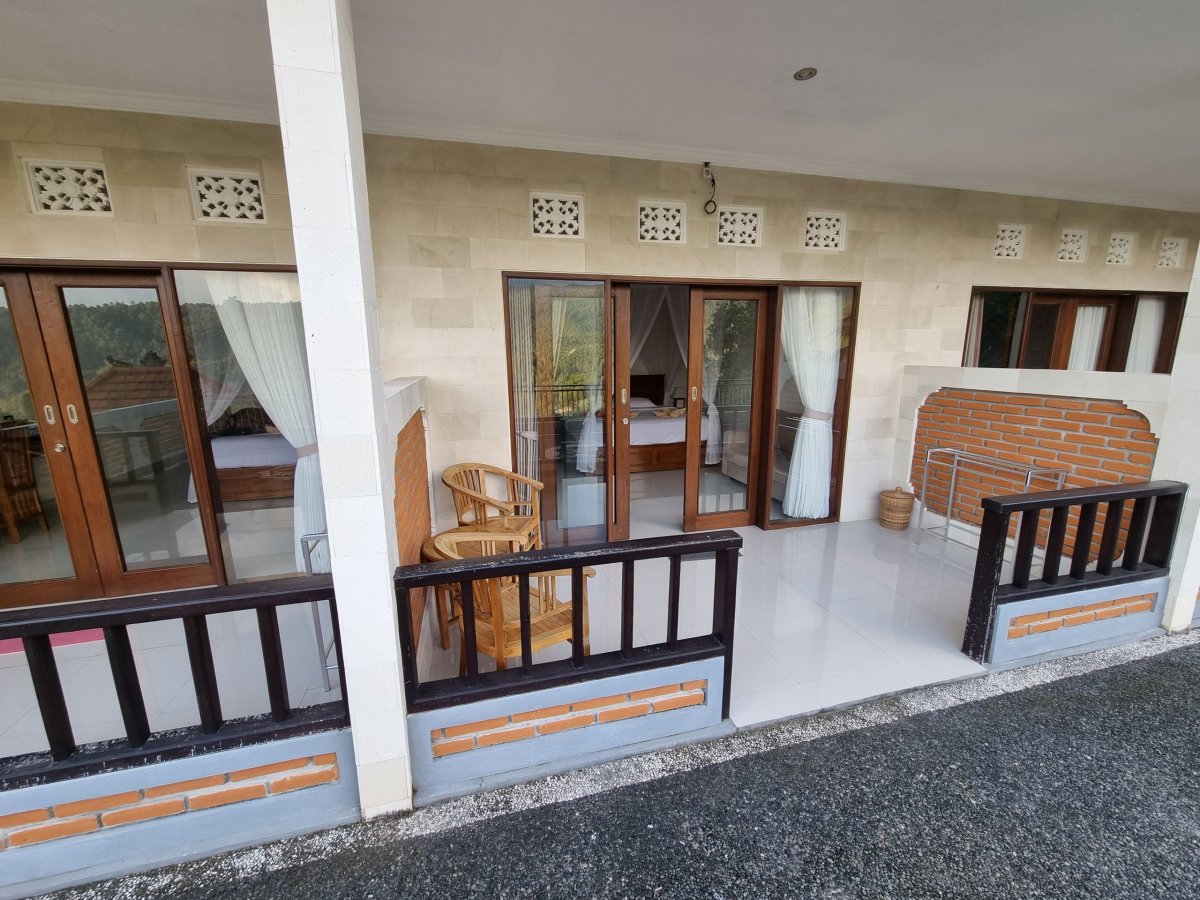 Zaplatili jsme Chetutovi za odvoz a motorky, ubytovali se a šli se podívat do našeho apartmánu. Spadla nám brada. Měli jsme očekávání, že to bude nádhera, ale taková pecka se nedá ani očekávat. Připlatili jsme si za nejlepší apartmán, který nabízeli, ale díky tomu, že jsme ho rezervovali už téměř před rokem, byl i za dobrý peníz. Jednalo se v podstatě o celý byt v prvním patře (pod námi byl ještě přízemní apartmán) s dechberoucím výhledem do údolí a na nekonečný bazén. V dálce byl na protějším kopci při dobré viditelnosti vidět chrám Lempuyang a často z té strany byly slyšet modlitby. Ten pohled do palmového lesa byl neuvěřitelný i při dešti a převalujících se mracích. A tyto mraky bohužel nezklamaly. Jakmile jsme se vydali do bazénu, spustil se déšť, který prakticky nepřestal dva dny. A že byl chvílemi pořádný – o tom ale až později. Navečeřeli jsme se na hotelu, protože jsme si netroufali v dešti a tmě vyjet. Hotel byl totiž umístěný uprostřed palmového lesa a do nejbližší zástavby cca 2 km daleko. Jídlo bylo dobré, ale na místní poměry dost drahé a málo ochucené.