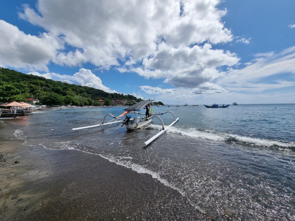 První noc na Bali v překrásném hotelu. Pořád mi v hlavně znělo: když v ráji pršelo. Obrovský slejvák střídal slabší déšť a zase slejvák. Podle předpovědi má pršet další dva dny. Vítr se opíral do střechy a já si říkala, že budeme mít naše zaplacené motorky celý pobyt zaparkované na tom slejváku a nikam nevyjedeme. Takhle si to člověk neplánoval. Ale vzdát jsme se nechtěli, v motorkách jsou přeci pláštěnky a něco se vymyslet musí. Ráno mě napadla spásná myšlenka: podívám se na meteoradar, jestli by se tomu dešti nedalo ujet. A hle. O 10 km dále by pršet nemělo. Řekli jsme si, že nemáme co ztratit, osedlali naše oře, oblékli pláštěnky a vyrazili do Amedu. Na zádech jsem vezla šnorchlovací výbavu – co kdyby se hodila. A hodila! Po pěti ujetých kilometrech, přebrozené řece, kterou vytvořil přes noc na silnici déšť, vylezlo sluníčko! Sundali jsme pláštěnky, nasadili sluneční brýle a vydali se na pláž Jemeluk, kde by se mělo dát šnorchlovat a měl by tam být vidět „underwater temple“. Pláž černá vulkanická, viditelnost ve vodě žádný zázrak, prakticky po celé pláži lehátka a slunečníčky místních warungů (název pro místní bistro). Dali jsme si jeden kokos, abychom měli lehátka zadarmo a asi po hodince pokračovali dál. „Underwater temple“ bylo dost zklamání, ale i tak jsme byli šťastní, že svítí sluníčko a že je krásně! Po cestě jsme si dali oběd, rybu mahi-mahi na grilu. Potom jsme osedlali motorky a pokračovali asi půl hodinky k USAT Liberty shipwreck. Překvapilo nás, že místo, kde by měl být vidět pod vodou vrak lodi jen se šnorchlem, bez potřeby potápění, bylo takové prázdné, opuštěné, betonové. Moře v Amedu nás nenadchlo, ale je pravda, že i přes krapet rozbouřenější vodu a slabší viditelnost, byl vrak lodi krásně vidět. Zrovna se pod námi pohybovali potápěči s baterkami a místu tak dodávali tajemno. Člověku se až tajil dech. Z hloubky se na nás zvedaly bublinky z jejich dýchacích přístrojů. Bylo to magické a trochu strašidelné. Člověk si až říkal, jaký vodní tvor na něj z vraku vykoukne. Muréna? Chobotnice? Nakonec jsme viděli jen menší trnuchu.