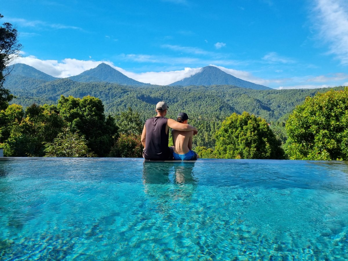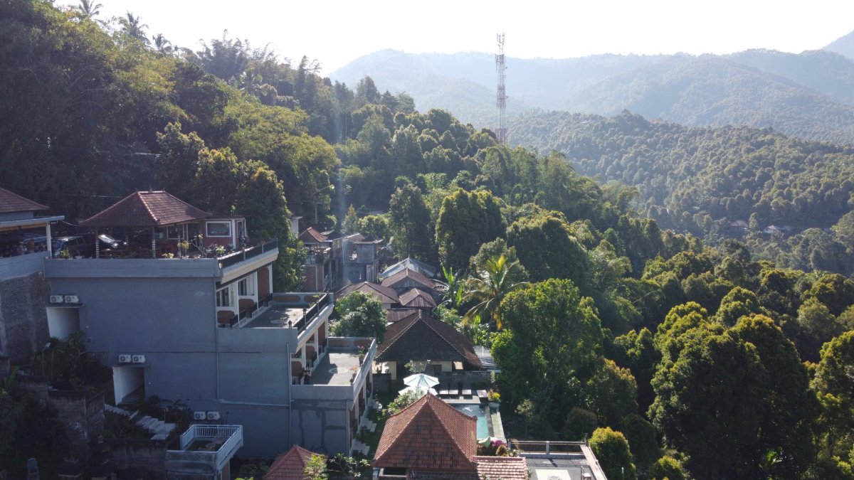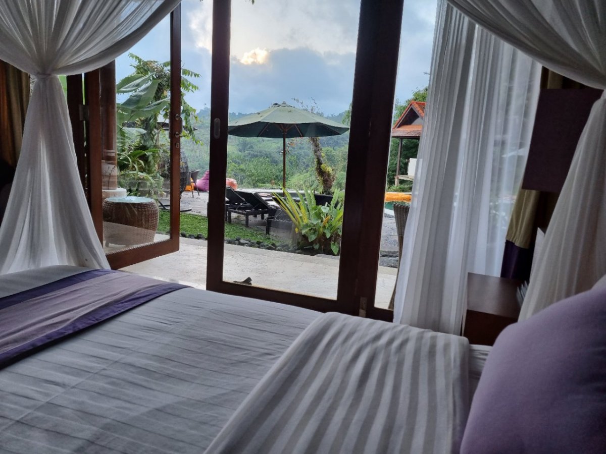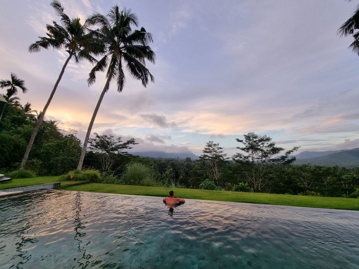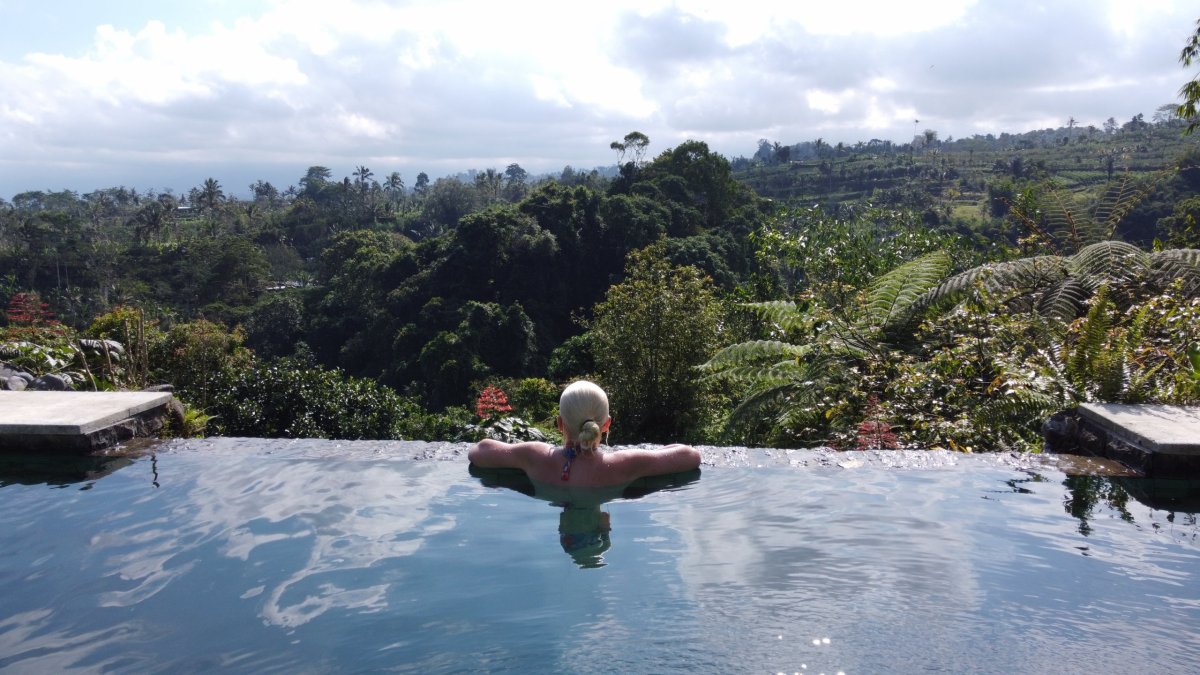 Slunce už se pomalu sklánělo k západu a my konečně dorazili na naše další ubytování. Gede už toho měl viditelně po 5 hodinách za volantem dost, hlavně kvůli komplikacím po cestě, uzavírkám, sesuvům. I když byl penzion zastrčený, našel ho napoprvé a když jsme spolu s ním vešli dovnitř, spadla mu brada a začal si to tam točit a fotit. Však se to tam taky jmenovalo Heaven in Bali a nad nekonečným bazénem zrovna zapadalo slunce. Bydleli jsme v menším bungalovu s výhledem na bazén a venkovní koupelnou – to byla sranda, ale bylo to i praktické z hlediska vlhkosti. Celé ubytování je totiž na svahu v džungli, spí se pod moskytiérou a po střeše v noci běhají nějaká zvířata. Ani tady jsme však nenarazili na jediného komára. V noci vylézali všelijací brouci, mravenci, tak ta moskytiéra spíš kvůli nim. Na recepci nám tady také říkali, že máme štěstí, že předcházející dny pršelo a hodně. Na recepci jsme se ujistili, že s námi počítají na zítřejší ranní výstup na horu Batur na východ slunce a po menších zmatcích nám to potvrdili. Tak honem umýt a spát, budeme vstávat ve dvě v noci.