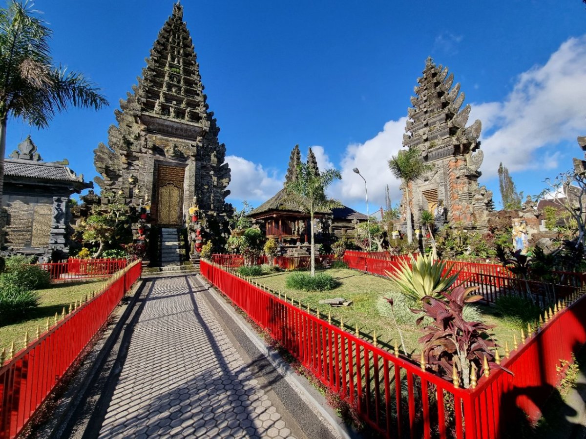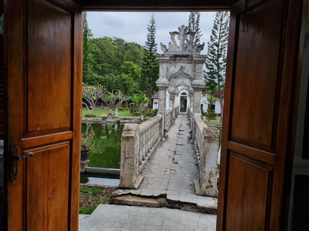 Na druhý den ráno jsme si naplánovali brzkou ranní výpravu na Lempuyang, chtěli jsme tam pozorovat východ slunce a nechat si udělat ikonickou fotku se zrcátkem v bráně chrámu a v pozadí se sopkou Agung. Cesta byla krátká, na motorkách asi 20 minut. Zaparkovali jsme na parkovišti, zaplatili za autobus a nechali se vyvézt nahoru k chrámu. Zaplatili vstupné, vyfasovali krásný sarong a dostali pořadové číslo 85! Ještě byla tma, nebylo ani šest hodin ráno a chrám ještě ani neotevřel, a i přesto tak vysoké číslo. No, věděla jsem už v ten moment, že se té ikonické fotky se zrcátkem nedočkáme, protože na nás v 11 hodin měl na hotelu čekat řidič, se kterým jsme měli pokračovat na další ubytování. Z chrámu jsme byli docela zklamaní, prakticky se jednalo jsem o tu ikonickou bránu, schodiště a nic dalšího k prozkoumání. Čekali jsme hodinu a půl, fotograf se dostal k číslu 20. Když už snad posté říkal „next pose“, jsme zhodnotili, že se vrátíme na hotel a svoje číslo 85 někomu přenecháme, třeba nám to karma vrátí. Stejně nebylo ani slunce, prozatím byl celý chrám stále zahalený v mraku. Jakmile jsme sjeli autobusem do údolí a osedlali naše motorky, vykouklo sluníčko a ukázalo nám sopku Agung v celé své kráse. Moc hezký pohled, jako by člověk byl někde v Nepálu a frčel si tam na motorkách v horách. Možná nejhezčí moment celé výpravy k chrámu. Na hotelu už svítilo sluníčko, tak jsme se vykoupali v bazénu a nasnídali. S Chetutem jsme se domluvili, že necháme motorky na hotelu a klíče dáme na recepci, že si pro ně během dne přijede. V jedenáct na nás čekal řidič Gede, dali jsme krosny do kufru a vyrazili na cestu do našeho dalšího ubytování. Během přesunu jsme si naplánovali dvě zastávky po cestě: dva chrámy. Cesta přes střed Bali byla dost dobrodružná, protože ten silný déšť, se kterým jsme se potýkali i my, zasáhl ještě s větší silou centrální Bali, pršelo prý i v Ubudu a v Kutě, nejezdily trajekty na ostrovy. Po cestě jsme museli minimálně dvakrát objíždět zničenou cestu, viděli jsme popadané stromy na cestách, strhaný asfalt, sesuvy půdy…ještě jsme pak několikrát o tom mluvili s místními. Podle nich to byla neobvykle silná bouře, na kterou nejsou zvyklí ani v období dešťů, natož teď uprostřed období sucha. Ještě se z toho budou chudáci na některých místech dlouho sbírat.