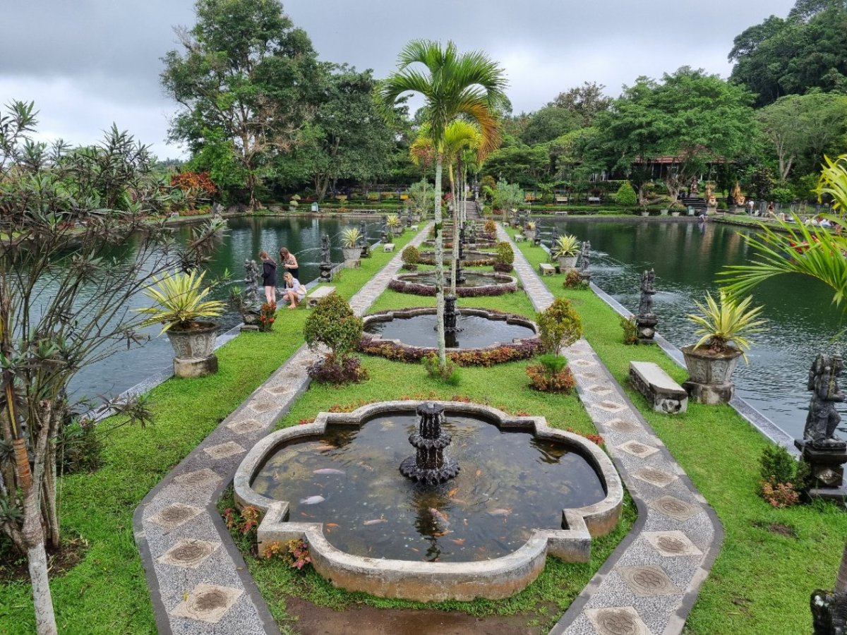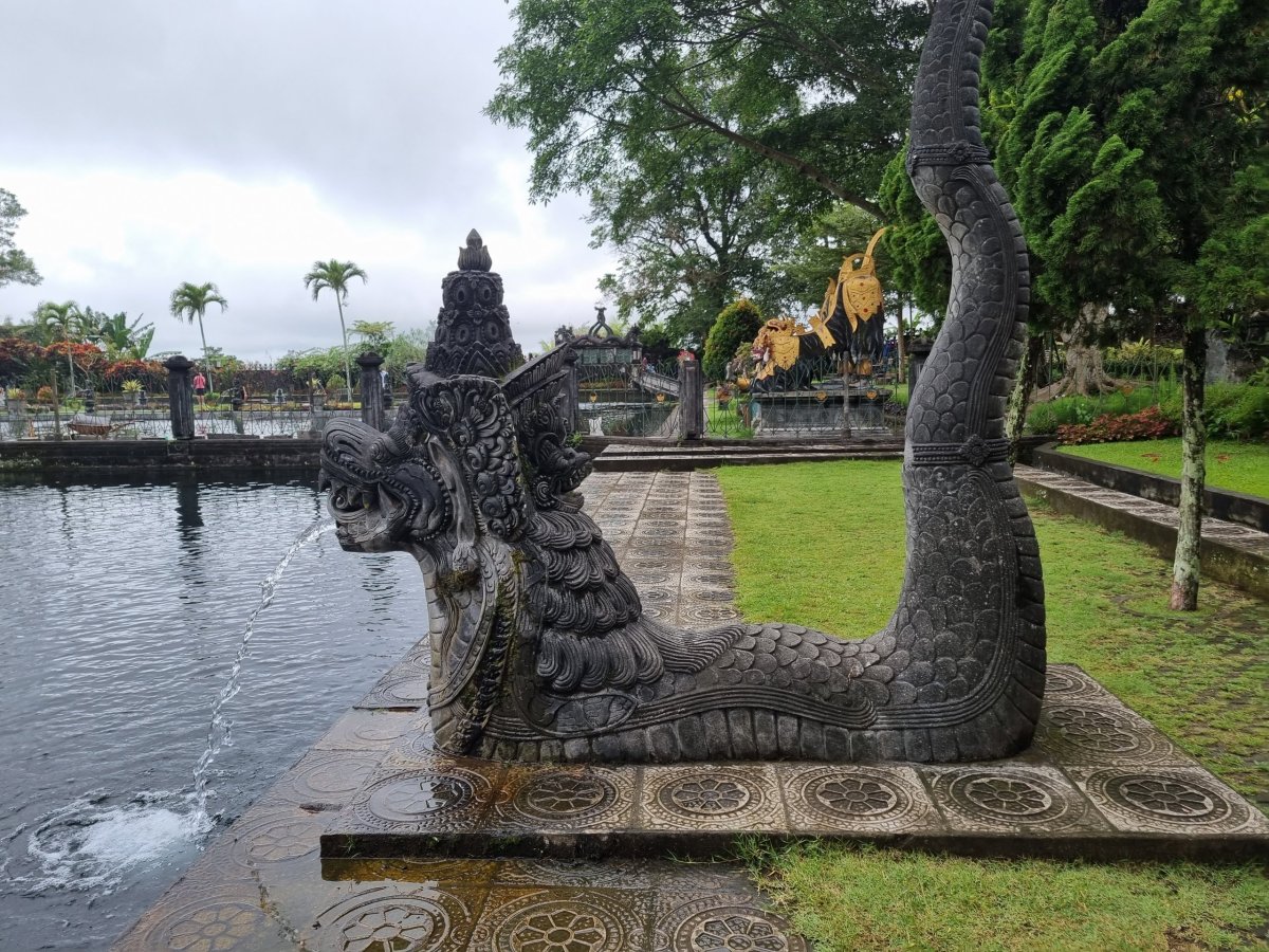Odpoledne se trochu začal zvedat vítr a nebe se zatáhlo, tak jsme se pomalu vydali na další cestu. Mířili jsme ke druhému vodnímu paláci Tirta Ganga, který je už blízko našeho hotelu. Cestou zpět do kopců se nebe víc a víc kabonilo, ale nepršelo. Tirta Ganga je také moc hezké místo, když člověk počkal, tak se trefil do chvilky, kdy odešla jedna vlna turistů a druhá ještě nedorazila. Všeobecně je toto místo již dost turistické. Při cestě zpět na hotel na nás zase vykoukly rýžová políčka. Kupodivu po návratu na hotel se umoudřilo i sluníčko a recepční říkala, že dnes nepršelo.