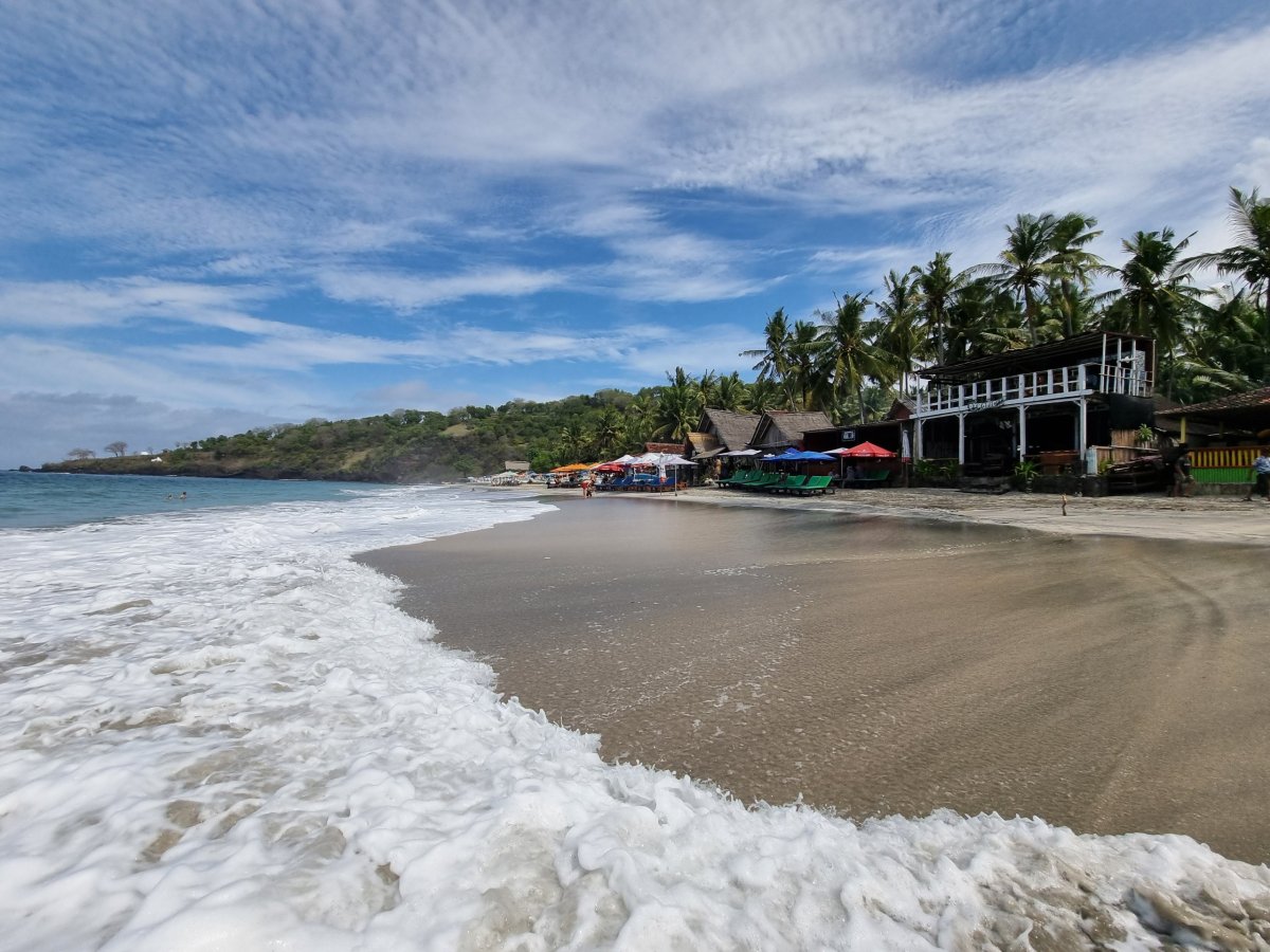 Lilo celou noc. Chtěli jsme jet prozkoumat pobřeží na druhé straně a tam to opět vypadalo, že by pršet nemuselo. Jakmile jsme poodjeli o cca 5 km, přestalo pršet. Sundali jsme pláštěnky, načepovali benzín od paní z lahve a zaparkovali u Taman Ujung – vodního paláce. Slunce pálilo, bylo nám horko. Prošli jsme celé zahrady, lidí bylo pomálu, pěkný výhled. Schytala jsem zde první a poslední komáří štípance na Bali. Potom jsme pokračovali na Virgin Beach, počasí pořád přálo. Parkování společně se vstupným 10 000 IDR na motorku. Virgin Beach má být jediná pláž s bílým pískem na Bali, ale podle mě spíše jen jediná v této oblasti. Ve vzdálenějších místech se také dají najít, ale k tomu už později. Jedná se o zátoku, ke které se dá dostat dvěma cestami. Písek není čistě bílý, spíš šedobílý. Ale na kráse této zátoky to nic neubírá. Je to místo, o kterém moc turistů neví. Proto není dokonalé, moře sem tam vyplaví nějaký odpadek. Provozovatelé místních warungů se ale snaží pláž průběžně poklízet. Zde také platí, že když si člověk dá něco k pití nebo k jídlu, může využívat lehátka a slunečníky zdarma. Moře bylo trochu bouřlivější, ale když si na vlny člověk zvykl, byla v nich legrace a když přešel místo, kde se lámou, dalo se krásně zaplavat. Voda měla mnohem hezčí barvu než v Amedu. Dali jsme si čerstvou grilovanou rybu se zeleninou, nějaké freše a pivo. Jídlo bylo vynikající a za dobrou cenu, a dokonce jsme viděli rybáře, který do warungů nosí, co zrovna ulovil. Takže vše 100% čerstvé a místní. K dispozici jsme také měli WC se sprchou a převlékárnu v takové boudě se střechou z vlnitého plechu. Pan majitel velice milý, ale nevtíravý. Člověk si připadal jako na návštěvě u místních.