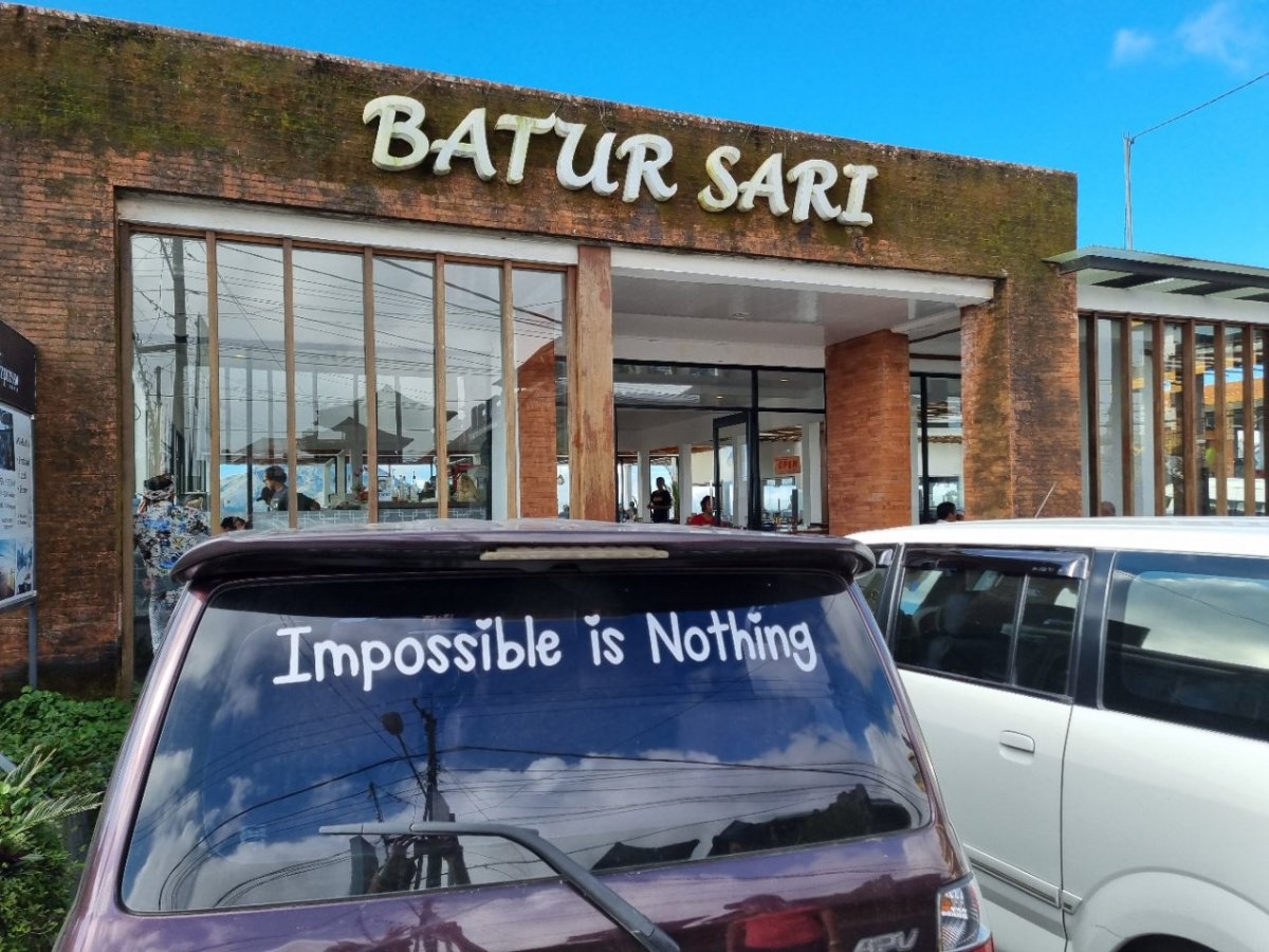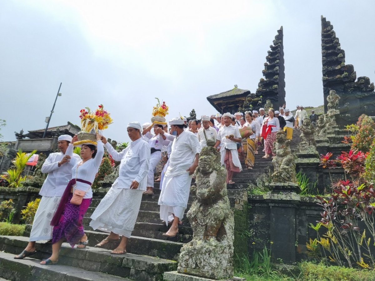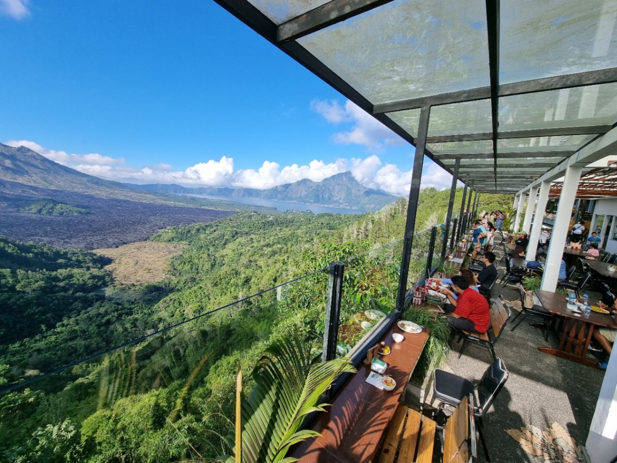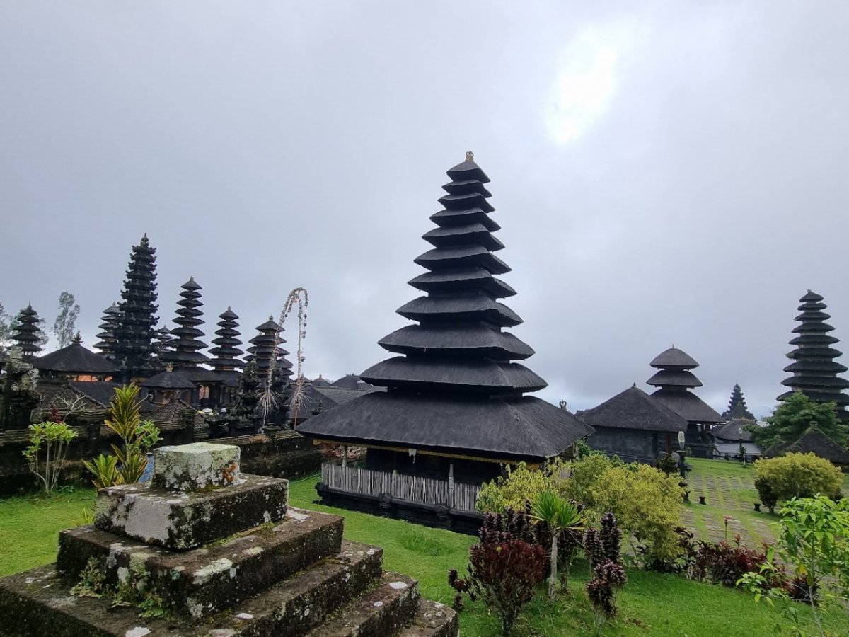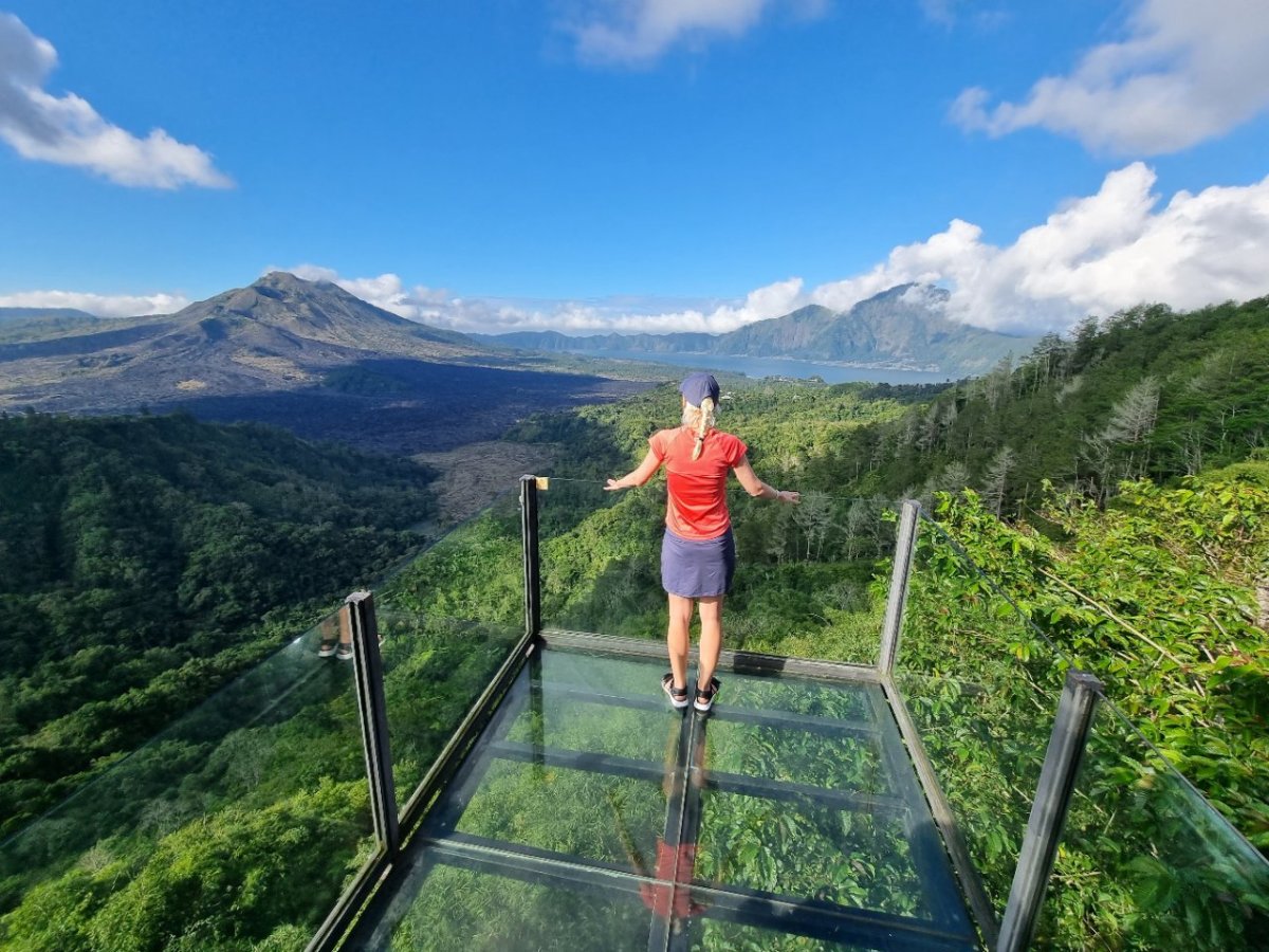 První zastávka byla chrám Besakih, údajně největší chrámový komplex na ostrově. No podle našeho názoru jsou chrámy na Bali celkem hezké, ale chrámy např. ve Vietnamu byly krásnější, barevnější. Tady na nás působili smutně, neučesaně, byl tam nepořádek. V Besakihu jsme objevili pána, který nám udělal fotku se zrcátkem, o kterou jsme přišli v Lempuyangu, tak jsme měli radost. Také se nám poštěstilo vidět průvod věřících, který za hlasitého zpěvu vycházel zprostředka chrámu, kam mají turisté zákaz vstupu. Všichni v bílém, na hlavách koše s ovocem. Moc působivé. Atmosféru tomu všemu dodávalo i počasí, bylo dost pod mrakem a chvílemi i drobný déšť. V chrámovém komplexu jsme strávili asi dvě hodiny a pak se vydali na další cca hodinovou cestu k jezeru Batur – největšímu jezeru na Bali u sopky Batur a jeho přilehlému chrámu. Po cestě jsme se na doporučení Gedeho zastavili na pozdní oběd v restauraci, která byla postavena, stejně jako další restaurace okolo ní, přímo na skále naproti sopce Batur nad stejnojmenným jezerem. Mají tam i takové prosklené balkóny, kde se člověk může vyfotit s nádherným výhledem v pozadí. Tady se počasí úplně změnilo. Teplota i vzdušná vlhkost o dost poklesla, cca na 20 stupňů ve stínu, bylo větrno a jasno. Vzdych byl úplně průzračný, skvělá viditelnost. Servírka nám říkala, že máme veliké štěstí na počasí, že dnes je po dlouhé době krásně a neprší. Po bufetovém obědě jsme popojeli k chrámu Batur, kde jsme zažili první a poslední pocit, že se nás snaží někdo okrást a bylo to opravdu divné. Ve zkratce se nám snažili vnutit k odkupu sarong, který ale vždy má být v ceně vstupného, nejdříve za 100 000, pak za 10 000 a pak že půjčit za peníze a nakonec zadarmo. Následně jsem zjistila, že mám otevřenou ledvinku, ale naštěstí nic nezmizelo. Chrám byl fotogenický, ale zase takový jednobarevný, smutný, bordýlek. Vzadu byl i pěkný výhled na sopku Batur.
