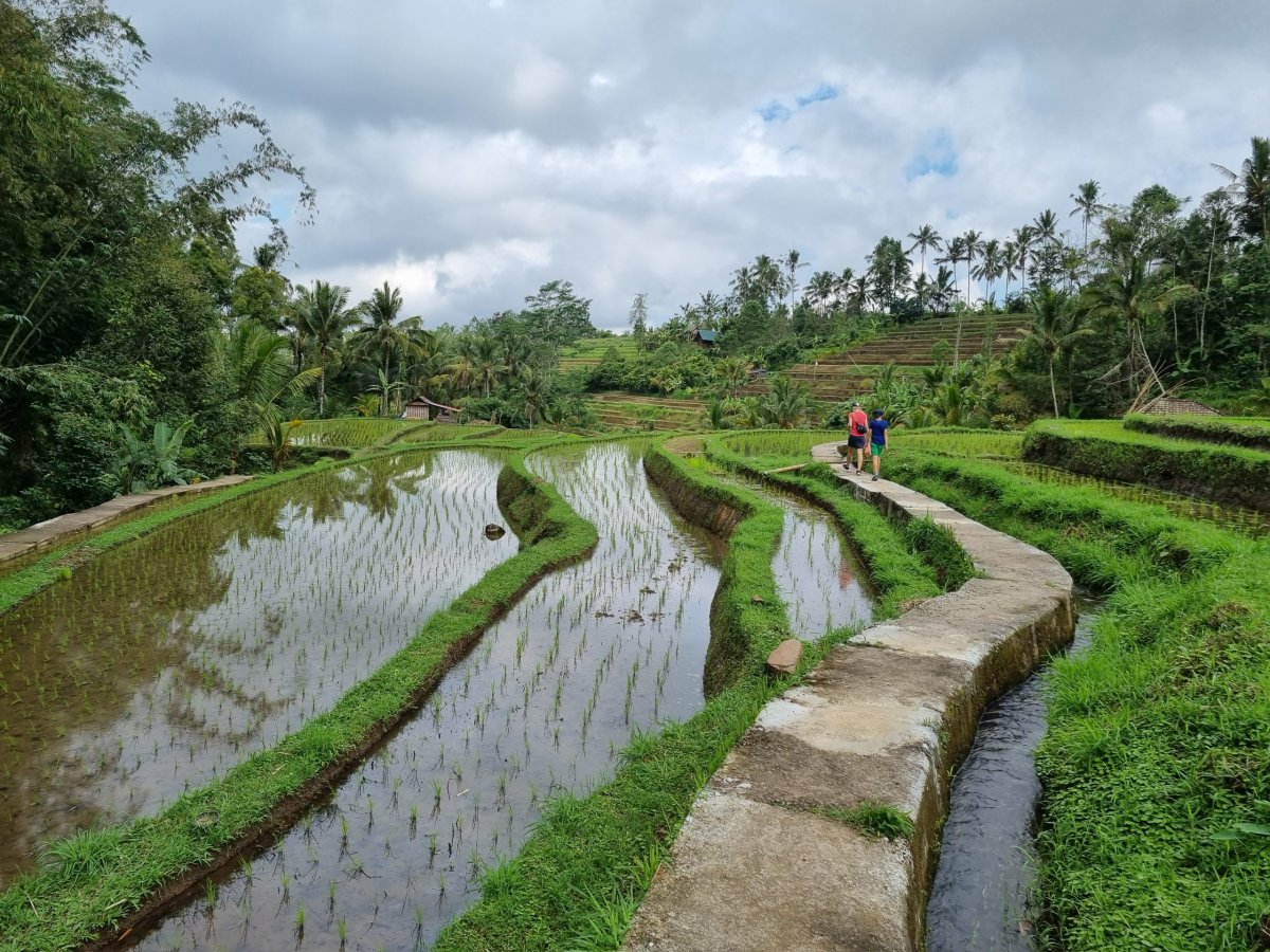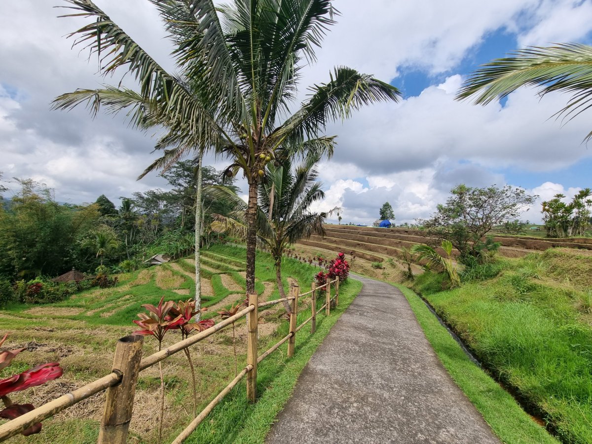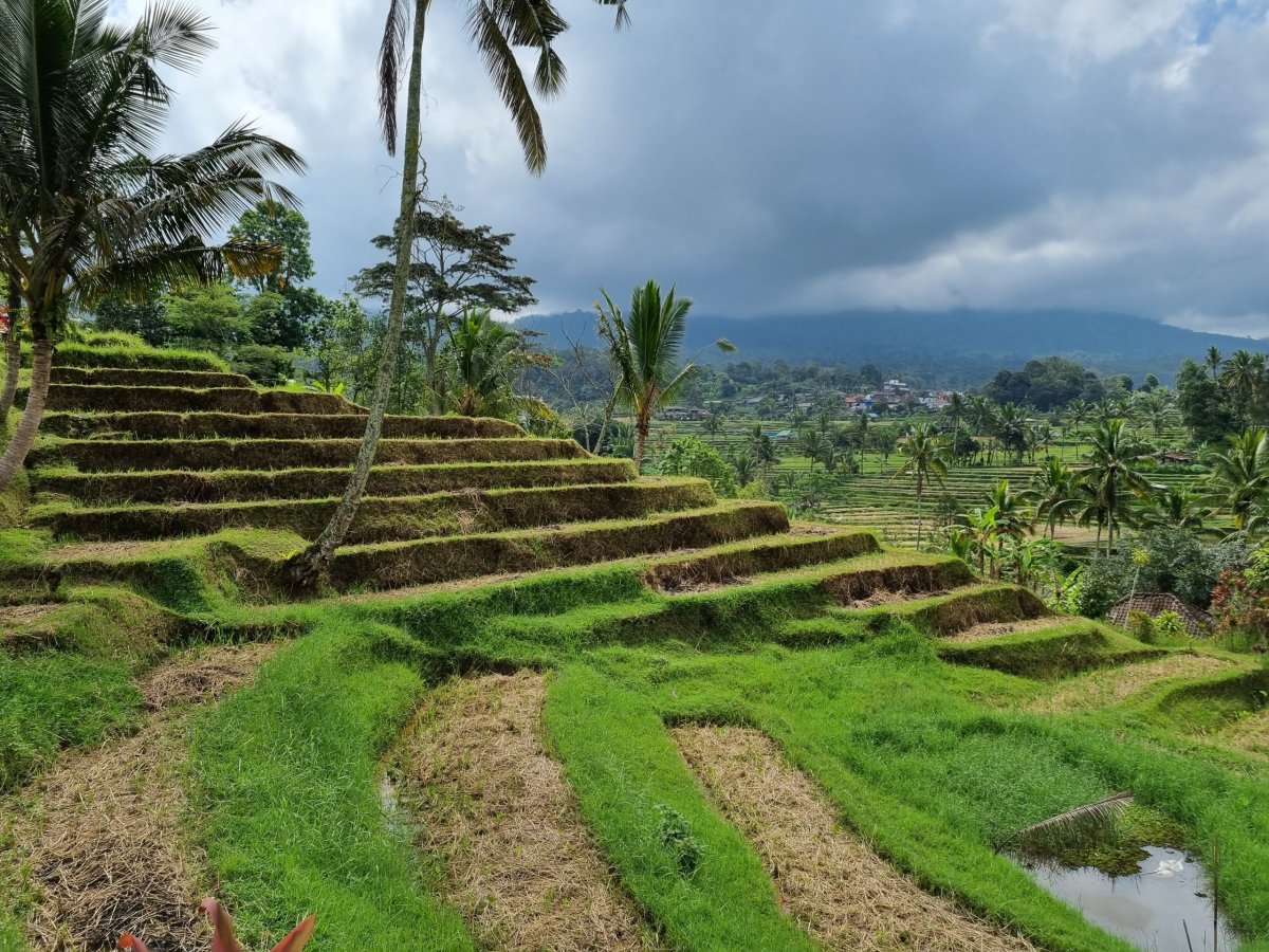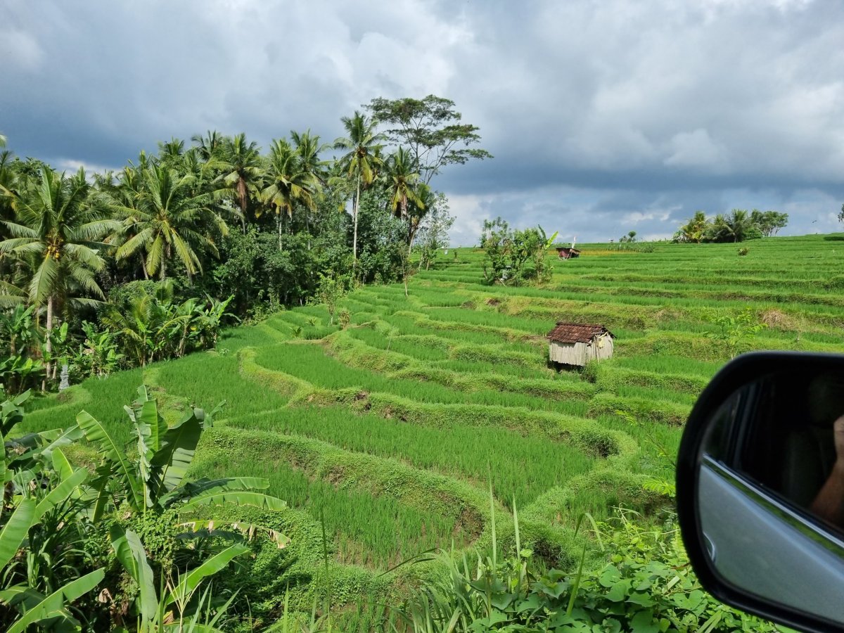 Ráno dne č. 10 jsme po snídani sbalili věci. Řidič nám nedočkavě psal, že je už na parkovišti a čeká na nás – ale to jsme ještě vůbec netušili… 😊Plán byl přemístit se z ubytování A do ubytování B a po cestě udělat dvě až tři zastávky na pamětihodnosti po cestě – ALE náš řidič to jaksi nedokázal pochopit. Prý mu jeho šéf řekl, že nás má jen přemístit z ubytování A do ubytování B. Jeli jsme asi 40 minut do bodu, kde jsme měli odbočovat z hlavní silnice k rýžovým terasám. Jelikož jsme na původní domluvě trvali, ale řidič nechtěl ustoupit, zastavili jsme a asi hodinu jsme čekali na druhého řidiče, který pro nás měl přijet z Munduku a tu naší „okružní jízdu“ si převzít. Celkově tu platí, že když mají balijci něco složitějšího vyřešit, hrozně to zkomplikují a čas běží a běží…nakonec jsme se ale náhradního řidiče přeci jen dočkali a vyrazili na rýžové terasy Jatiluwih. A byli jsme okouzleni! V podstatě nejde jen o několik teras, ale o celou oblast na svahu hory. Nahoře v kopcích se držely tmavé mraky, nad hlavami nám svítilo slunce a v kombinaci s těmi mraky vytvářelo kouzelný opar a dole v údolí bylo vidět až k moři. Všude kolem nás políčka, zemědělci, neuvěřitelné výhledy! Tisíckrát krásnější než terasy Tegallang u Ubudu, mnohem méně lidí, mnohem více prostoru. Jsou tu značené stezky podle toho, kolik máte času. Vybrali jsme si cca čtyřkilometrovou. Vypustili drona, za kterého si hned přiběhla paní vybrat poplatek a užívali jsme si tu nádheru. U výstupu zpět na parkoviště už nás vyhlížel náš nový řidič Putu a pokračovalo se přes Balijský venkov dál v cestě.