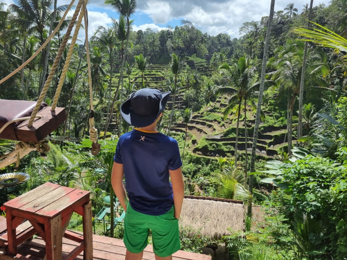 Nebudu zdržovat detaily o letu, že jsem čekala od Singapore Airlines víc, protože nakonec je nedůležitější, že oba lety proběhly v pořádku na čas, že pasová kontrola a vystavení vstupních víz bylo rychlejší, než jsem čekala, a náš řidič byl na místě, jak slíbil. Nebyl moc mluvný a ani moc neuměl anglicky, ale ve finále to také nebylo důležité, protože Tomík mohl aspoň většinu naší cesty prospat. Počasí, na to, že jsme přiletěli v období sucha, nebylo nic moc. Teplota okolo 20ti stupňů, pod mrakem, občas malý deštík. Zeptala jsem se řidiče, jaké tu mají teď počasí a jeho odpověď mě moc nepotěšila: prý tak, jak je dnes, občas déšť. Člověka tato informace po téměř dvacetihodinovém letu opravdu nenadchne, obzvlášť když ví, že u nás jsou tropické třicítky. Co ale nadělá, že ano. Když jsme se blížili k našemu prvnímu hotelu (Palmterrace Bali), mezi mraky na chvilku vykouklo sluníčko a na malý moment osvítilo rýžová políčka, která se nám zrovna ukázala po pravé straně mezi stromy. Celé svahy políček. Byl to nádherný pohled a po našich dalších cestách po Bali nás pak tyto výhledy pronásledovaly téměř všude.