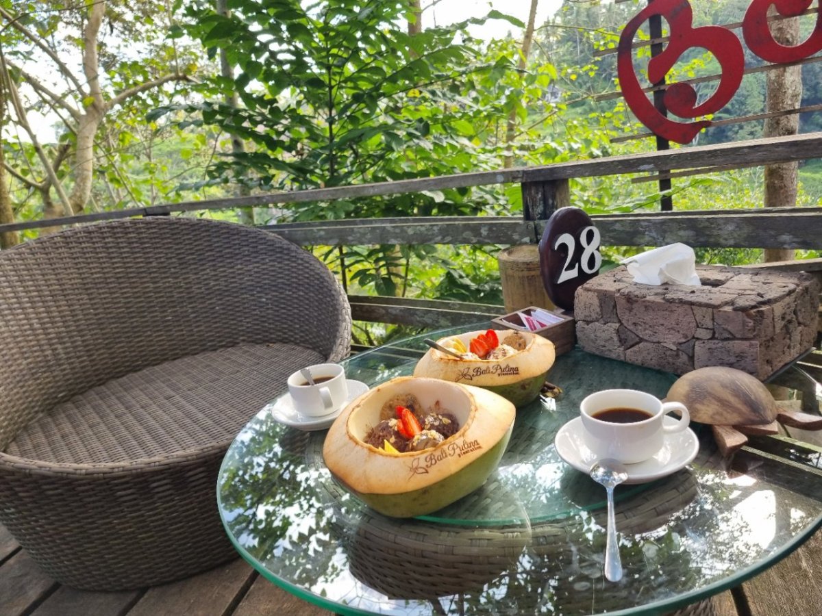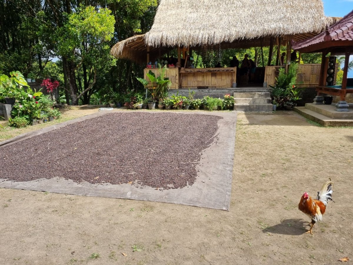Další den na nás po snídani čekal řidič, který nás odvezl do Ubudu, kde jsme měli domluvené další půjčení motorek. Pán z půjčovny se jmenoval Denik a společně s manželkou pronajímají turistům stroje, o které se sami starají. Vtipné bylo, že na obou motorkách byly zepředu připevněné obětiny bohům, aby nás ochránily před nebezpečím po cestě. Počasí bylo hezké, sluníčko svítilo, chvílemi až horko. Projeli jsme přes Ubud k rýžovým terasám Tegallang a po cestě vybrali nějaký ten milion v bankomatu. Zaparkovali jsme na jednom z hlavních parkovišť dál po cestě, abychom nešli dovnitř hlavním vchodem s největšími davy. Po zaplacení vstupného jsme prošli skrz restauraci, která byla postavená nahoře u hlavní silnice. Terasy se pak vinou dolů do údolí. Restaurace má na této straně teras taková pěkná místečka – altánky, kde si člověk může sednout do stínu, kochat se výhledem do údolí na tu zelenající se nádheru a dát si cibetkovou kávu, nějaký freš (avokádový) za dobrý peníz. Tato restaurace nás moc mile překvapila. Prozkoumali jsme obě strany teras, vypustili drona a nastříleli fotečky. Pak jsme na motorkách popojeli kousek výš po silnici, kde jsme našli skvělou restauraci také na svahu s výhledem na terasy a dali si pozdní oběd. Dalším bodem dnešního dne byla kávová farma Bali Pulina. Zde je vstup zdarma, ihned se člověka u vchodu ujme zamestnankyně, ukáže cibetky, celý proces výroby kávy a také koření, které jim zde roste a s jehož pomocí ochucují kávu. Poté nás paní zavedla ke stolům, které jsou různě rozeseté z kopce v džungli a přinesla menu. Dali jsme si cibetkovou kávu a dvě zmrzliny ve skořápce z kokosového ořechu: vanilkovou a čokoládovou. Pecka!