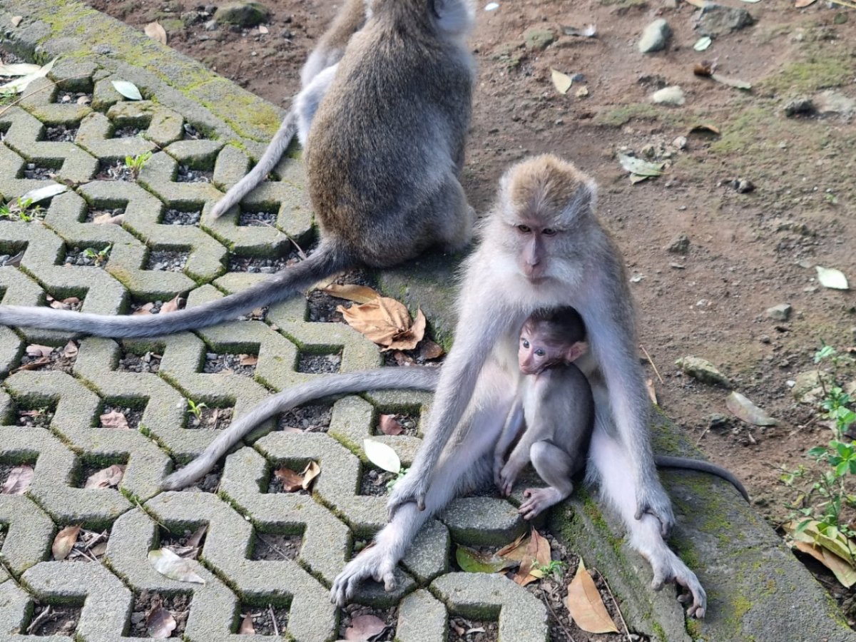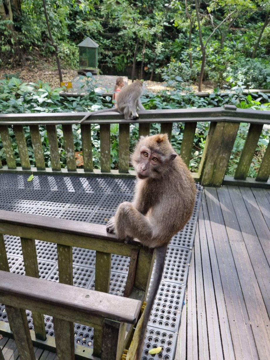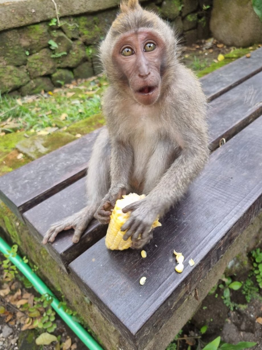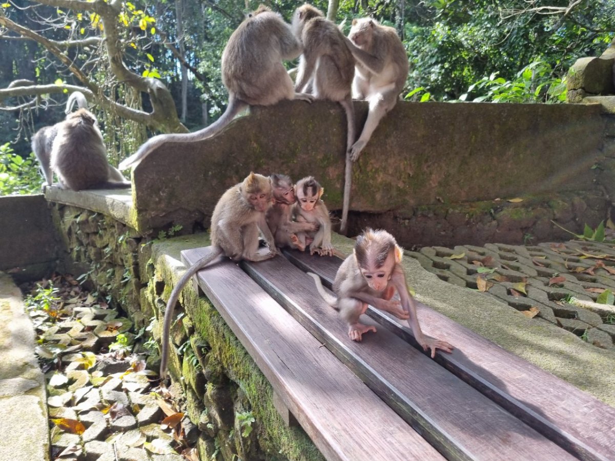 Tento den byl ve znamení stěhování o cca 20 km níže do Ubudu. Nejdříve jsme přemýšleli, že si zaplatíme řidiče, aby nám odvezl autem věci a my si odvezeme na nový hotel motorky, ale nakonec jsme se rozhodli po včerejší průzkumnické výpravě do Ubudu, že to zvládneme sami na motorkách. Nahodili jsme co nejvíc věcí do úložných prostorů pod sedadly, dvě krosny na záda, třetí dopředu na háček mezi nohy na vnitřní stranu řídítek a vyrazili jsme. Prakticky se totiž jelo pořád rovně mírně z kopce a našli jsme to dobře. Naše další ubytování se jmenovalo Devi´s Place a jednalo se o samostatné celé domy. Měli jsme zamluvený dům se dvěma ložnicemi a soukromým bazénem. Byl tam pod střechou i venkovní obývák, kuchyň, jídelna, dvě koupelny – opravdu krásné a luxusní. Snídani nám chodili vždy ráno udělat přímo k nám do kuchyně dle naší objednávky přes wassup, kterou jsme vždy poslali předchozí večer. Člověk si připadal jako král, zvykla bych si 😊. Prohlédli jsme si náš domeček, vybalili věci, a vyrazili k našemu dnešnímu cíli: Monkey forest. Jedná se o rozsáhlý park ve středu s chrámem, kde jsou vybudované různé chodníčky a kde bydlí velké množství makaků. Jsou zvyklí na lidi, takže skvěle pózují, a jsou i pěkně drzí, takže pozor na věci. Když je člověk nechá, vylezou mu doslova až na hlavu. Nejdříve jsem se bála, že by nás mohli nedejbože škrábnout, ale kluci si setkání s nimi užívali a nechali je, aby po nich doslova šplhali. Monkey forest je hodně turistické místo a příjezdová cesta je, řekněme, zajímavá (na některých místech dost úzké silnice, hustá doprava, chvílemi kolony), ale určitě nelituji, že jsme tam byli. Takhle blízko jsme se pak už k opičkám nepřiblížili. Náročný den jsme zakončili úžasnou masáží a dobrou večeří v centru Ubudu.