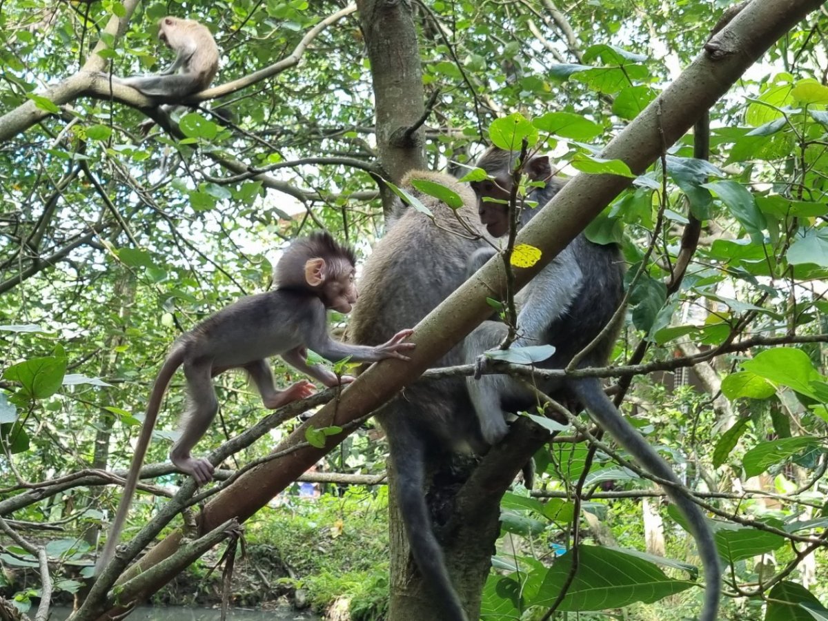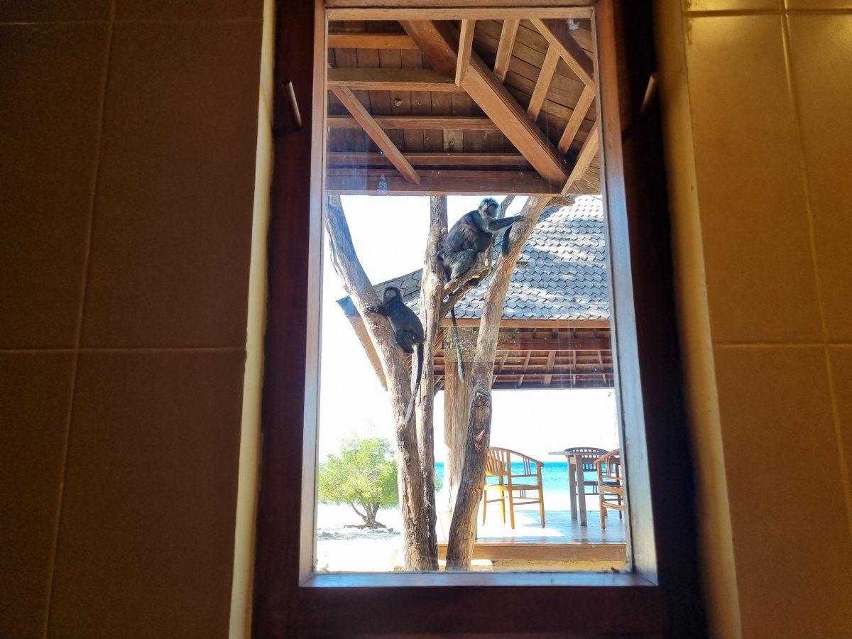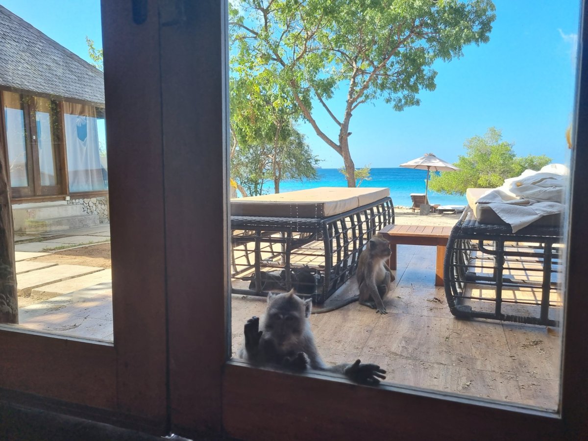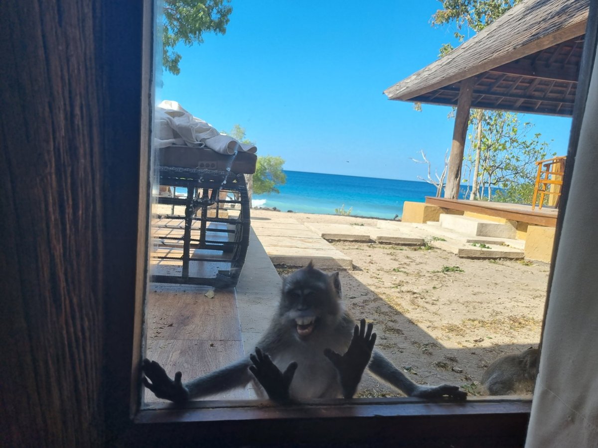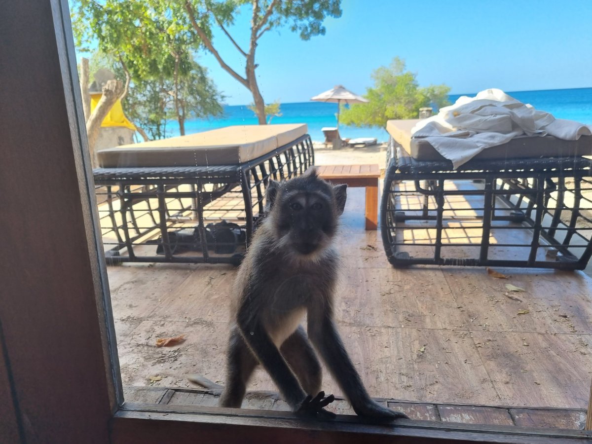 Po návratu do bungalowu jsme si chtěli chvilku odpočinout ve stínu, protože manžel měl z houpání na vodě slabší mořskou nemoc a bylo kolem poledního, opravdu vedro k zalknutí. Na nebi ani jeden mráček. Když je příliv, je tady moře neuvěřitelné, úplně jako z katalogu. Bílý písek, blankytná voda, v dálce balijské kopce. Když jsme si šli zaplavat, byli jsme na celé pláži zase úplně sami, jen my, opice a určitě někde schovaní jeleni. Viděli jsme totiž u pítka na naší zahradě stopy kopýtek. Když jsme si šli dát „afternoon cofee/tea“, předobjednali jsme si rovnou pizzu a nasi goreng na večeři. Říkali jsme si, kde je ten druhý druh opic, o kterém mluvila paní recepční včera: „black monkeys“ mají prý být vegetariáni a velice roztomilí (jedná se o hulmana jávského). A hle, zrovna si před námi na stromě vegetí celá skupinka! Jak jsou černí, jsou špatně viditelní. Nejhezčí z nich jsou bez pochyby mláďátka – jsou totiž zrzavá. Zrovna si to šinuli na naší zahradu k ovocnému stromu. Vyhnali makaky a začali si pochutnávat. Přiblížit se k nim člověk úplně nemůže, pořád jsou to divoká zvířata, ale jsou opravdu velmi roztomilá. Stejně jako makakové se pak na noc vydali do lesíka hned vedle našeho bungalowu a všechny postupně po jedné vyšplhali na strom hned u okna z naší koupelny a přes naší střechu si to pelášili do lesa.