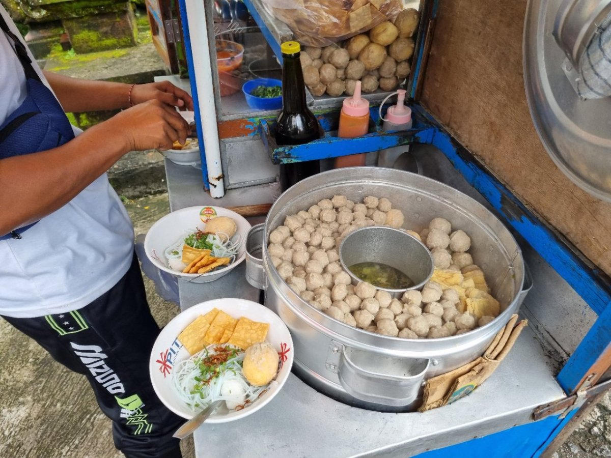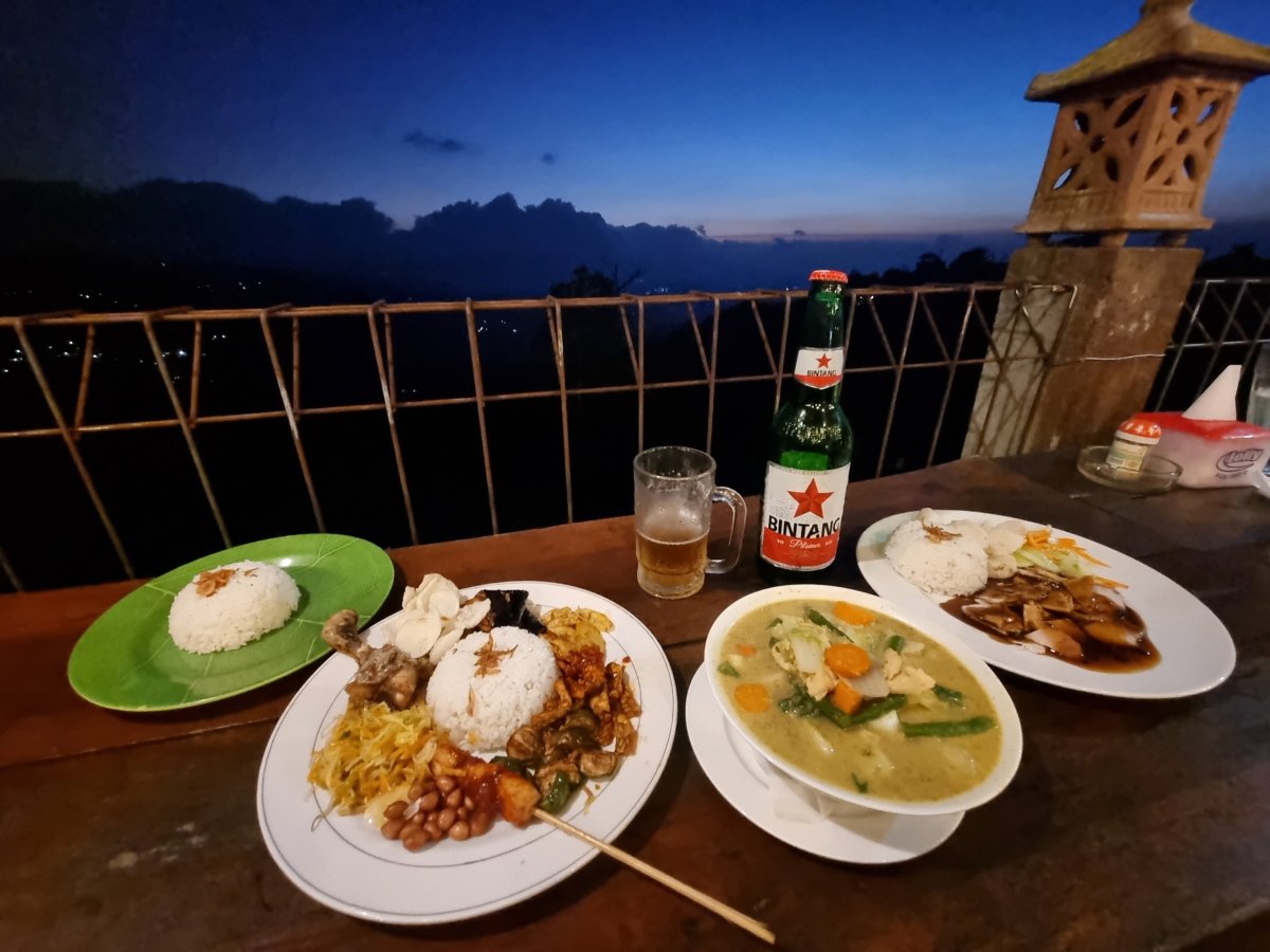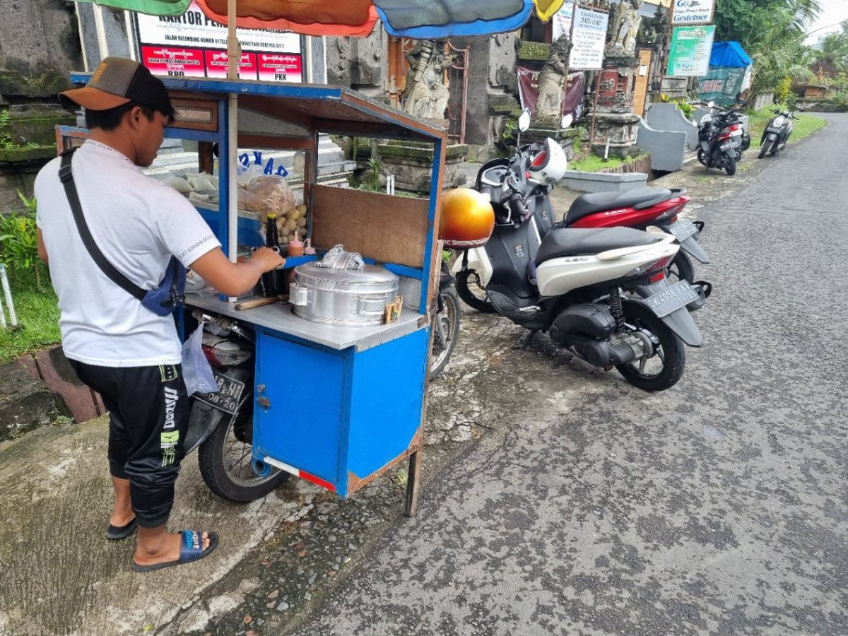Po občerstvení jsme se chtěli vrátit přes vesničky zpět nejkratší cestou na ubytování. Z ničeho nic jsme se objevili na okreskách, asfaltkách uprostřed lesů. Různě se stáčely ze svahů a do svahů, mezi stromy prosvítalo slunce. Míjeli jsme vesničky, mávaly nám děti a volali „Hello“. V jedné vesnici, podél které se po celé délce táhl chrámový komplex, parkovala paní s motorkou, na které měla připevněné várnice a stoleček a prodávala nějaké jídlo místním do pytlíčku za 10 000 IDR. Zařadili jsme se za nakupující vesničany a sledovali, co jim tam balí a kolik platí. Byla to polévka s nudlemi a knedlíčky. Neváhali jsme a nechali si také zabalit. Pytlíčky jsem zavěsila na háček na motorce, nasedli jsme a pokračovali balijským venkovem podle navigace dál. Na jedné křižovatce se silnice, po které jsme měli podle navigace jet, stáčela mimo asfaltovou cestu na štěrkovou cestu do lesa. Váhali jsme, jestli se tudy opravdu vydat, a v tu chvíli po této štěrkovce přijížděli místní a volali na nás, ať tudy určitě nejezdíme. Říkali, že je po deštích v minulých dnes cesta rozbitá a že se tudy nedá projet. Byli moc milí a ukazovali nám na naší navigaci, kudy to musíme objet. Začínala jsem být nervózní, protože slunce už zapadalo a objížďka nám cestu prodloužila o cca 10 km. Snažila jsem se jet rychle, nechtěla jsem řídit po vesničkách v lesích za tmy, to už jsme si tu užili. Některá stoupání do zatáček, pod kterými byl přímý sráz do džungle a ostrá klesání byly adrenalinové, ale nakonec jsme dorazili na hotel těsně před soumrakem.