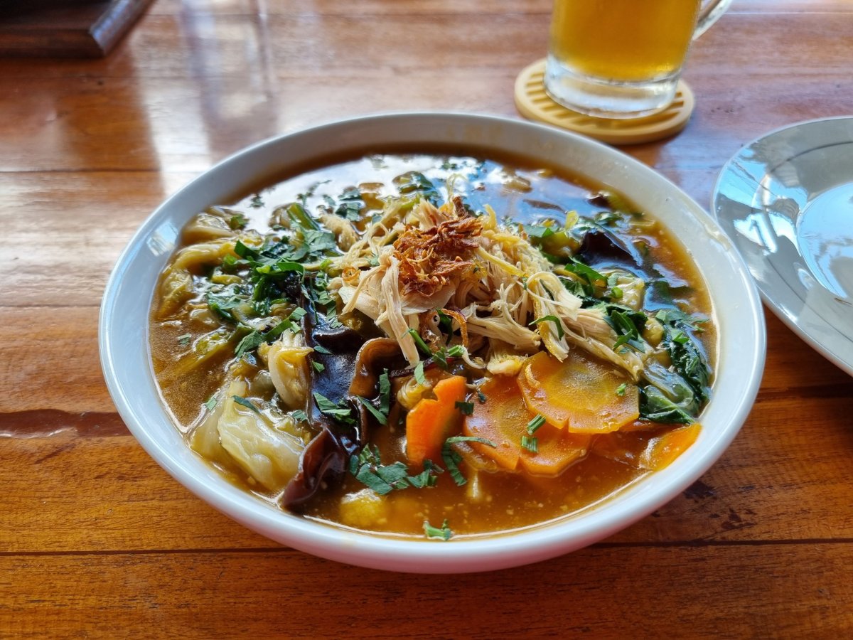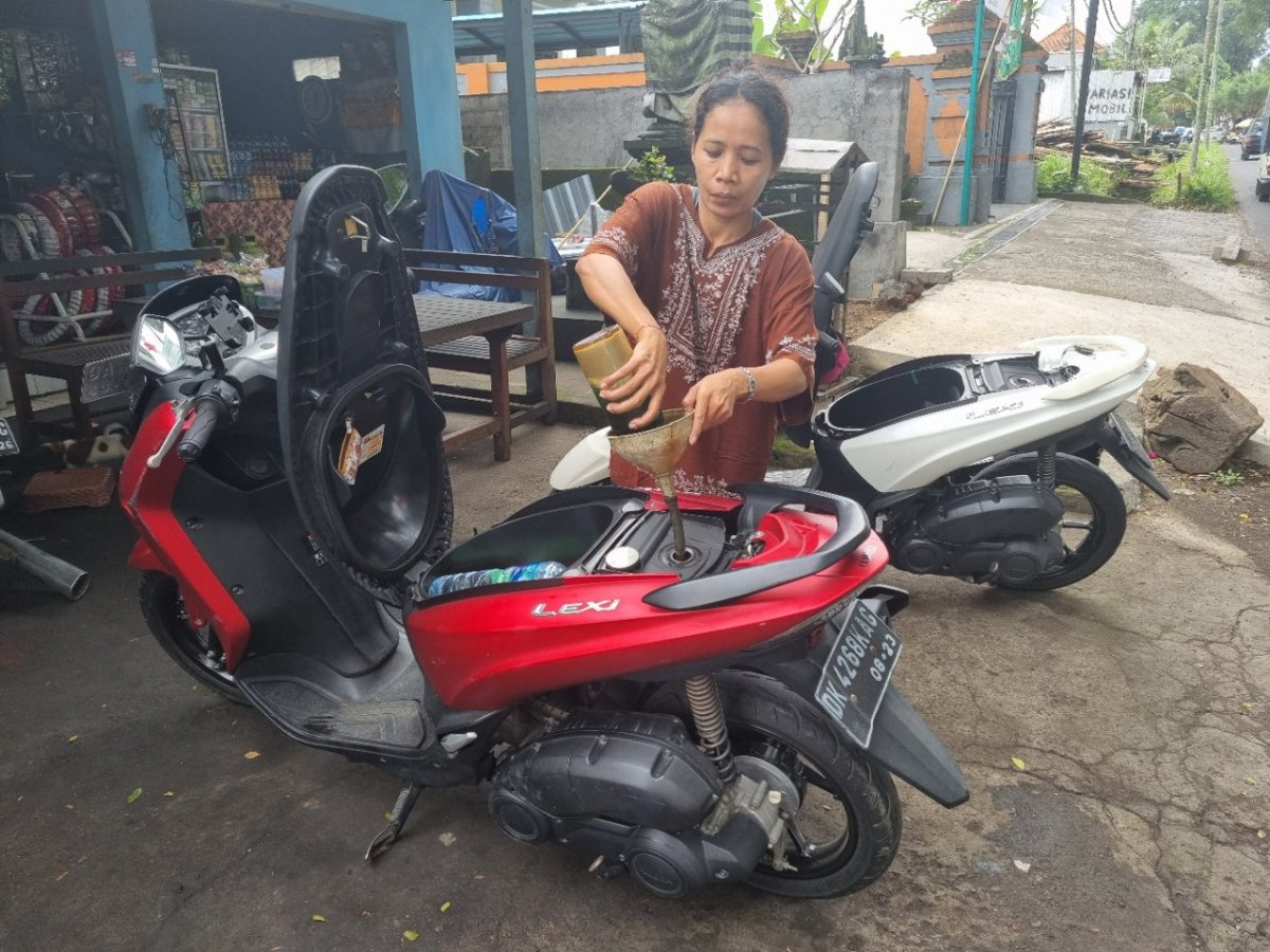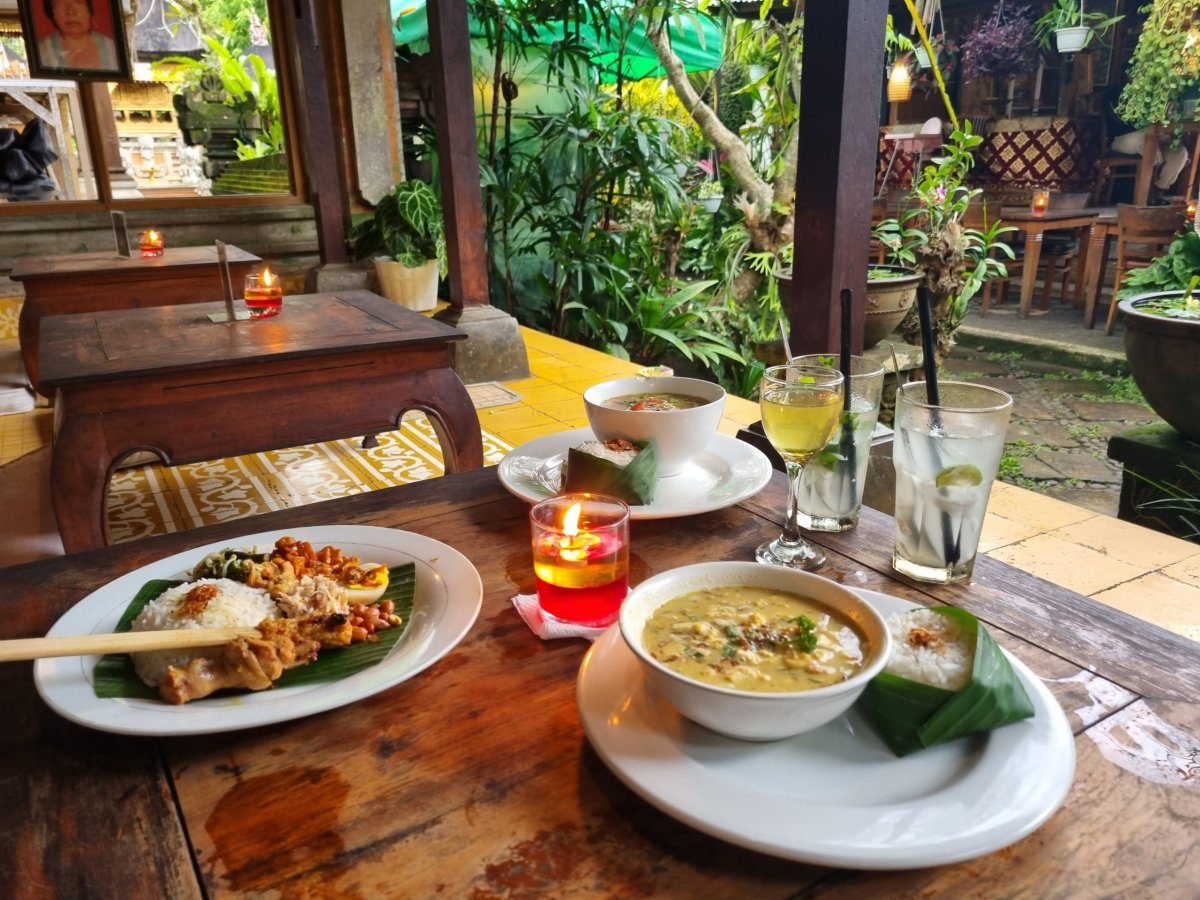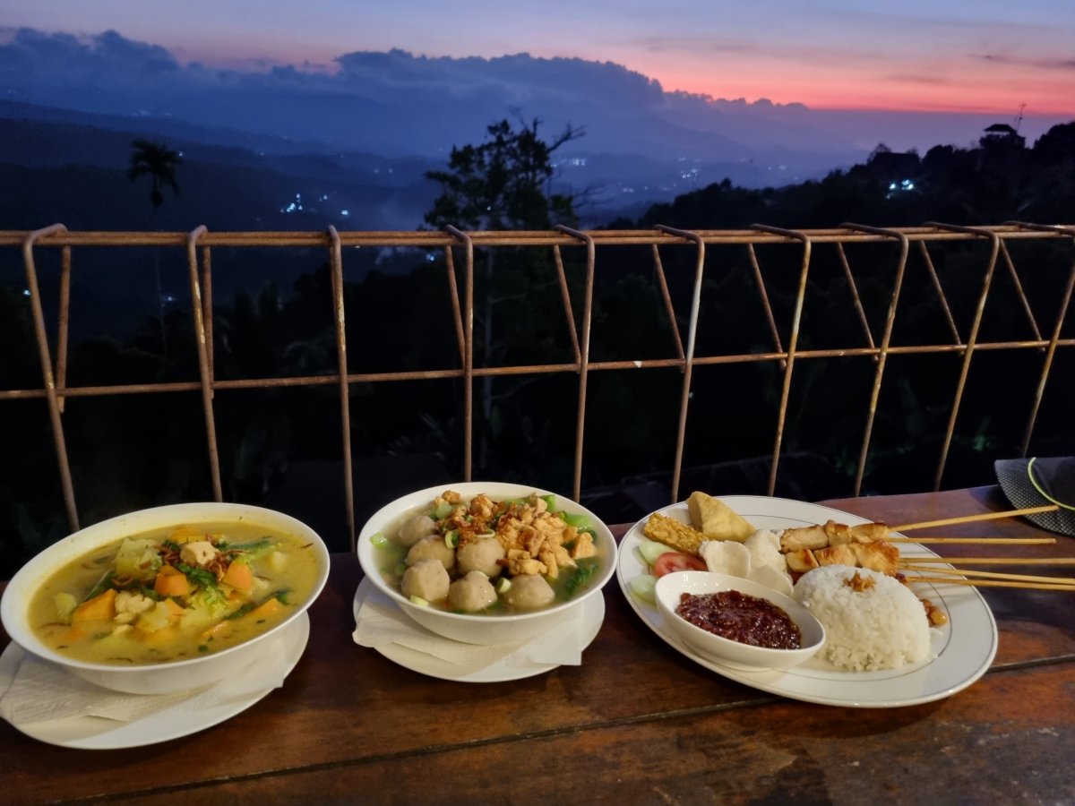 Po občerstvení jsme se chtěli vrátit přes vesničky zpět nejkratší cestou na ubytování. Z ničeho nic jsme se objevili na okreskách, asfaltkách uprostřed lesů. Různě se stáčely ze svahů a do svahů, mezi stromy prosvítalo slunce. Míjeli jsme vesničky, mávaly nám děti a volali „Hello“. V jedné vesnici, podél které se po celé délce táhl chrámový komplex, parkovala paní s motorkou, na které měla připevněné várnice a stoleček a prodávala nějaké jídlo místním do pytlíčku za 10 000 IDR. Zařadili jsme se za nakupující vesničany a sledovali, co jim tam balí a kolik platí. Byla to polévka s nudlemi a knedlíčky. Neváhali jsme a nechali si také zabalit. Pytlíčky jsem zavěsila na háček na motorce, nasedli jsme a pokračovali balijským venkovem podle navigace dál. Na jedné křižovatce se silnice, po které jsme měli podle navigace jet, stáčela mimo asfaltovou cestu na štěrkovou cestu do lesa. Váhali jsme, jestli se tudy opravdu vydat, a v tu chvíli po této štěrkovce přijížděli místní a volali na nás, ať tudy určitě nejezdíme. Říkali, že je po deštích v minulých dnes cesta rozbitá a že se tudy nedá projet. Byli moc milí a ukazovali nám na naší navigaci, kudy to musíme objet. Začínala jsem být nervózní, protože slunce už zapadalo a objížďka nám cestu prodloužila o cca 10 km. Snažila jsem se jet rychle, nechtěla jsem řídit po vesničkách v lesích za tmy, to už jsme si tu užili. Některá stoupání do zatáček, pod kterými byl přímý sráz do džungle a ostrá klesání byly adrenalinové, ale nakonec jsme dorazili na hotel těsně před soumrakem.
