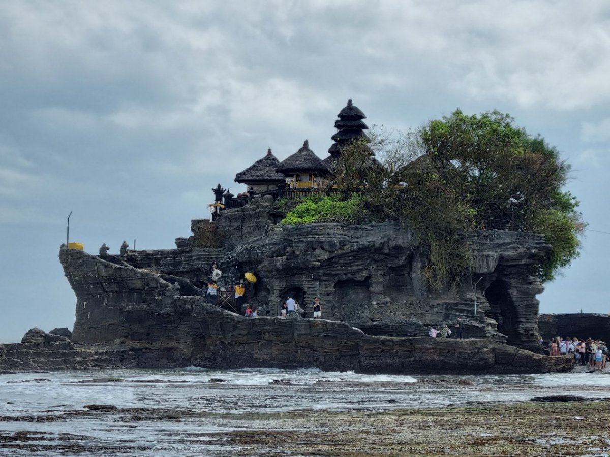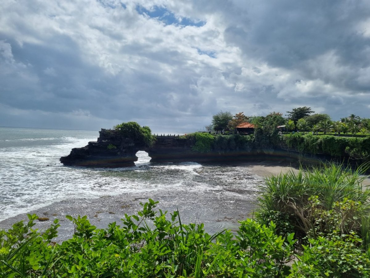 Po snídani, kterou nám přišli připravit k nám do domečku, a po kontrole meteoradaru, jsme zhodnotili, že počasí v Ubudu a okolí dnes nebude nic moc. Rozhodli jsme se zase „ujet dešti“ a vydali jsme se na třicetikilometrovou cestu přes balijské vesnice a vedlejší silnice k chrámu Tanah Lot – ikonickému chrámu na pobřeží, kam se dá dostat suchou nohou jen za odlivu. Po cestě jsme se zastavili na naší starou známou polévku s nudlemi a knedlíčky, opustili jsme zamračené počasí s drobným deštěm a vykouklo na nás zase sluníčko. U chrámu bylo až horko. V areálu jsme se podívali na nabídku suvenýrů a pak zpětně jsme zjistili, že je zde (v podstatě na všech turistických místech) mají mnohem levnější, než v přeceňovaném Ubudu. Měli jsme štěstí a zrovna byl odliv. Mohli jsme se tedy přiblížit až k chrámu na skále, nechali jsme si od mnichů požehnat a prošli si celý areál. Cesty vedou po chodníčkách nad útesy s nádherným výhledem na rozbouřený oceán. Nádherné a opravdu fotogenické místo. Po cestě zpět jsme se zastavili na pozdní oběd v nenápadném warungu u cesty a najedli se všichni tři včetně pití do 100 000 IDR.