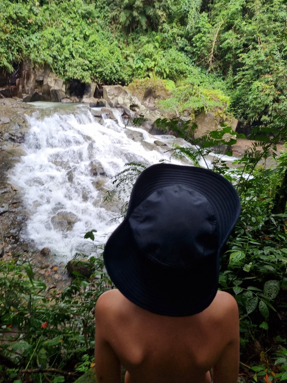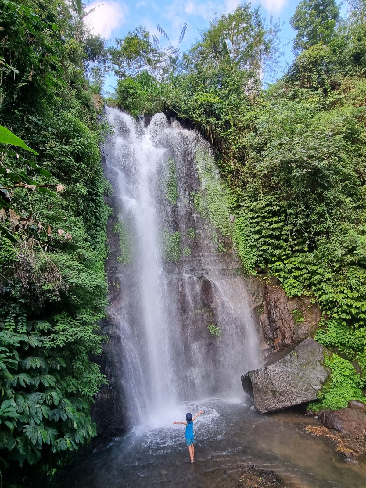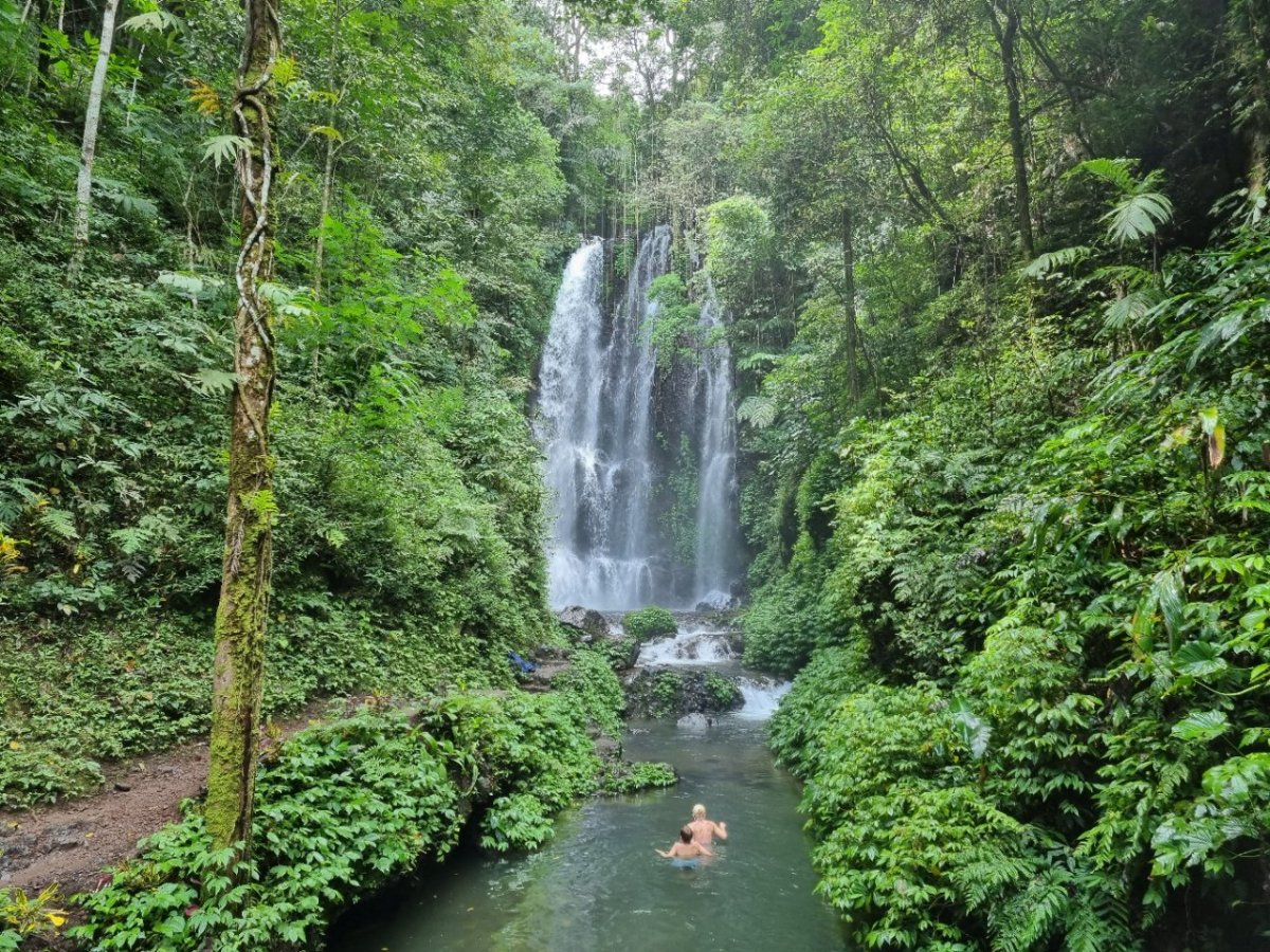 Po probuzení s neuvěřitelným výhledem přímo z postele, báječné snídani a dopoledním relaxu v prázdném bazénu (kde všichni jsou?) jsme si sbalili batohy, koupili v obchůdku dostatek pití a nějaké brambůrky a sušenky a vyrazili na trek. Tento den byl ve znamení courání se místními lesy. Měli jsme naplánovanou trasu dlouhou cca 4,5 km, podél níž jsme měli narazit na čtyři vodopády. Lesy tu jsou dost podobné lesům mírného pásu. Bylo sucho a slunce mělo opravdu sílu. Člověk byl rád za stín stromů. Lidí po cestě jsme potkávali pomálu, spíše individuální turisty. Toto není oblast, kam by se sváželi turisti autobusy – místní infrastruktura by to ani nedovolila. Po necelých dvou kilometrech z kopce jsme dorazili k prvnímu vodopádu Melanting. Vysoký silný proud vody v sedle mezi dvěma kopci ve stínu. Od vodopádu foukal silný vlhký vítr, takže když si člověk k němu stoupl, krásně se ochladil jen tím větrem. Koupat se zde bohužel nedalo, ale i tak to byl super zážitek: uprostřed balijských lesů – jen vy, hukot vodopádu a zvuky lesa. Celé to působilo monstrózně a člověk si připadal úplně malinký. Dále cesta pokračovala po schodech do prudkého kopce, nad nimiž se platil vstup k tomuto vodopádu, většina lidí jsem totiž chodí z druhé strany. Nahoře nad schody byla také taková starší paní, která prodávala u stolečku vodu a banány za dobrý peníz, my samozřejmě nepohrdli. Dalším vodopádem byl Labuan Kebo. Opět jsme zaplatili vstup, a pak šli po schůdkách, ale tentokrát dolů. Tento vodopád vytváří takové jezírko, kde se dá vykoupat. Neváhali jsme, převlékli se do plavek a bot do vody a svlažili se. Byli jsme tam úplně sami. Voda byla ledová a průzračná, zážitek neuvěřitelný. Pak jsme se po schodech vyškrábali zpět nahoru a dali si závitky a polévku a nějaký freš v jednom warungu u cesty. Obsluha byla moc milá, ale kvalita jídla žádný zázrak. Čerstvé bylo vše, ale k závitku dostat kečup a majonézu místo nějaké omáčky nás trochu zarazilo. Pokračovali jsme k vodopádu Red Coral, tady se také koupat nedalo, ale ten proud vody a větru byl také monstrózní. Posledním vodopádem byl Golden Valley – ten nebyl tak jednoduše k nalezení, ale také pěkný a téměř bez lidí. Krajina je tu zvlněná a vodopády jsou tu téměř všude. Vrátili jsme se nazpět stejnou cestou a trochu jsme spěchali, abychom se ještě stihli vykoupat v bazénu a pak mohli sledovat opět západ slunce v naší oblíbené restauci.