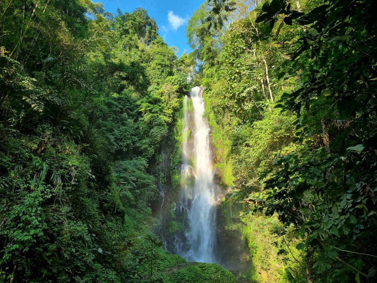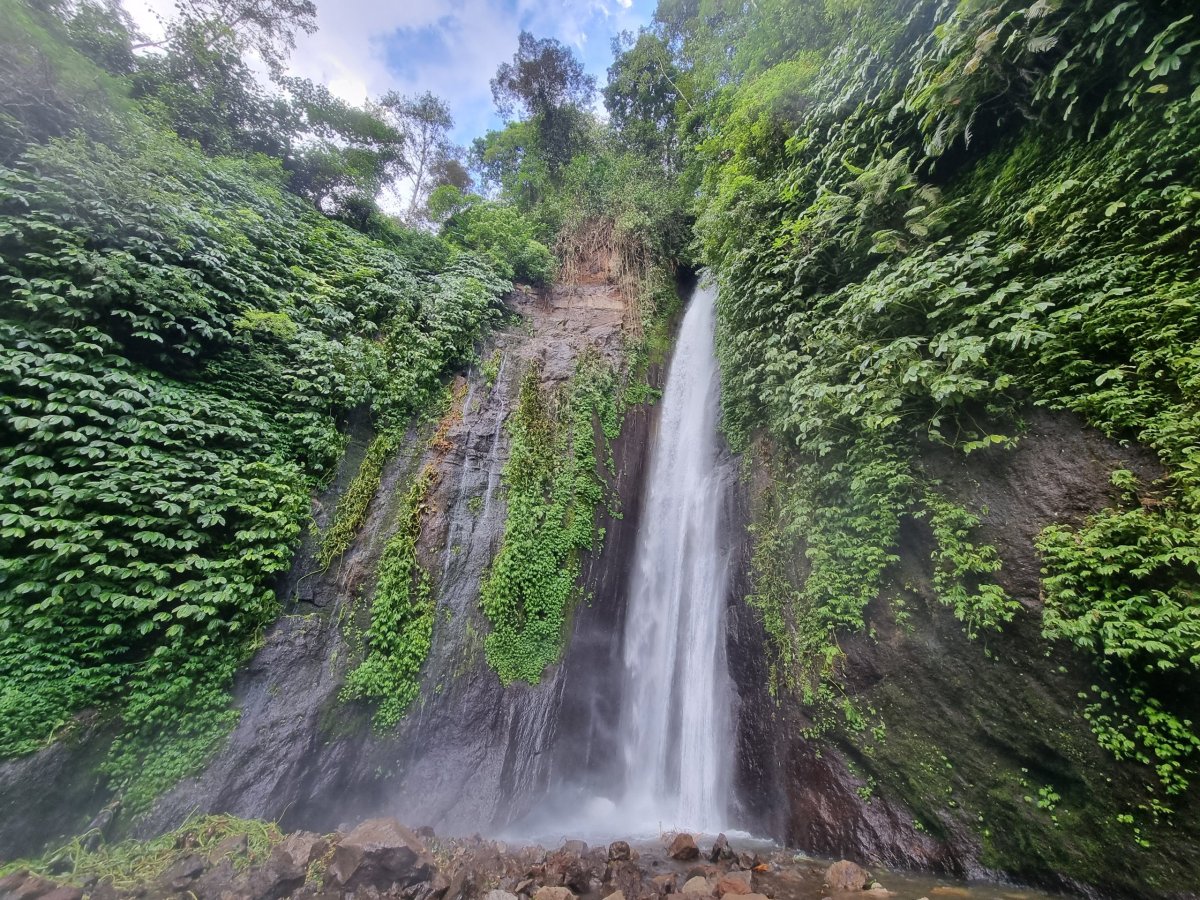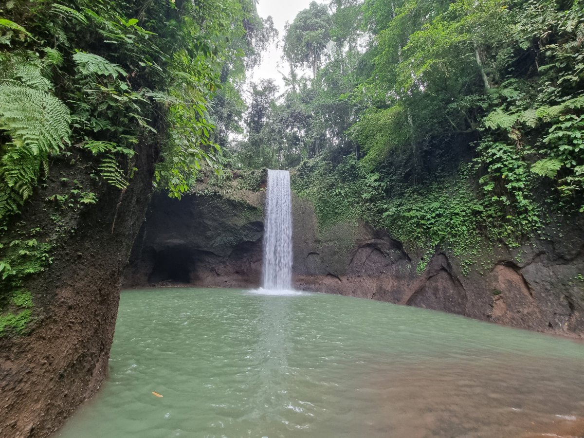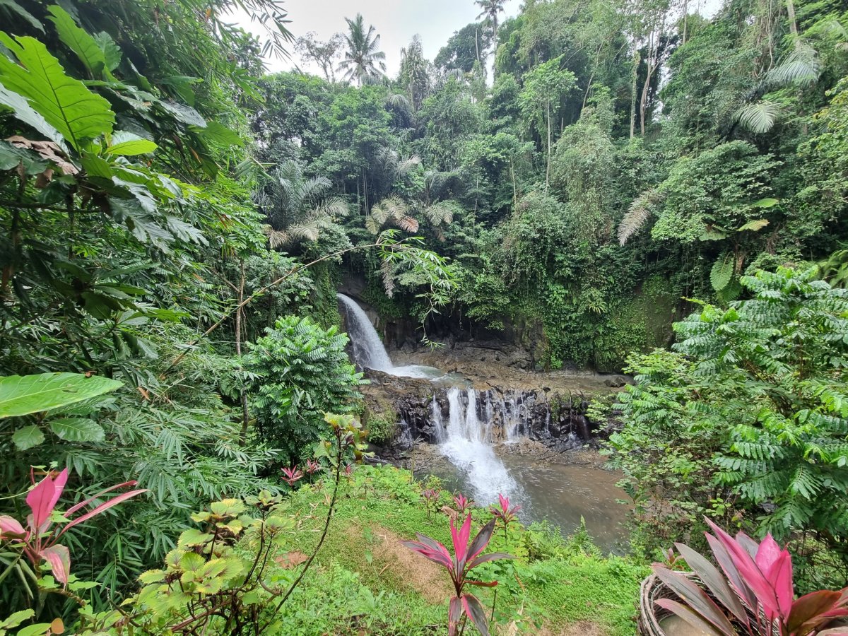 Po probuzení s neuvěřitelným výhledem přímo z postele, báječné snídani a dopoledním relaxu v prázdném bazénu (kde všichni jsou?) jsme si sbalili batohy, koupili v obchůdku dostatek pití a nějaké brambůrky a sušenky a vyrazili na trek. Tento den byl ve znamení courání se místními lesy. Měli jsme naplánovanou trasu dlouhou cca 4,5 km, podél níž jsme měli narazit na čtyři vodopády. Lesy tu jsou dost podobné lesům mírného pásu. Bylo sucho a slunce mělo opravdu sílu. Člověk byl rád za stín stromů. Lidí po cestě jsme potkávali pomálu, spíše individuální turisty. Toto není oblast, kam by se sváželi turisti autobusy – místní infrastruktura by to ani nedovolila. Po necelých dvou kilometrech z kopce jsme dorazili k prvnímu vodopádu Melanting. Vysoký silný proud vody v sedle mezi dvěma kopci ve stínu. Od vodopádu foukal silný vlhký vítr, takže když si člověk k němu stoupl, krásně se ochladil jen tím větrem. Koupat se zde bohužel nedalo, ale i tak to byl super zážitek: uprostřed balijských lesů – jen vy, hukot vodopádu a zvuky lesa. Celé to působilo monstrózně a člověk si připadal úplně malinký. Dále cesta pokračovala po schodech do prudkého kopce, nad nimiž se platil vstup k tomuto vodopádu, většina lidí jsem totiž chodí z druhé strany. Nahoře nad schody byla také taková starší paní, která prodávala u stolečku vodu a banány za dobrý peníz, my samozřejmě nepohrdli. Dalším vodopádem byl Labuan Kebo. Opět jsme zaplatili vstup, a pak šli po schůdkách, ale tentokrát dolů. Tento vodopád vytváří takové jezírko, kde se dá vykoupat. Neváhali jsme, převlékli se do plavek a bot do vody a svlažili se. Byli jsme tam úplně sami. Voda byla ledová a průzračná, zážitek neuvěřitelný. Pak jsme se po schodech vyškrábali zpět nahoru a dali si závitky a polévku a nějaký freš v jednom warungu u cesty. Obsluha byla moc milá, ale kvalita jídla žádný zázrak. Čerstvé bylo vše, ale k závitku dostat kečup a majonézu místo nějaké omáčky nás trochu zarazilo. Pokračovali jsme k vodopádu Red Coral, tady se také koupat nedalo, ale ten proud vody a větru byl také monstrózní. Posledním vodopádem byl Golden Valley – ten nebyl tak jednoduše k nalezení, ale také pěkný a téměř bez lidí. Krajina je tu zvlněná a vodopády jsou tu téměř všude. Vrátili jsme se nazpět stejnou cestou a trochu jsme spěchali, abychom se ještě stihli vykoupat v bazénu a pak mohli sledovat opět západ slunce v naší oblíbené restauci.
