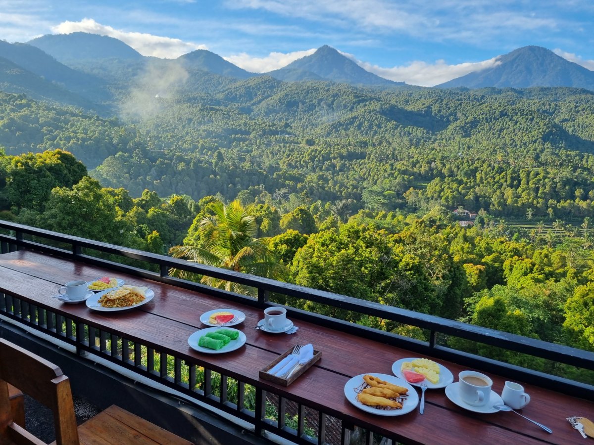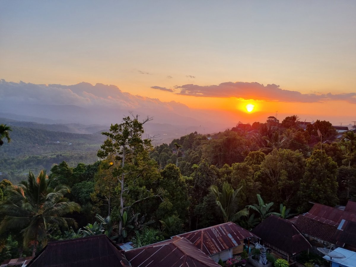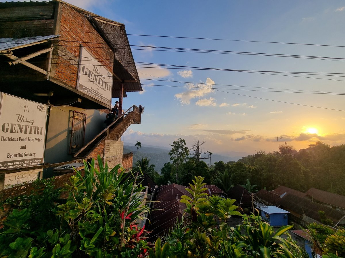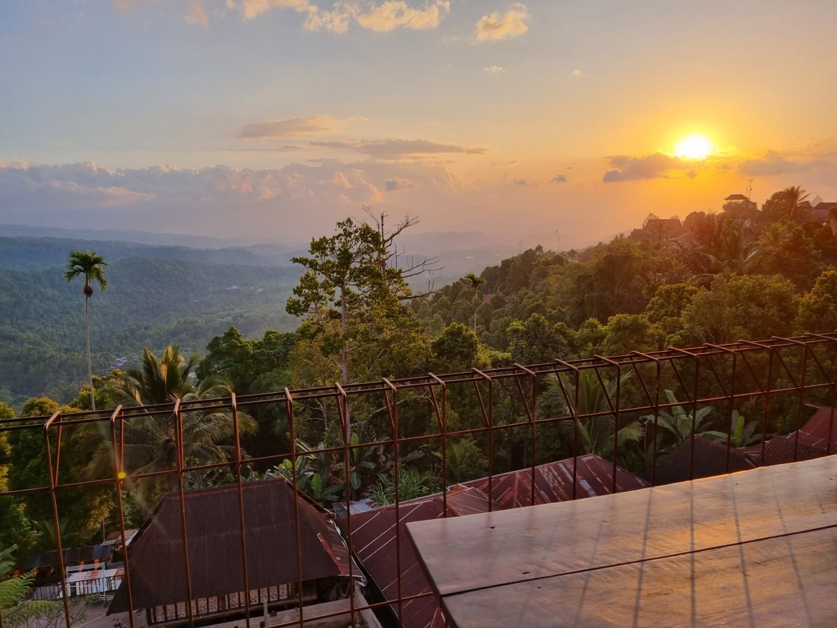 Do nového ubytování jsme dorazili během pozdního odpoledne.Hotel Nadya Homestay byl umístěný terasovitě ze svahu, na nejnižší terase byl bazén. Na nejvyšším patře se podávají snídaně s nepopsatelným výhledem do údolí. Měli jsme zamluvené dva pokoje (protože přistýlka by byla dražší než celý pokoj) s požadavkem, aby nám dali pokoje vedle sebe. Na každém patře byly jen tři pokoje a my měli dva z nich. Musíme říct, že toto ubytování bylo velmi levné a měli jsme od něj nejmenší očekávání, ale to byla chyba. Od snídaní (domácí palačinky plněné kokosovou náplní), přes dechberoucí výhled přímo z postele, nádherný bazén, který jsme opět měli téměř vždy k dispozici sami a hlavně skvělá lokalita. Přímo před hotýlkem byly hned dva obchody s potravinami, po padesáti metrech naprosto geniální restaurace a hlavně vstup na treky v okolí přímo v docházkové vzdálenosti. Nebylo potřeba se nikam nechat odvézt ani si půjčovat motorky. Zpětně si říkáme, že jsme tu možná měli být déle, alespoň o jednu noc. Munduk je prostě TO místo, které si z celé dovolené uložíte v srdci a vždy si na něj vzpomenete. A hlavně, je tu pár hotýlků, takže málo turistů. Vybalili jsme si věci a šli se svlažit do bazénu. Pod bazénem na další nižší terase se na plachtě sušil hřebíček a nádherně voněl. Pak jsme se přioblékli (k večeru byl svěží horský vzduch znát) a vyrazili do restaurace, do které jsme se pak ještě vrátili i další večer. Nešlo odolat 😊 Člověk vyjde po schodech do otevřeného patra, usadí se přímo k zábradlí s neuvěřitelným výhledem do údolí a dechberoucí západ slunce, objedná si drink, freš a úplně vymazlené kuřecí kari a prostě jen vstřebává tu nádheru, poslouchá zvuky přírody, kohouty, ptáky.