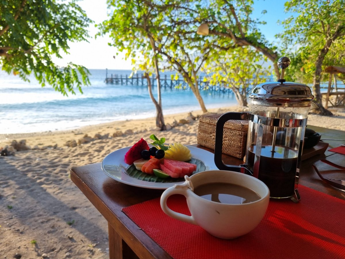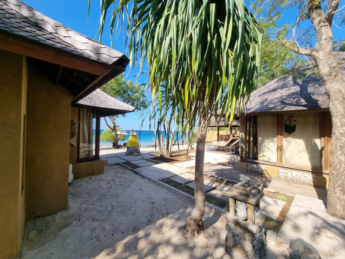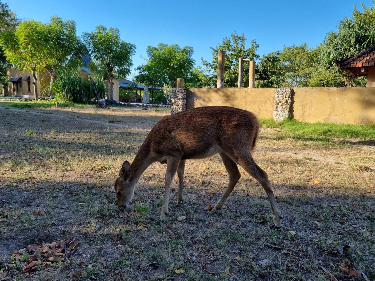 Jakmile jsme dorazili do přístavu (no přesněji k jednomu molu, kde byly zakotvené lodě), nahlásili jsme se zaměstnanci hotelu a nalodili se. Hotel Menjangan je umístěný v národní rezervaci na poloostrově, kam se nedá dostat suchou nohou. Jedná se o bungalovy mezi stromy na nádherné pláži, celkem 12 pokojů. Přímo naproti hotelu je Jelení ostrov, který je součástí této rezervace. Pro vstup na toto území se platí jednorázový poplatek 200 000 IDR na osobu a kdyby chtěl člověk během pobytu v hotelu jet na souš například pro zásoby a pak se vrátit, musel by tento poplatek platit znovu. Tento hotel byl nejdražší, který jsme během naší dovolené měli zarezervovaný, ale nelitujeme ani koruny utracené za toto místo. Počítali jsme předem s tím, že tam budeme odříznutí a že tam není obchod, bankomat, prostě nic – jen příroda. Nakoupili jsme si dopředu nějaké zásoby. V ceně jsme měli snídaně a dostatek pitné vody. Milé překvapení po příjezdu bylo, když nám paní recepční řekla, že máme v ceně také odpolední kávu/čaj, ke které se podávalo menší občerstvení: sladká rýže nebo banánová palačinka. Večeře jsme si plánovali platit, jídelní lístek a ceny jsme měli nastudované z recenzí. Počítali jsme i s tím, že si zaplatíme šnorchlovací výlet na jelení ostrov. Je tedy potřeba s sebou přivézt cca 3 miliony na 3 dny/ 3 osoby, aby člověk nemusel doplácet kartou (k čemuž si přidávají poplatek). Toto ubytování jsme brali jako 2 v jednom: ubytování a výlet dohromady. Zážitků jsme zde opravdu měli spoustu.