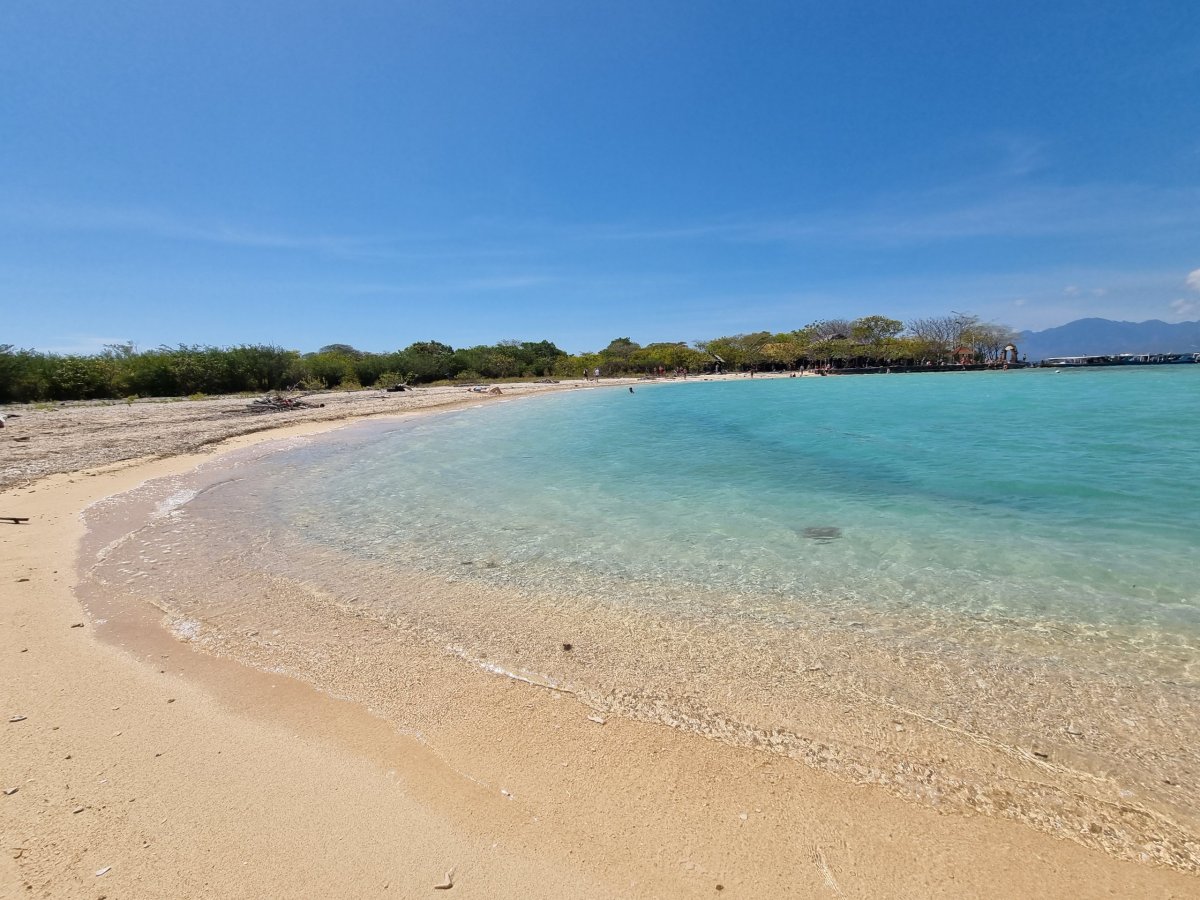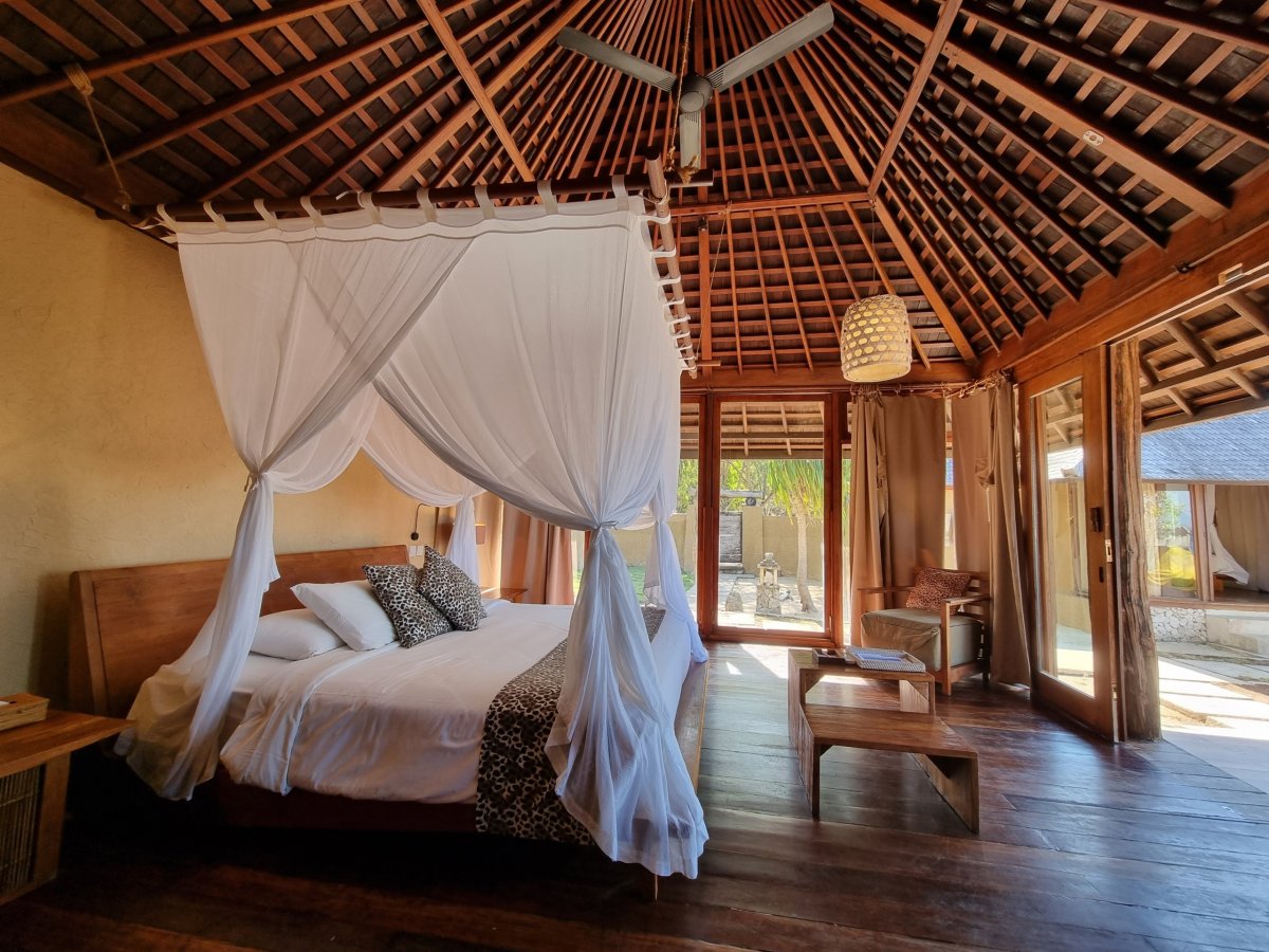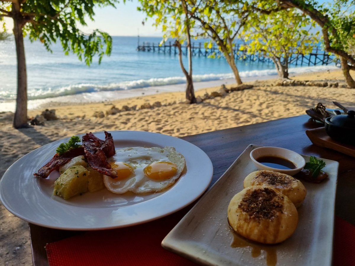 Jakmile jsme dorazili do přístavu (no přesněji k jednomu molu, kde byly zakotvené lodě), nahlásili jsme se zaměstnanci hotelu a nalodili se. Hotel Menjangan je umístěný v národní rezervaci na poloostrově, kam se nedá dostat suchou nohou. Jedná se o bungalovy mezi stromy na nádherné pláži, celkem 12 pokojů. Přímo naproti hotelu je Jelení ostrov, který je součástí této rezervace. Pro vstup na toto území se platí jednorázový poplatek 200 000 IDR na osobu a kdyby chtěl člověk během pobytu v hotelu jet na souš například pro zásoby a pak se vrátit, musel by tento poplatek platit znovu. Tento hotel byl nejdražší, který jsme během naší dovolené měli zarezervovaný, ale nelitujeme ani koruny utracené za toto místo. Počítali jsme předem s tím, že tam budeme odříznutí a že tam není obchod, bankomat, prostě nic – jen příroda. Nakoupili jsme si dopředu nějaké zásoby. V ceně jsme měli snídaně a dostatek pitné vody. Milé překvapení po příjezdu bylo, když nám paní recepční řekla, že máme v ceně také odpolední kávu/čaj, ke které se podávalo menší občerstvení: sladká rýže nebo banánová palačinka. Večeře jsme si plánovali platit, jídelní lístek a ceny jsme měli nastudované z recenzí. Počítali jsme i s tím, že si zaplatíme šnorchlovací výlet na jelení ostrov. Je tedy potřeba s sebou přivézt cca 3 miliony na 3 dny/ 3 osoby, aby člověk nemusel doplácet kartou (k čemuž si přidávají poplatek). Toto ubytování jsme brali jako 2 v jednom: ubytování a výlet dohromady. Zážitků jsme zde opravdu měli spoustu.