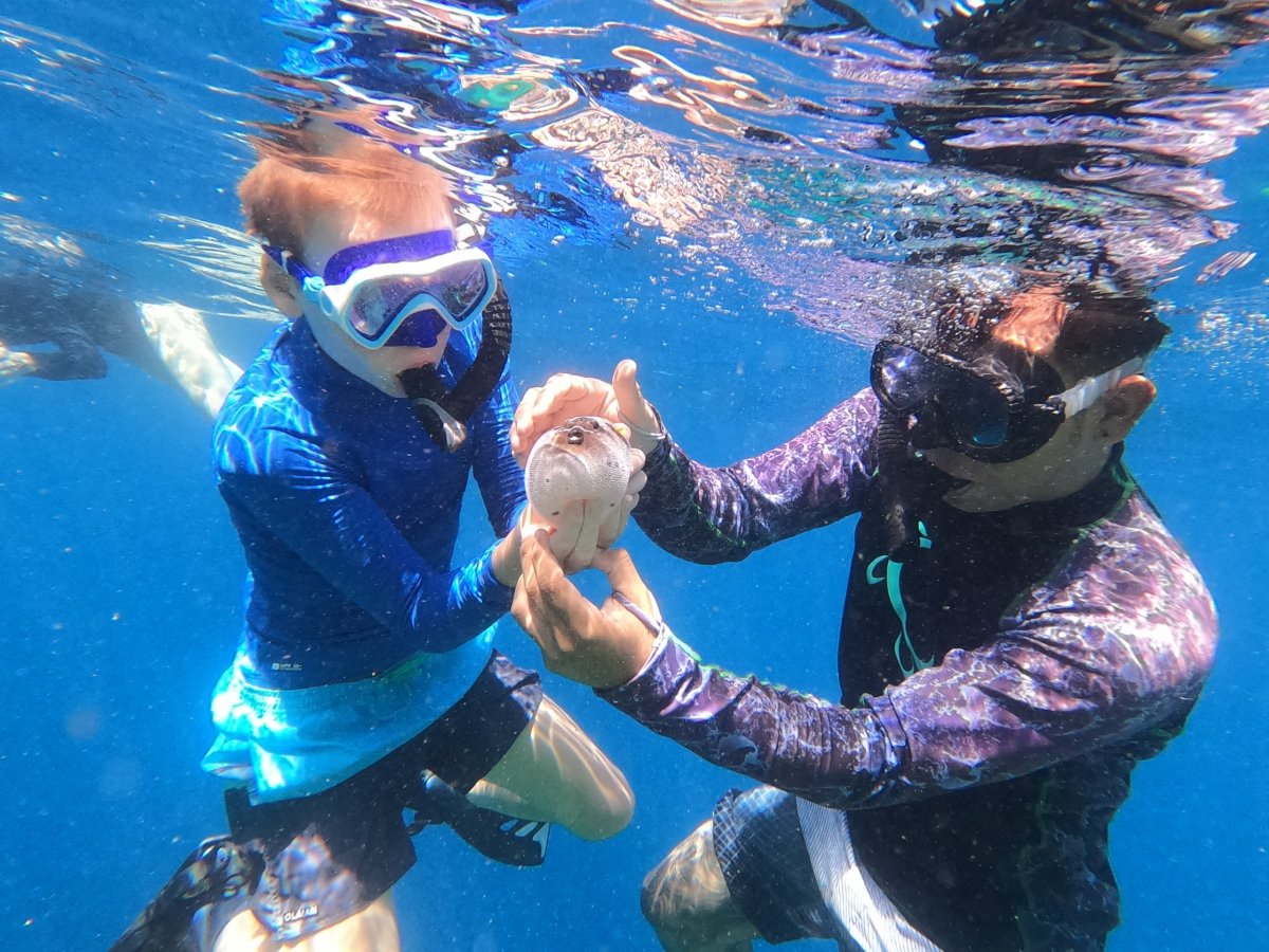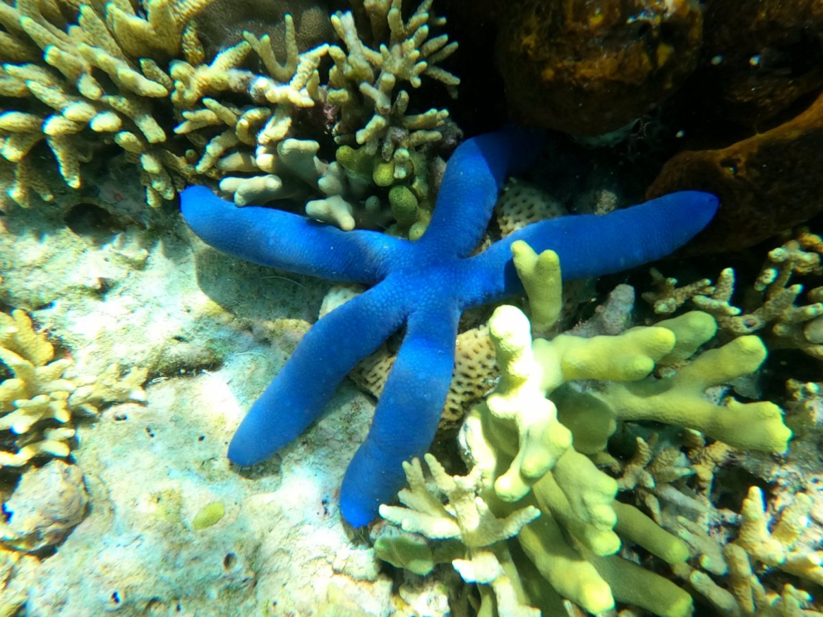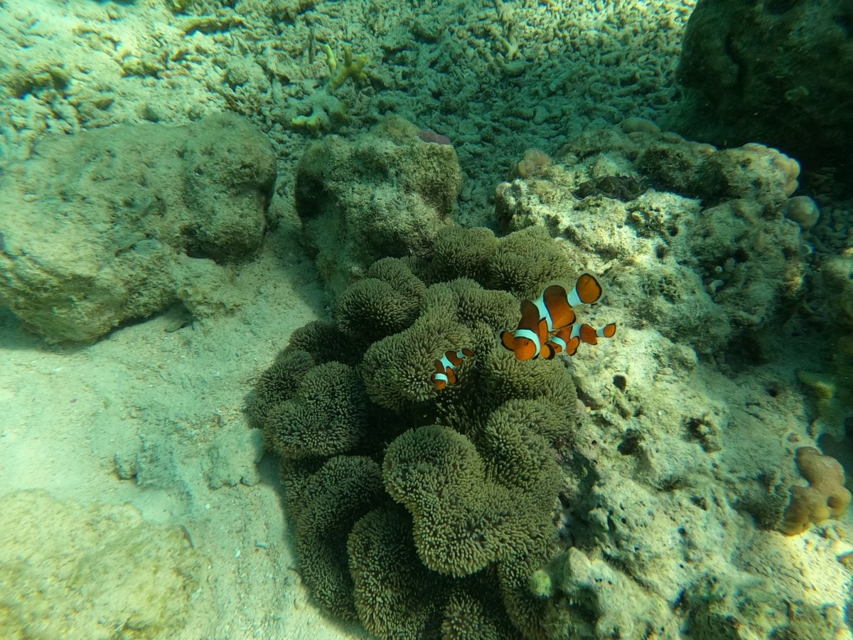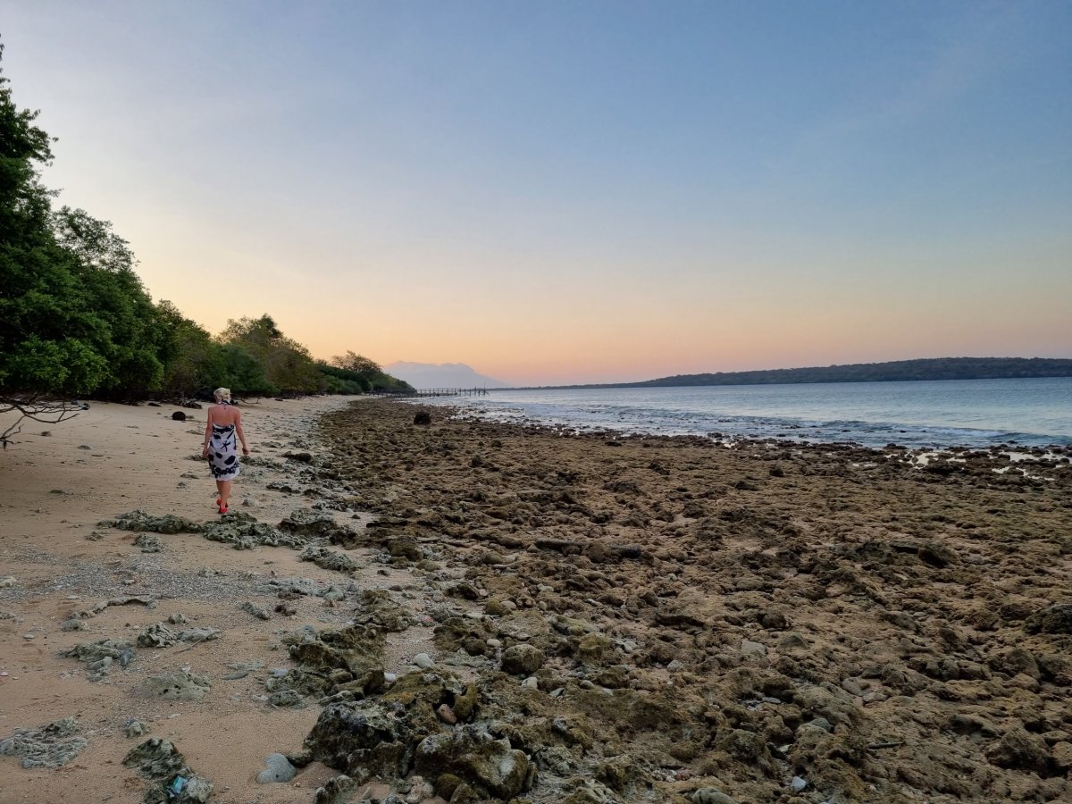 Předchozí večer jsme šli spát brzy. V noci jsem nemohla spát moc tvrdě, příboj byl opravdu hodně hlasitý a občas byly slyšet nožičky pod podlahou a na střeše. Nemůžu říct, že bych se bála, ale nezvyklé zvuky mi nedovolovaly úplně zabrat. Ráno nás probudil východ slunce, který byl vidět přímo z postele. Šla jsem do druhého bungalowu vzbudit Tomíka a pozorovali jsme tu krásu spolu z naší soukromé části pláže. Nikde zase žádní další hosté (stejně jako téměř včera celé odpoledne). Snídaně byla velkolepá a nedalo se to vše sníst. Přišlo nám líto vracet/vyhazovat jídlo, když to stojí tolik energie sem ty zásoby dovézt. Zbytek snídaně jsme si vzali na pokoj a schovali do lednice. Sbalili jsme si věci na šnorchlování, namazali se UV 50, oblékli trika do vody (při šnorchlování se člověk spálí velmi rychle) a vyrazili plní očekávání k okénku potápěčů. Na loď s námi šla už jen jedna rodinka (máma, táta a tři holčičky) a instruktoři. Rozdělili si nás – jeden si vzal na starost nás a druhý tu rodinku. Když jsme zakotvili u mola u jeleního ostrova, šlo se šnorchlovat na hranu útesu podél něj. Byly tu krásné barevné korály, rybičky Nemo v sasance, viděli jsme i chobotnici, velkou krevetu a spoustu barevných ryb včetně box fish – opravdu veliké a puffer fish, kterou dal průvodce Tomíkovi přímo do ruky s tím, že jí nesmí dát prsty do pusy, protože má zuby jako piraňa. Také jsme viděli hodně modrých hvězdic, jednu z nich, a pak také mořskou okurku, nám dal průvodce taky do ruky. Nás by nikdy nenapadlo na živočichy sahat, jednak z přirozeného respektu, abychom jim neublížili a jednak ze strachu, abychom neublížili sobě. On byl ale místní a šnorchluje tu každý den, tak musí vědět, co je a co není bezpečné. Vtipné bylo, že oba průvodci se jmenovali stejně: Gede.