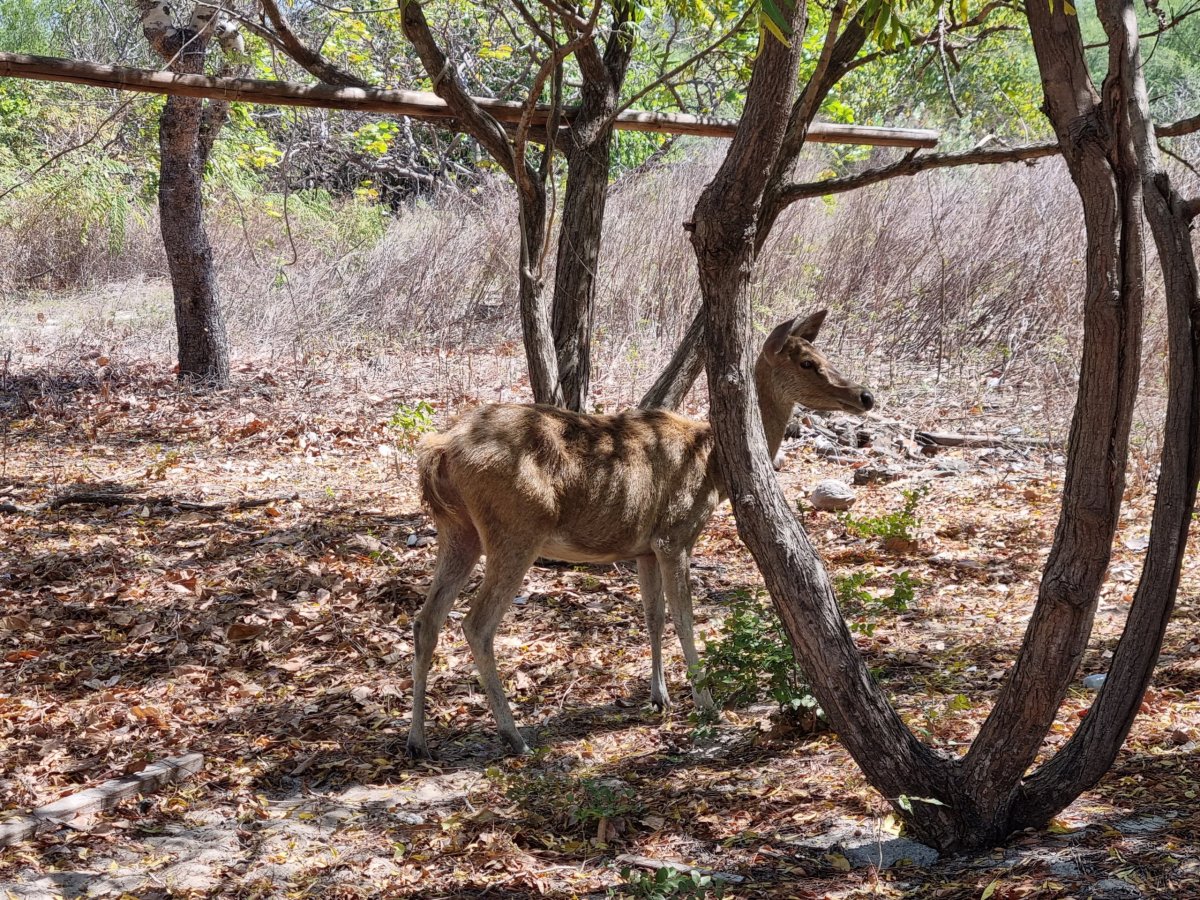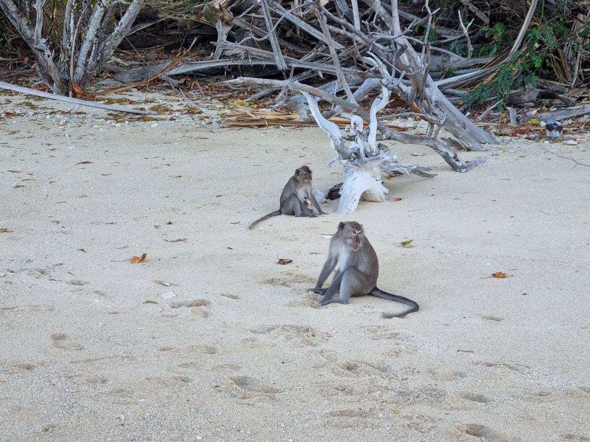 Na lodi s námi jeli ještě jedni hosté a pak zaměstnanci se zásobami. Cesta trvala asi 20 minut. Vystoupili jsme na molu, zaměstnanci se okamžitě chopili zavazadel a na recepci si naše dvě skupiny rozebrali recepční, takže vše běželo jako po drátkách. Slečna nás odvedla do našeho apartmánu a opět nám spadla brada. Tohle jsme ani podle fotek na Agodě nečekali. Opět jsme měli nejdražší typ pokoje – měl to být bungalow se dvěma ložnicemi – ale ve skutečnosti jsme pro sebe měli celou zadní část pláže oddělenou zdí, takže vlastní prostornou soukromou zahradu s vlastními lehátky a slunečníky (celkem jich tam bylo 6 a všechna byla naše), venkovní posezení v altánu se stolem a židlemi a dva bungalowy: v každém jedna ložnice a jedna koupelna. Vše přenádherné mezi vzrostlými stromy, za námi a vedle nás všude pak už jen les. Měli jsme na zahradě také ovocný strom a pítko pro zvěř. Slečna nám vysvětlovala, že jsme uprostřed přírody a že bysme se zde měli chovat podle toho. Všechny cennosti dávat do trezoru, krosny do truhly a zavírat víko. Kdyby se dostaly opice (prý tu mají dva druhy) do bungalowu, můžou nám něco odnést. Kladla nám také na srdce, abychom VŽDY zamykali bungalowy, že si umějí otevřít dveře. Úklid probíhá dvakrát denně a s ním i doplňování pitné vody. Donáška jídla na pokoje není kvůli zvěři možná a jestli s sebou máme nějaké jídlo nebo pití, ať si okamžitě schováme do truhly, že ho cítí. Koukali jsme se na sebe vyjukaně, je to tu jako nocovat někde v Africe na safari! Také nám slečna říkala, ať si na noc zatáhneme moskytiéry a spodní část zastrkáme pod matraci, že nám něco může v noci po moskytiéře vylézt do postele, ufff, nechtěla jsem ani domýšlet (pavouk? myš?) Když nás nechala slečna o samotě, vybalili jsme (nebo spíš schovali do truhel) věci, převlékli se do plavek a šli prozkoumat okolí hotelu. Chtěli jsme si zašnorchlovat a ponořit se do té nádherné tyrkysové vody, ale brzy jsme zjistili, že odpoledne bývá odliv a voda se zakalí. Po jednom pokusu z mola a téměř nulové viditelnosti jsme se vydali na odpolední občerstvení. Dostali jsme kávu, čaj a sladkou rýži. Číšníci při této příležitosti rovnou dělají tzv. předobjednávku na večeři – předpokládáme, aby měli dost času si případně ještě z pevniny přivézt chybějící zásoby večerní pravidelnou lodí. Dnes jsme se rozhodli, že si večeři nedáme, měli jsme již zmíněné zásoby a byli jsme ještě najedení z restaurace po cestě sem. Přivezli jsme si i pivo a limonády. Při cestě zpět k našemu bungalowu (nebo spíš soukromému sídlu) jsme se zastavili ještě u okénka potápěčů, kteří organizují veškeré výlety a domluvili jsme si na zítřejší den výlet na jelení ostrov. Říkali nám, že na lodi bude maximálně deset osob, že se bude dvakrát šnorchlovat a bude i zastávka přímo na ostrově. Přemýšleli jsme nad zítřkem a živě o něm diskutovali a po cestě jsme mále vrazili do laně. „byli tam ONI, jeleni“ – díky Katko (cestujzakačku) 😊tvoje hláška u nás zdomácněla 😊 stála tam uprostřed hotelové zahrady (nevím, jak přesněji nazvat, hotel není oplocený) v prostoru mezi dalšími bungalowy a pláží. Vůbec se nebála, pásla se a nechala nás přiblížit se skoro na dotyk. Pózovala na fotky, občas se na nás podívala a pak se zase pásla. Všimli jsme si, že po celém areálu jsou umístěna pítka pro zvěř, a proto se tady zdržují. Celá oblast je jinak dost suchá. Když jsme se vrátili k nám a zavřeli branku (ano, měli jsme i svojí branku oddělující naší zahrádku od zbytku areálu), zjistili jsme, že se nám po zahradě prohánějí makakové. Že chodí na svačinku na ovocný strom, který tam roste a že se chodí napít k pítku. Zrovna byl odliv a slunce se chýlilo k západu. Makakové jsou podle informací od paní recepční všežravci – a hned to bylo vidět. Několik jich šlo podél pobřeží po kamenech, které se odkryly v moři při odlivu a vybírali zpod kamenů šneky, rozlouskávali je a dávali si je do pusy. Když jsme se chtěli přiblížit, tak na nás cenili zuby a vrčeli, asi se báli, že jim ty šneky sníme. Celá skupinka makaků (slečna recepční říkala „Grey monkeys“ a říkala o nich také, že jsou drzí) se postupně přemíšťovala do svého nocoviště. Všimli jsme si už během předchozích setkání s nimi, že mají jeden konkrétní strom, kam chodí vždy celá skupina přenocovat. Rozhodli jsme se, že se půjdeme projít podél pobřeží směrem od hotelu, než slunce zapadne a prohlédneme si to tu, třeba potkáme ještě nějaké zajímavé obyvatele. Po západu slunce ale začaly kousat písečné blešky a zahnaly nás do bungalowu.