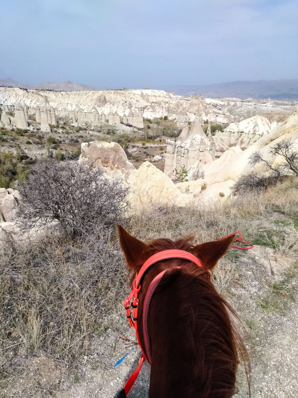 Nejeli jsme ale do Göreme se podívat na masu turistů, takže jsme si prošli v klidu centrum, kde najdete spoustu malých krámků, pokud rádi utrácíte za věci, které vás "potřebují" (=cetky), tak je to ráj pro vás. My jsme se vydali na neznámou cestu po skalních útvarech a náhodou jsme narazili na ranč. Za cca 150 TL (1 TL = 3,5 Kč v té době) se můžete na hodinu projet na koni a to je teprv zážitek! Projet se v malé skupince do vedlejšího městečka vidět území trochu jinak než po svých/autobusem/ze vzduchu, byl jeden z nejlepších nápadů.