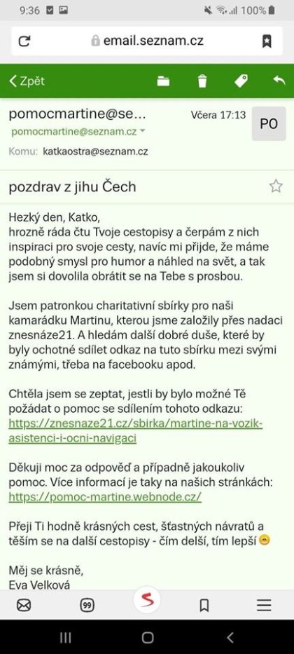 ...sdílím tu e-mail Evy. Myslím si, že přečíst si ho a třeba jen trošku pomoct by pár z vás mohlo. Nejen mohlo, ale jak vás znám, tak pomohlo s radostí. Pokud si Evča myslí, že to, že to zveřejním, může pomoci - napíšu to klidně žlutou fixou na čínskou zeď! Do Číny mi to ale asi ještě chvilku potrvá a v případě Martiny je čas nejcennější komodita. Tak aspoň koukněte - pomozte nebo kdekoli sdílejte - protože nikdo z nás není NEDOTKNUTELNÝ: https://znesnaze21.cz/sbirka/mar...i-navigaci