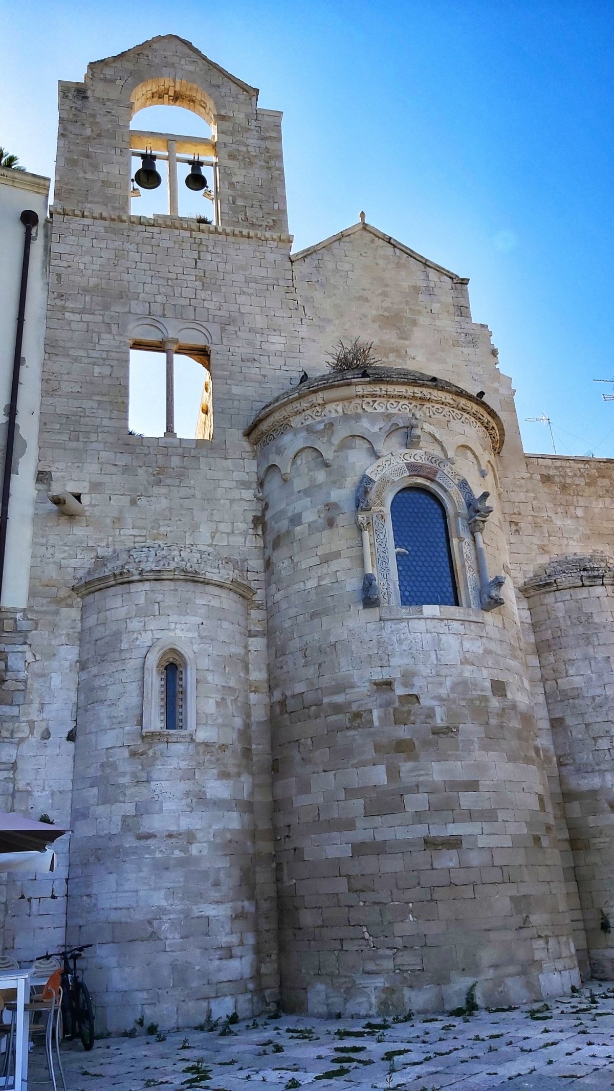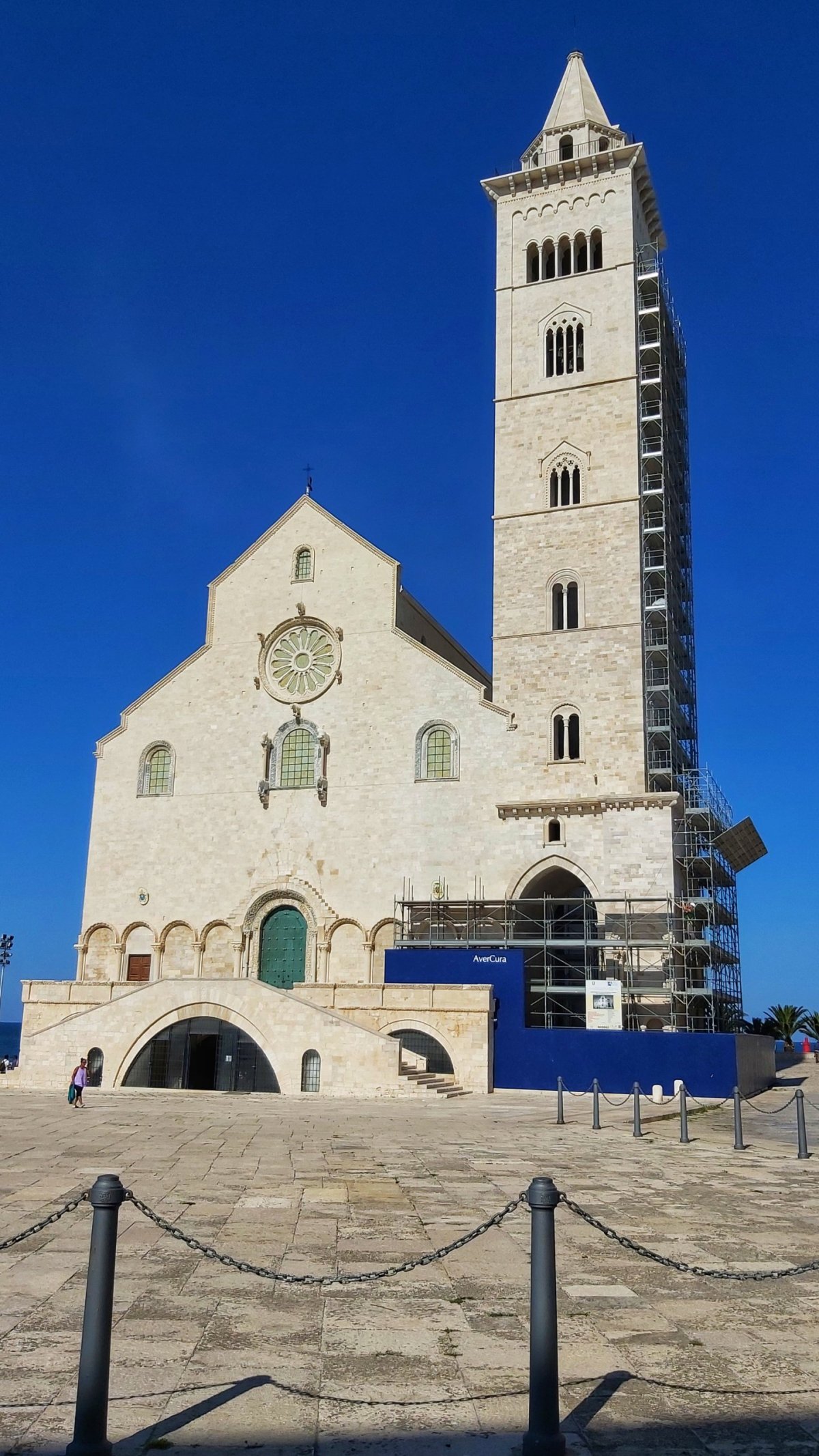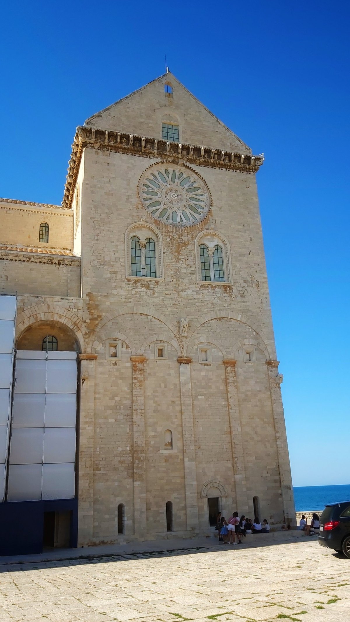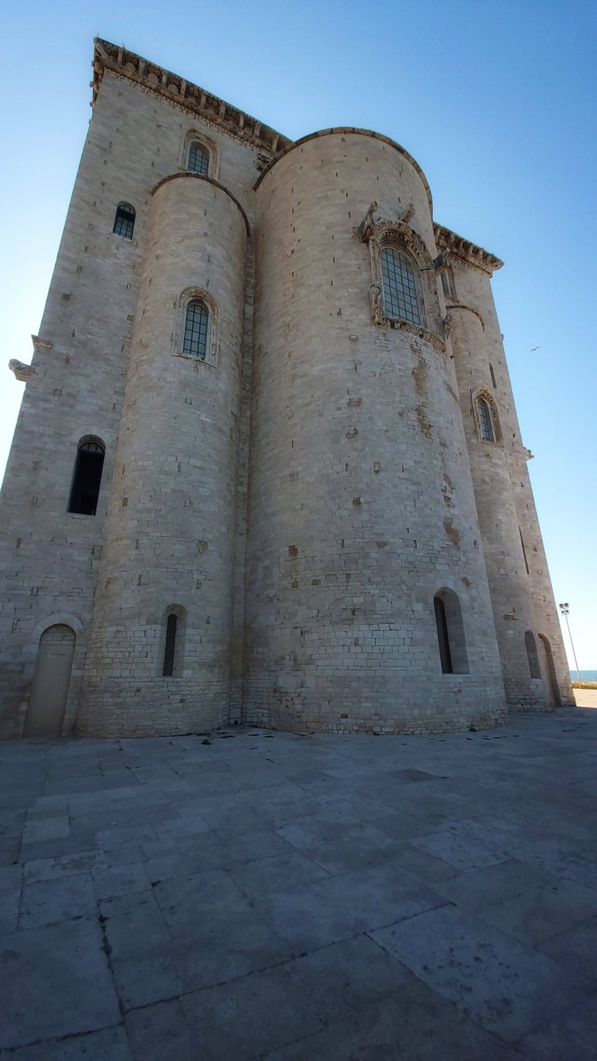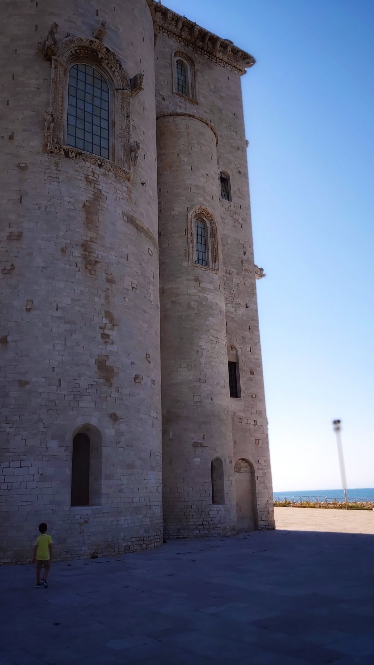 První zastávka je KATEDRÁLA TRANI. Nejen že je to velkolepá stavba sama o sobě, ale tyčí se přímo na břehu Jaderského moře, což jí dodává teprv nádech romantiky. Pohled na ni bere dech a je to přesně ta stavba, jejíž obrysy, zvuk varhan linoucí se z jejích útrob a mořské pozadí bude mít člověk už navždy v hlavě jako dokonalou kompozici jednoho dokonalého místa. Hlavou mi zde proletí podobná místa. Živé záblesky.. Kostel na břehu moře v Ohridu, maják na Sardinii, katedrála v nikaragujském Leonu, socha Ježíše v Juan del Sur… A teď nově - Katedrála Trani. Mimochodem - je zasvěcená svatému Mikuláši, stejně jako před pár dny boží kostel ve Znojmě..