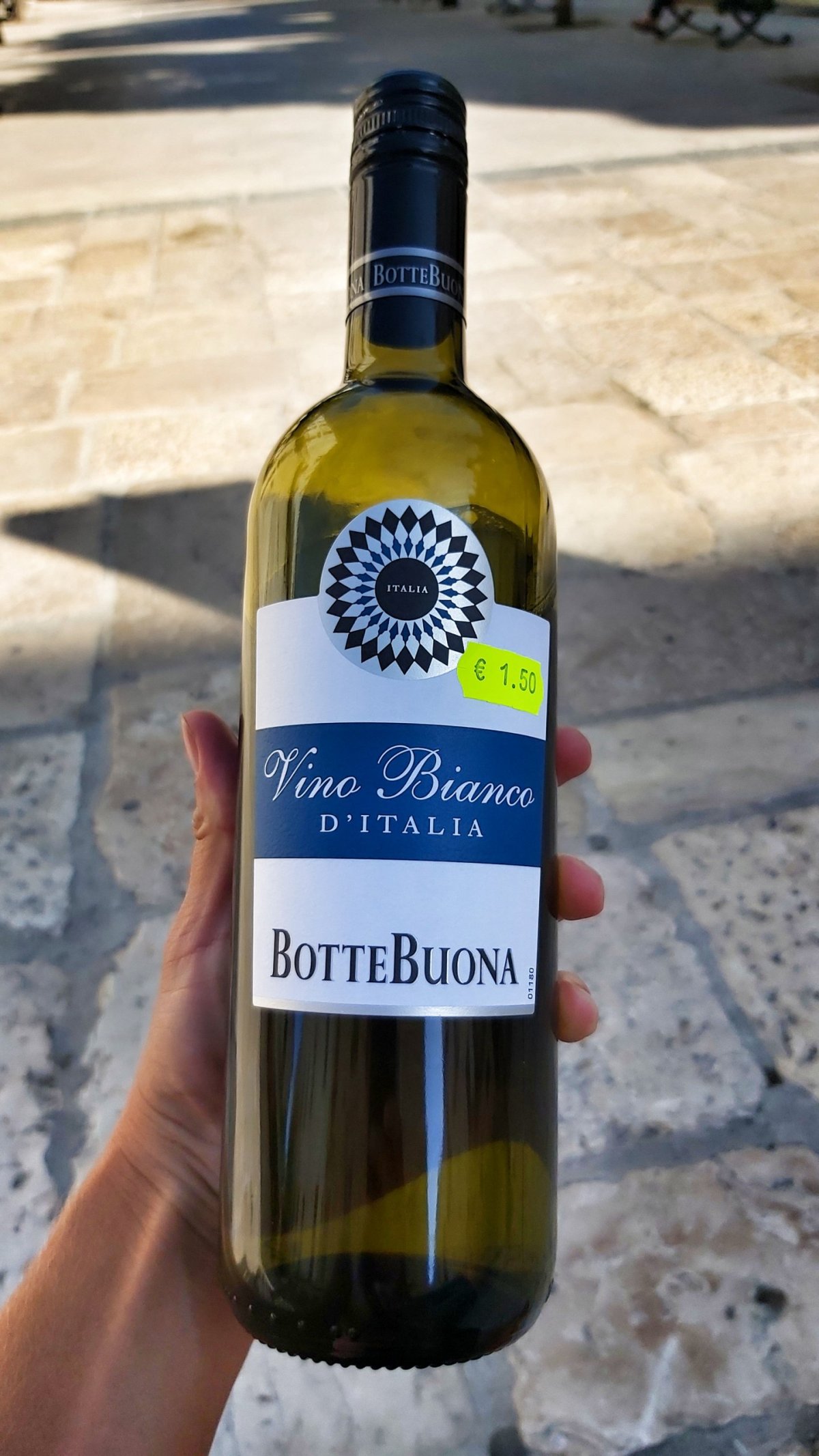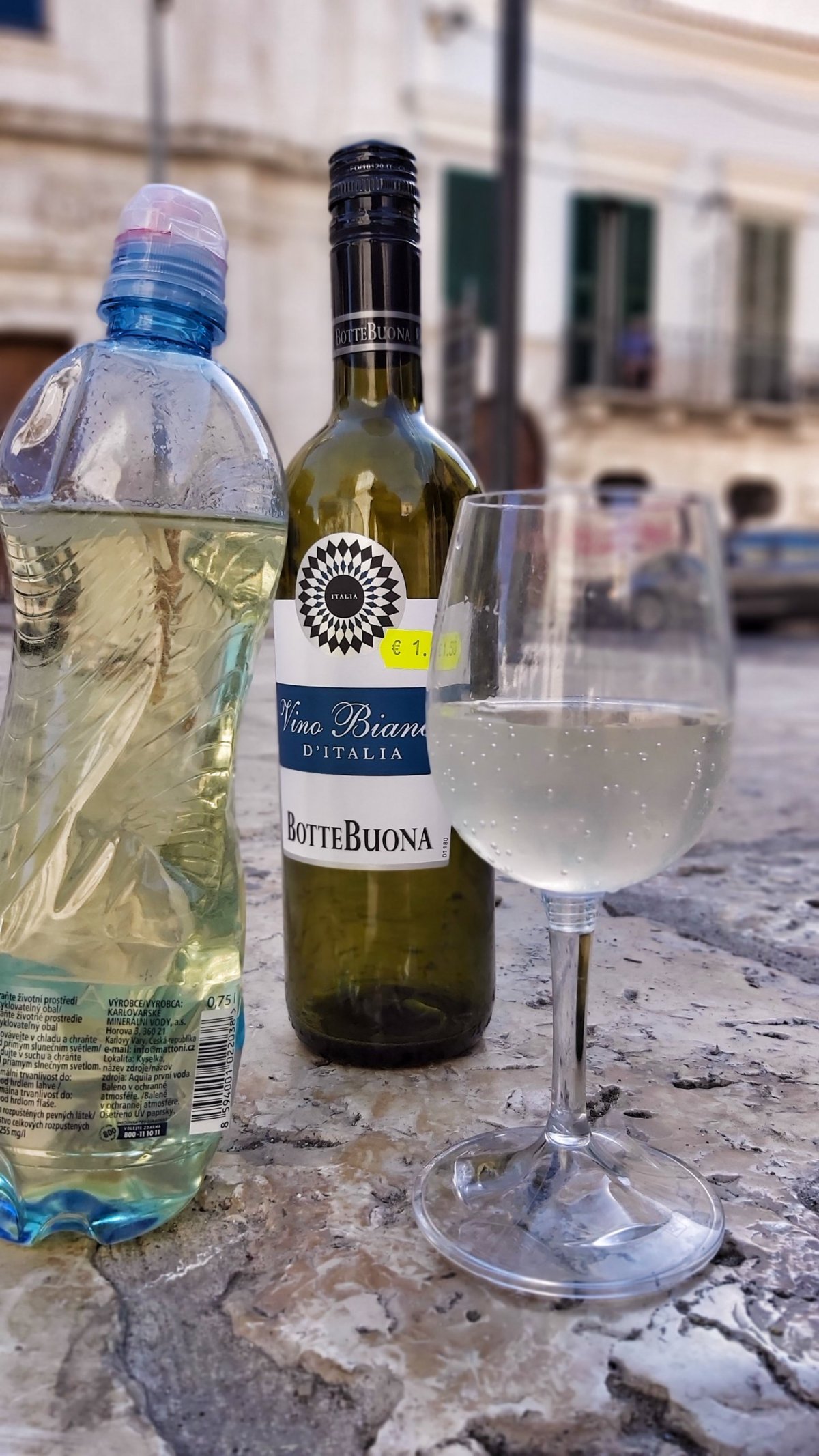 Hned vedle katedrály je pevnost Castello di Trani, ale ta mě nijak nezaujala. Navíc na mě padla šílená žízeň a dehydratací se mi na chvilku udělaly mžitky před očima. Mapy hlásily nejbližší market skoro 20 minut chůze od mé polohy a já na vteřinu přemýšlela, že možná fakt omdlím. Ve stejný moment vedle mě zarachotila kovová roleta a pán po místní siestě s úderem 17 hodiny právě otevřel malinkou sámošku. Zázrak! Beru ledově vychlazenou vodu a ješte pred zaplacením ji celou vypiju. Úžasný pocit! Jak po přiložení elektrody kardiostimulátoru na hrudník a puštění do těla výboje tak silného, aby to bezvládné tělo přivedlo k životu. Dopíjím vodu a vidím na poličce pár lahví vína… No přece tu plastovou sklenicí netáhnu zbytečně! Cena 1,5 € za láhev je jasným znamením, že za KAČKU trip bez téhle láhve nemůže být! Sednu před katedrálu a vychutnám si skleničku jak už dlouho ne! Zbytek do PET lahve (vinná etiketa má prázdniny), protože kdo by to sklo na zádech nosil, že. No a jde se na vlak, protože Hoštice, nezastavujeme! Další stanice BARLETTA!