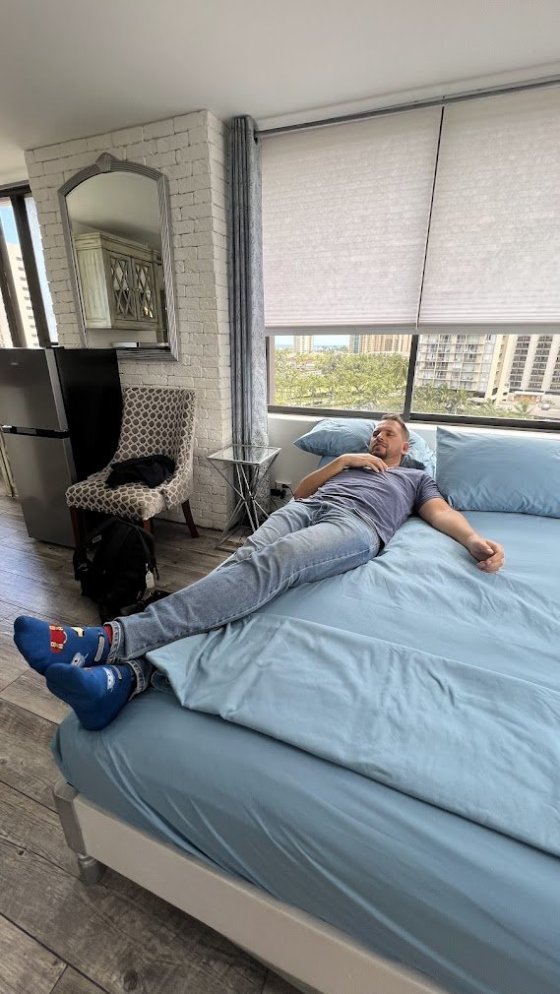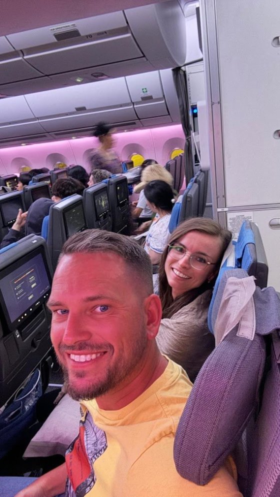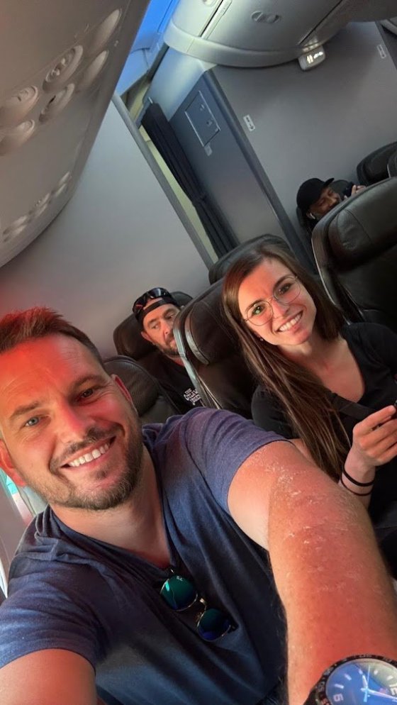 V noci jsme několikrát přehodnocovali plány a já mezitím hledal letenky do Evropy, alespoň v premium economy, případně business class. Marek, který uvízl na letišti v Abu-Dhabí z důvodu útoku Iránu na Israel, nám alespoň trochu zvedal náladu svým černým humorem. "Kámo, tak ta na 100% dostane infekci a pojde". V zápětí dostávám od Marka výstřižek mé fotky, jak si zdravotník nad Adélkou blaženě rozepíná košili. Posuďte sami, není to dokonalý humor?... Brzo ráno padne rozhodnutí. Pokračujeme v cestě kolem světa!