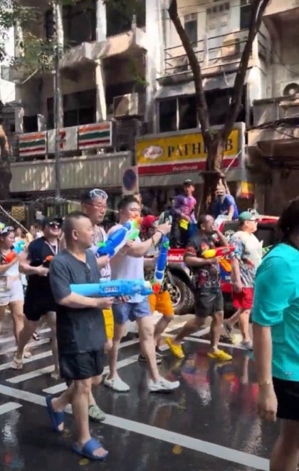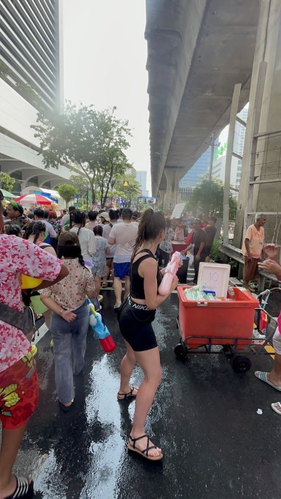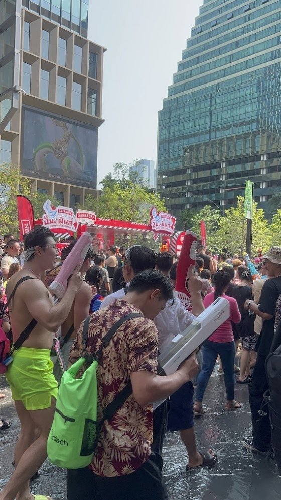 Celá ulice Silom je pro motorová vozidla uzavřena. Je tu postaveno několik pódií, mnoho stánků pro streetfood a ozbrojené složky regulují davy turistů s úžasnou, nepopsatelnou náladou. Schyluje se k největší vodní bitce na světě! Za zvuku hudby procházíme společně s davy lidí celou délku ulice a v zápalu boje ani nestíháme cokoliv fotit. Je to nepopsatelná atmosféra. Kdybychom měli spodní prádlo, tak už ho můžeme ždímat, což nám při teplotách kolem 40°C vůbec nevadí. Část davu lidí pouze tancuje v totálně promočeném oblečení, občas schytáme velkou dávku z kýble od thajských domorodců z okolních budov. Během hodiny máme adrenalinu na zbytek naší cesty a utíkame se skrýt do stanice Chong Nonsi. Naposledy z nadchodu kropíme lidi dole na ulici a utíkáme do nadzemky.