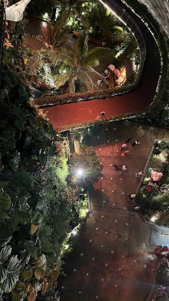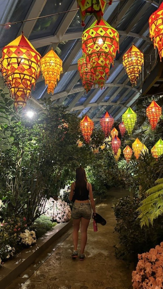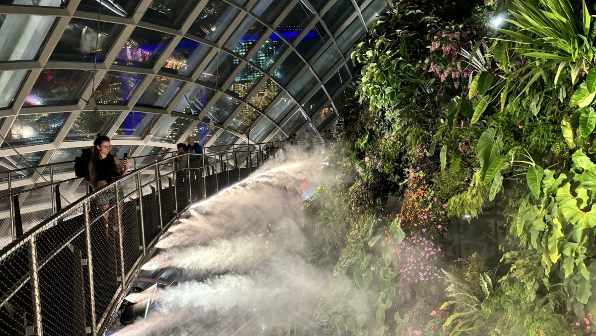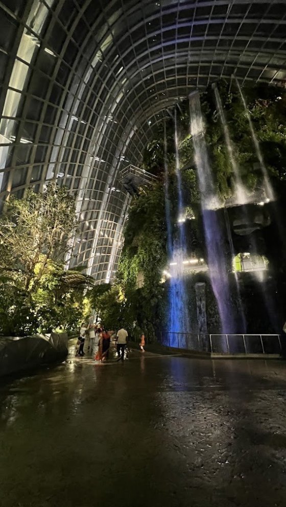 Bloudíme po Gardens by the bay. Čím více se stmívá, tím více je zahrada impozatnější. Rozhodneme se navštívit Cloud Forest. Platíme 24SGD za osobu. Cloud forest je obrovský "skleník". Procházíte doslova pralesem mezi mraky. Je to nepopsatelné a musíte to zažít. Nevím, zda je to umocněné, tím, že venku je noc a světelné efekty dělají své.
