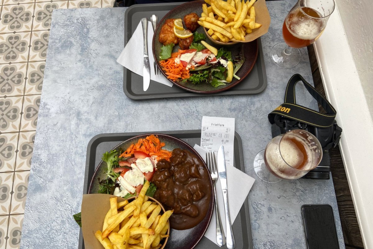 Bruggy: Frietfarm Restaurant Frituur, je jedna z hranolkáren. Kromě super hran, tu dostanete i maso (vlámský guláš, ryba, trhané maso, burger, atd.), bylo tu vždy dost plno a naprosto oprávněně.