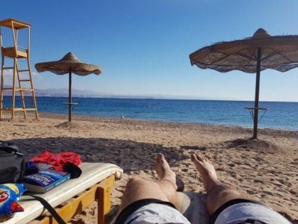Čtvrtek 1.2. Den poslední. Půlka. Snídaně, pláž, předposlední kapitola knížky, bonbóny, balení, pokec s Tahou a už jsou dvě hodiny odpoledne. Čas na check out. Domlouvám se, že ještě dvě hoďky počkám na venkovním baru u pláže. Což právě teď dělám, dopisuju tyto poslední řádky na území Egypta, dávám si coke. Hosté popíjí koktejly, pozorují mě jak sedím u svého batůžku, nejspíš mě mají za zbloudilého spisovatele. Čas 16:00 se pomalu naplňuje. Zbývá přejít naposledy hranice, sednout na bus a dopravit se na letiště. Čas do odletu využiji pro dočtení knížky a zálohu fotek a videí. Mohl bych stihnout přepsat tyto mé výplody do digitální podoby a v 1:55 v Praze by mohla být pasáž Izrael 2018 u konce. Pokud by se cokoliv zajímavého ještě přihodilo, tak se ještě přihlásím. Pokud ne, tak už první víkend v únoru čteš toto vše na mém webu.