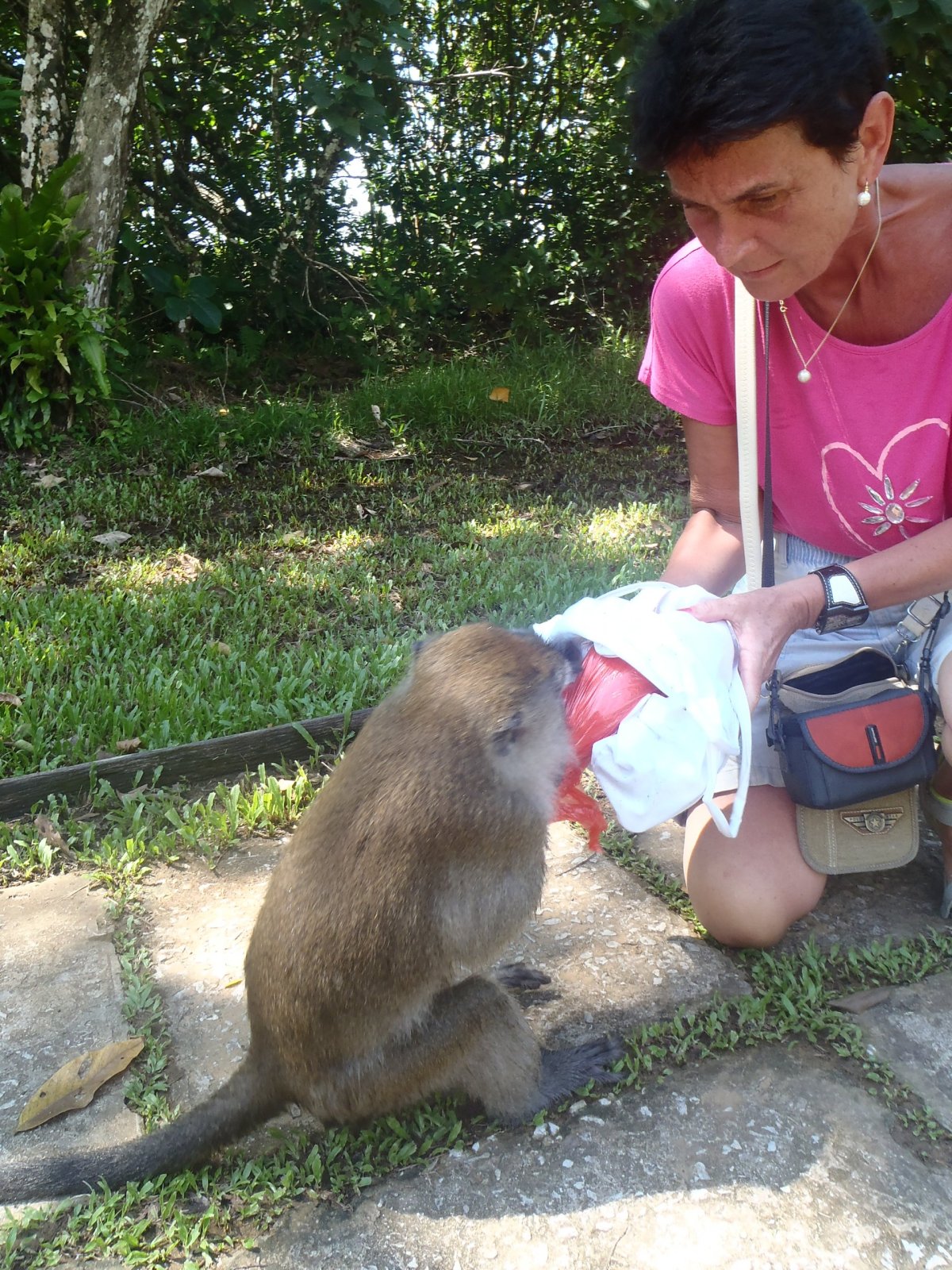 Měli jsme se na pozoru před těmi drzými makaky, kteří se od turistů naučili brát pamlsky. A tak jsme v jejich hledáčku dobrot. Když je nedostanou, tak si je prostě vezmou. Třeba i z baťohů. Umí si dokonce tyto i otevřít a vůbec jim nevadí jejich nositel. V restauraci dopíjejí to, co zůstává v plechovkách. A pokud se strávník vzdálí od svého talíře byť jenom na chvilinku, musí se dělit o svůj oběd s makakem. Asi jako u nás s bezdomovcem. Bohužel pro ně nikdo z nás neměl v baťohu nic, co by stálo za to, a tak jsme nebyli pro ne zajímavý. Prošli jsme dřevěným mostem a vkročili do džungle.