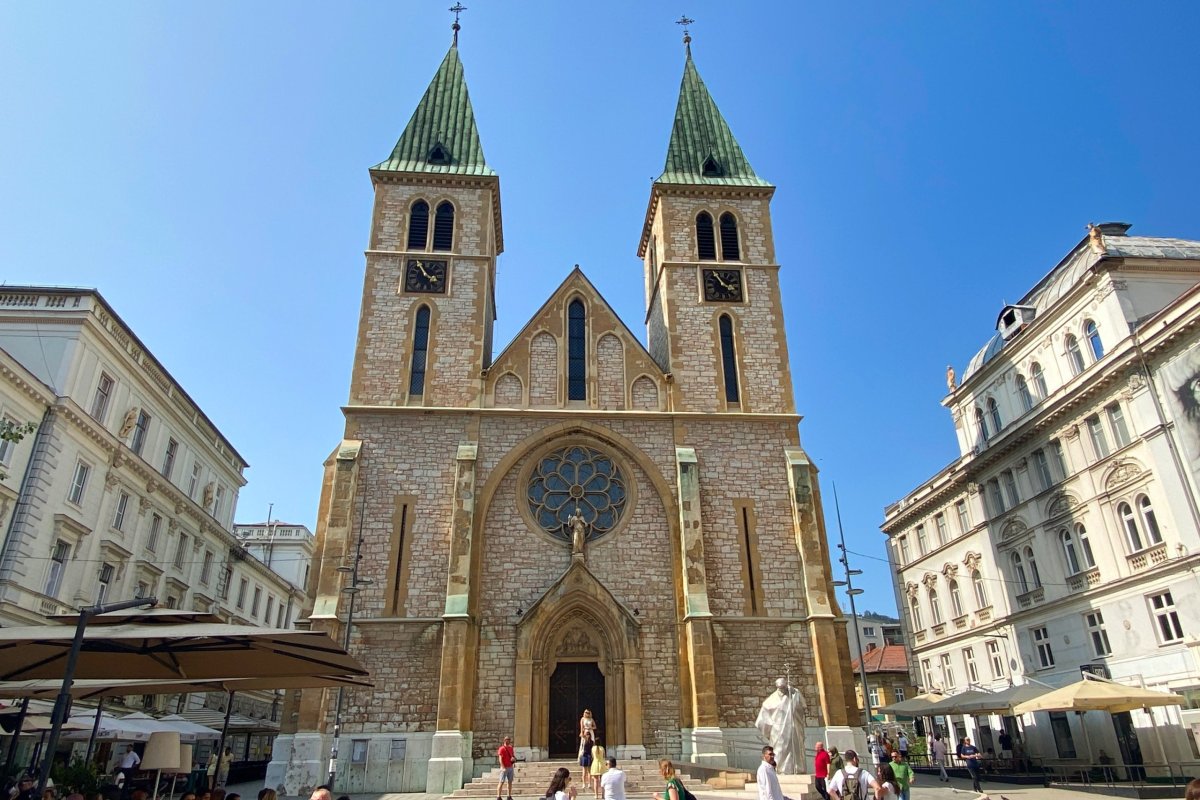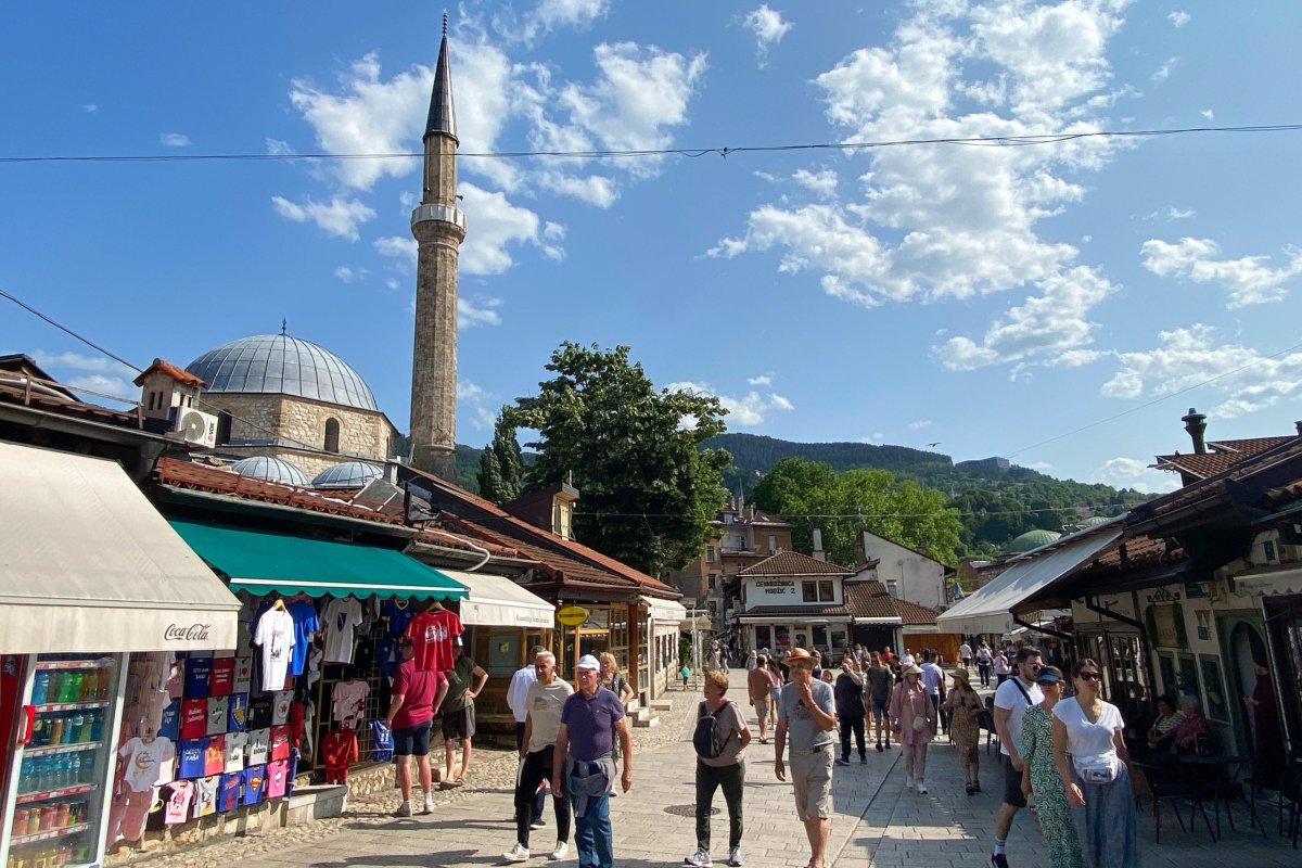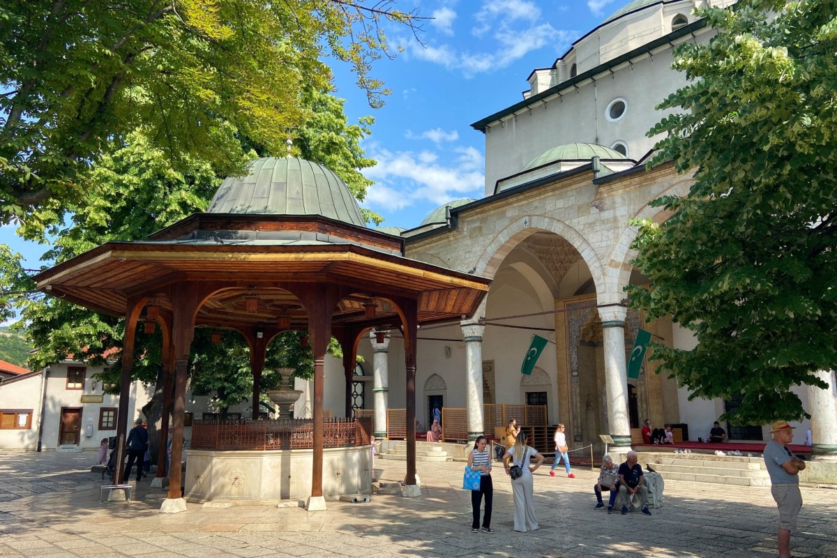 Kousek od obytka je památník Věčný plamen věnovaný obětem druhé světové války. Pokračuji pěší zónou Ferhadija. Prakticky po pár metrech je Katedrála srdce Ježíšova. Za další kousek následuje ikonická Gazi Husrev-begova mešita. Na to jít dovnitř bohužel nejsem vhodně ustrojen, ale i z venku je to pěkný areál a stojí za aspoň krátké zastavení. Po krátké procházce docházím na trh Baščaršija, kde prakticky končí staré město. Je teda všude nechutně moc lidí (stejně jako v Mostaru).