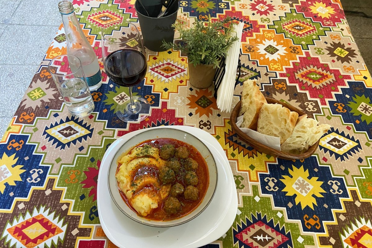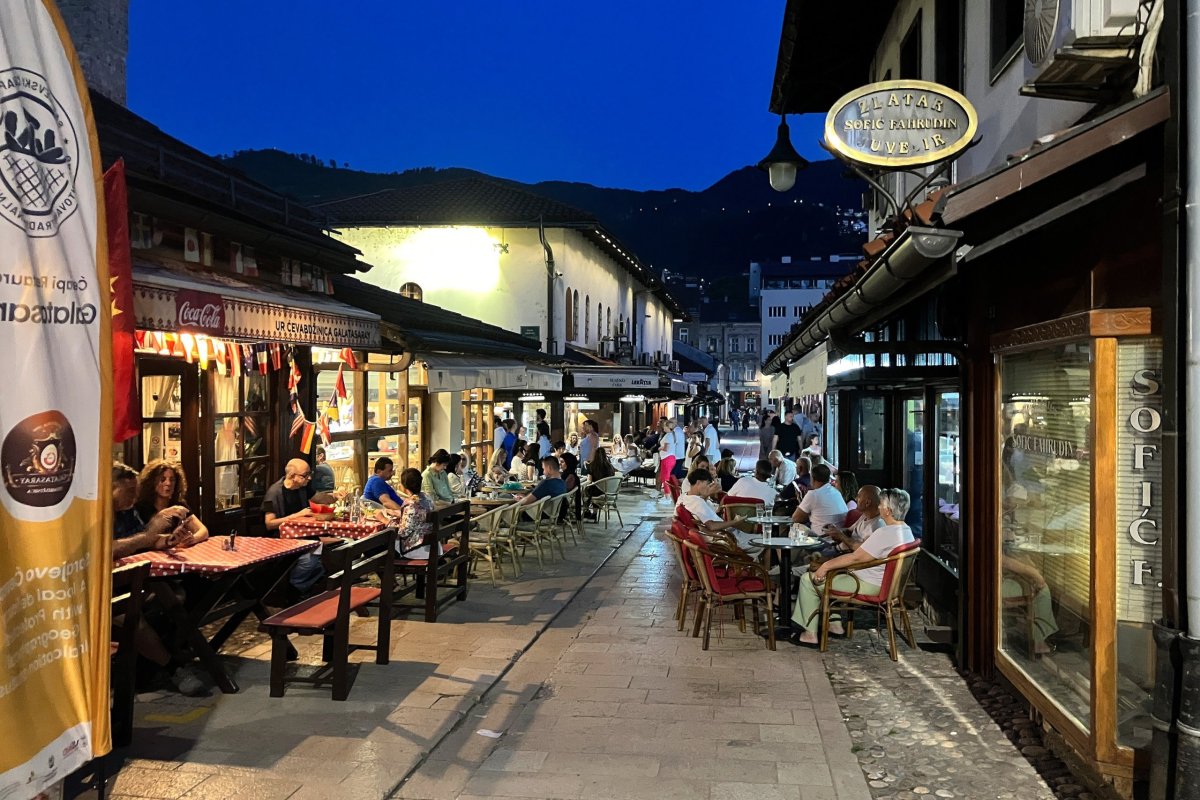 Večer se mi povedlo urvat místo v jedné z ćevabdžinic . Jsou to malá bistra specializovaná na gril, většina je jen nealko. Testuji místní telecí klobásky, což je další bod ze jídelního seznamu, který můžu odškrtnout. Poté se hned vedle mešity zastavuji v baru na dvojku vína a toulám se ještě přeplněnými uličkami. Potom je čas jít spát.