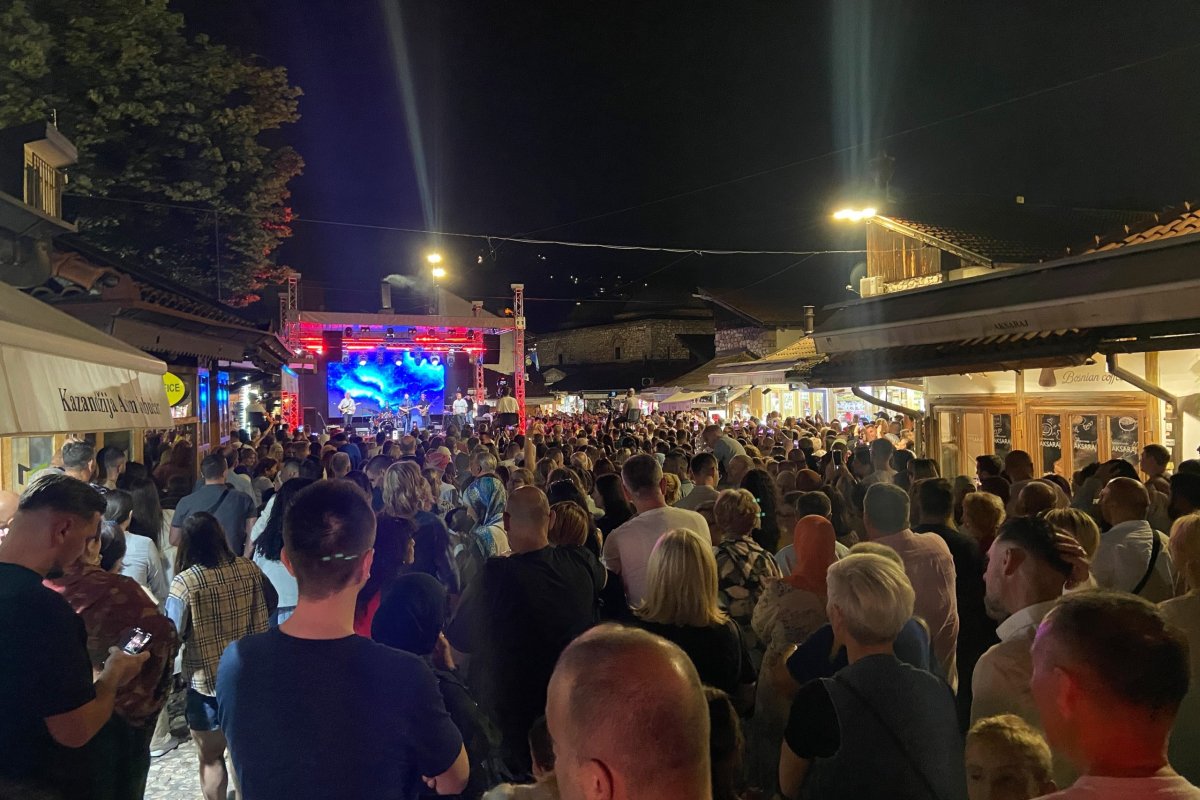 Já toho mám ale dost a jedu vpodvečer zpět do města. Než se doplazím na byt, tak toho mám už plné zuby. Po krátkém odpočinku jdu ještě do víru velkoměsta. Zastavuji se na véču a trochu místního vína (to tu mají dobré snad všude). Večer se ještě vydávám projít se starým městem a nakonec se odhodlám jít i nahoru nad centrum na vyhlídku. Jen se mi už nechce na žlutou pevnost, ten kopec je fakt nechutný. Zkouším jít druhou stranou, ale tady to není tak super. Po cestě domů zjišťuji, že je Baščaršija plná lidí, je tu i nějaký koncert. Chvíli se zdržím a pak se už belhám domů, to už mám v nohách asi 18km a je to znát😀 .