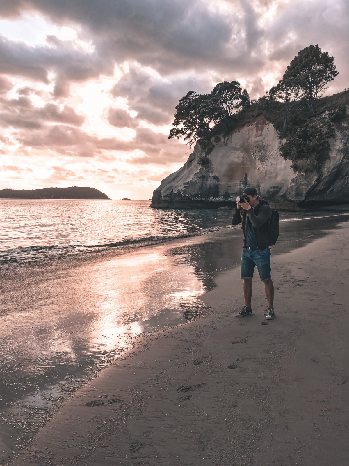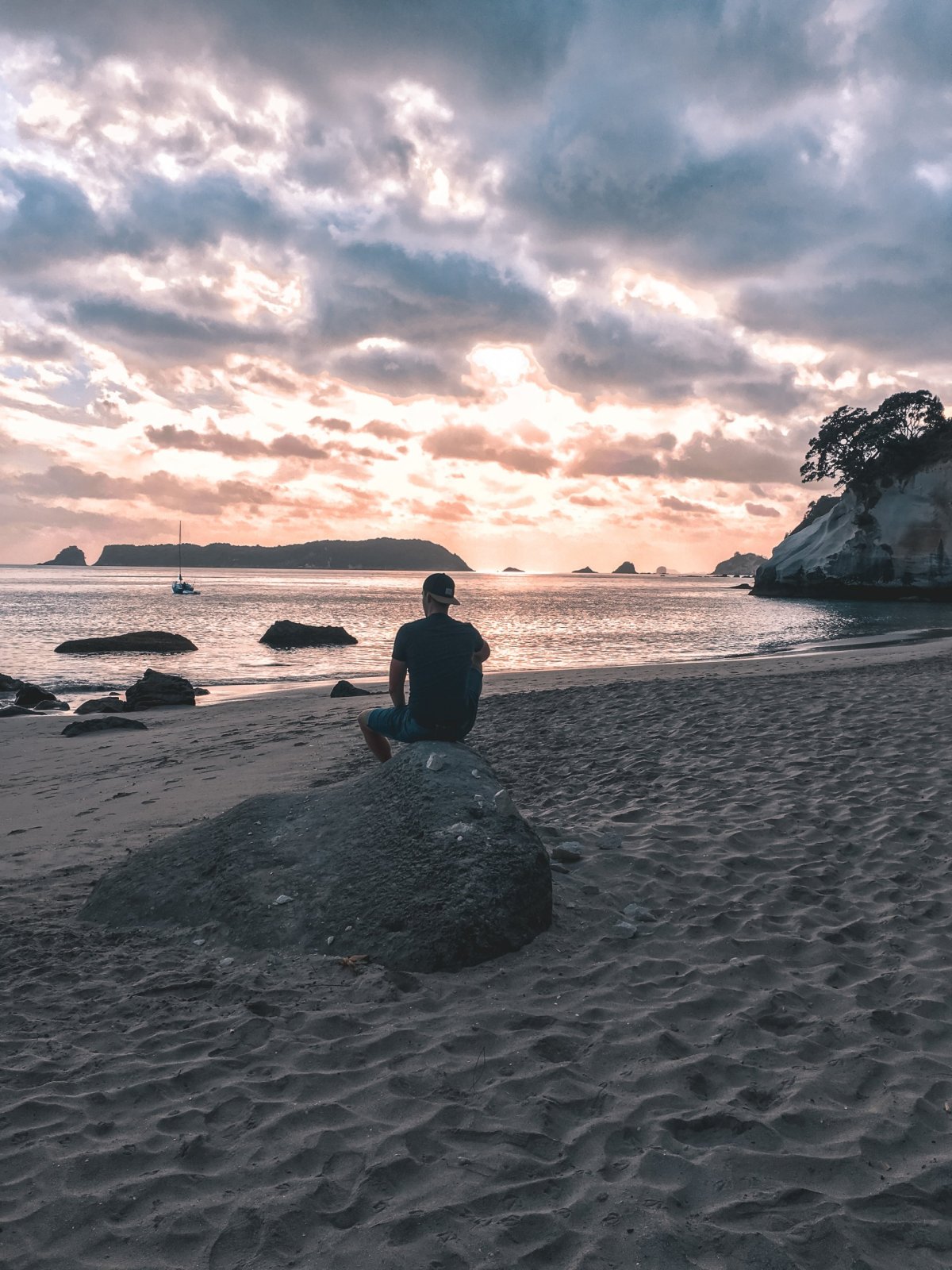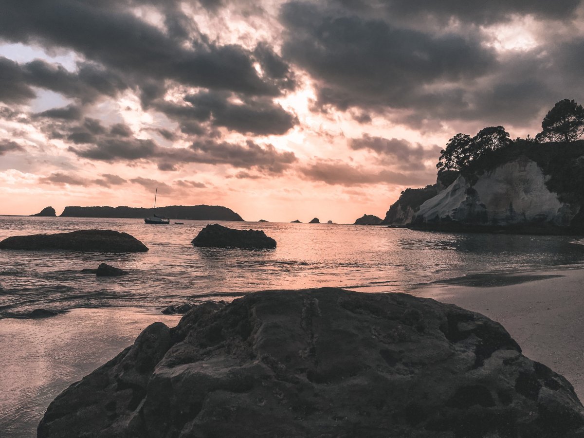 Další víkendovou zastávkou byl poloostrov Coromandel, kam autem dojedete z Aucklandu zhruba za 2 a půl hodiny. Jeli jsme podél západního pobřeží a měli jsme namířeno do free kempu Matarangi boat ramp. Bohužel 6 volných míst bylo obsazených, a tak jsme museli jet o kus dál do placeného kempu Seabreeze holiday park. Na jednu noc byl kemp dostatečný, byli jsme rádi že jsme nějaký volný vůbec našli. V létě je mnohem těžší najít hezký volný kemp. Z toho to kempu jsme to měli alespoň blízko k naší cílové destinaci. V pátek večer jsme si dali rychlou večeři v podobě plněných tortill, přečetla jsem dvě kapitoly e-knížky a šli jsme na kutě. Budík nás měl vzbudit ve 4:30, ale otravní komáři to udělali za něj. Po páté hodině jsme už vyjížděli z kempu směrem na Hahei pláž, odkud jsme v 6 hodin ráno pozorovali východ slunce. Krása střídala nádheru každou minutu. Barvy se měnily z fialové na žlutou a ze žluté na oranžovou. Seděli jsme na rozloženém ručníku, oči ještě slepený, vedle nás poletoval racek a my se nemohli nabažit té krásy.