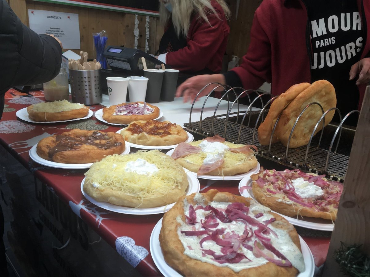Co jsme ochutnali: jídlo na trzích, trdelník, marcipánové bonbony, vánoční svařák, hamburger a české jídlo v české restauraci, maďarské víno