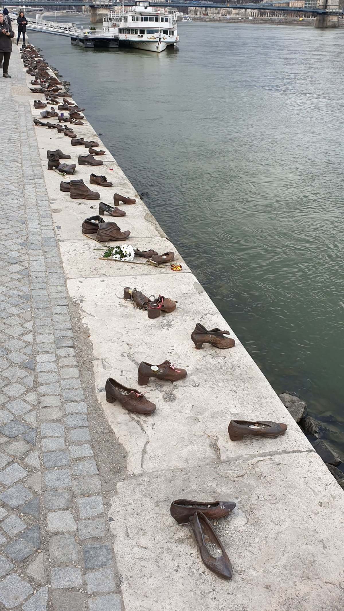 Do třetice všeho dobrého jsme vyrazili přes Řetězový most a za mostem zahnuli doleva. Po chvilce jsme došli k památníku Boty na Dunaji. Jedná se o několik desítek párů kovových bot, které symbolizují boty, jež si muselo několik tisíc Židů za 2. sv. v. na nábřeží vyzout. Hned poté byli zastřeleni a jejich těla svržena do Dunaje.