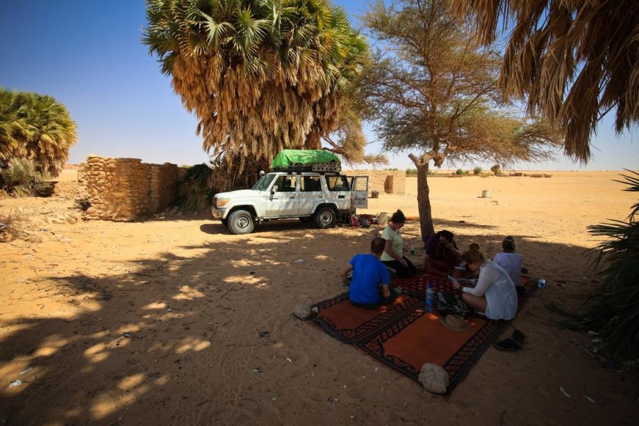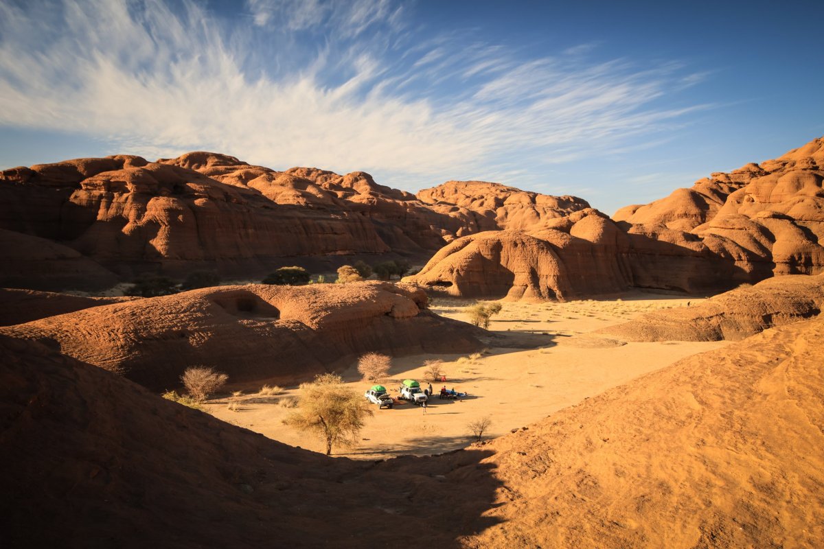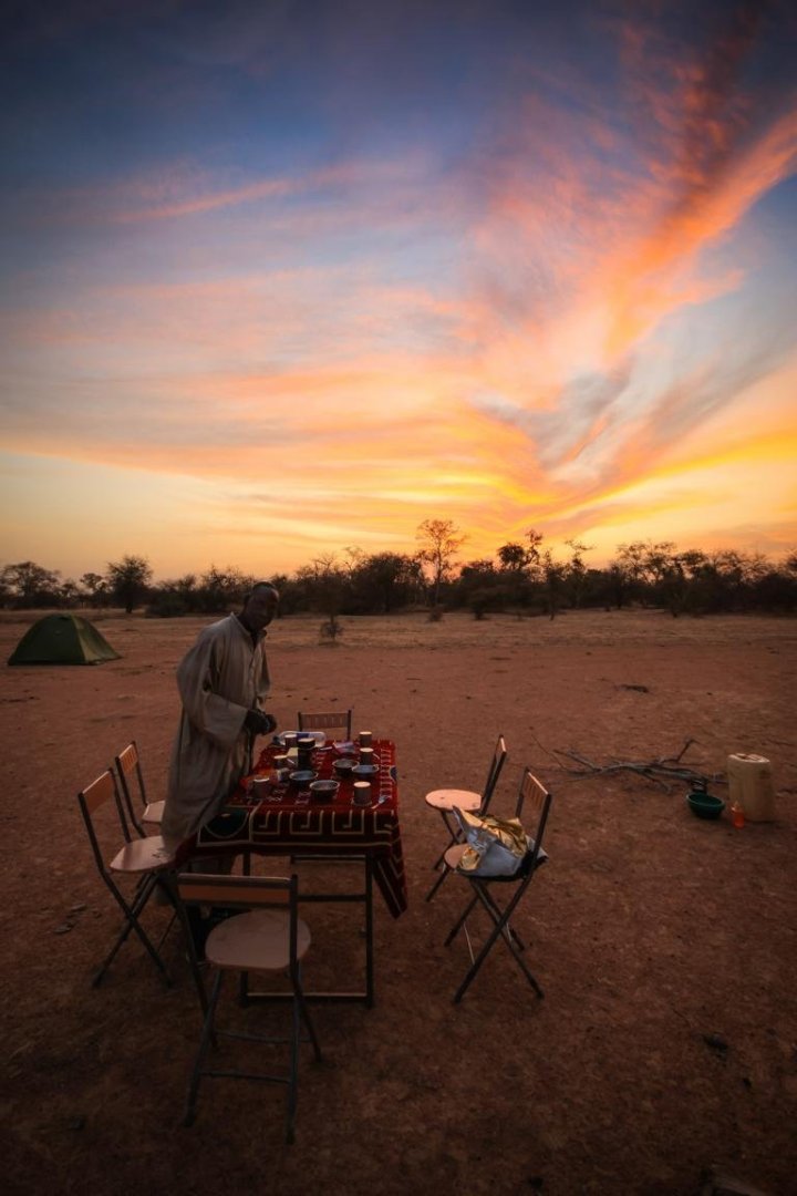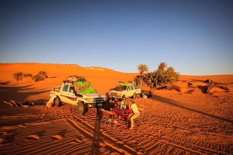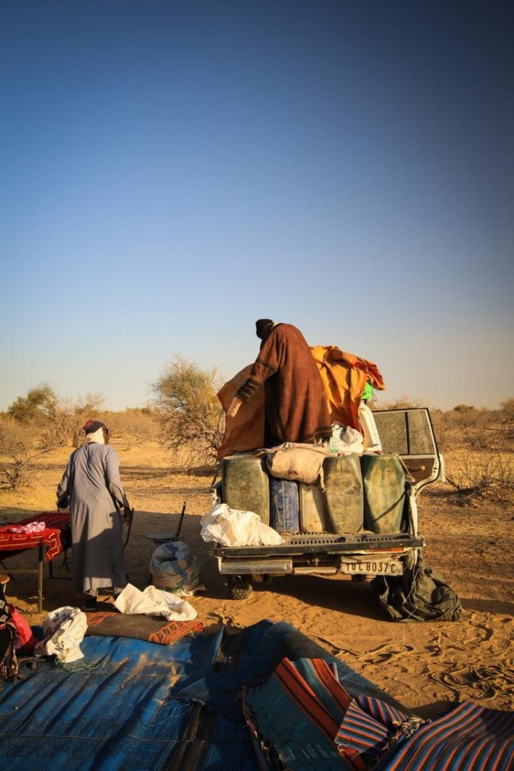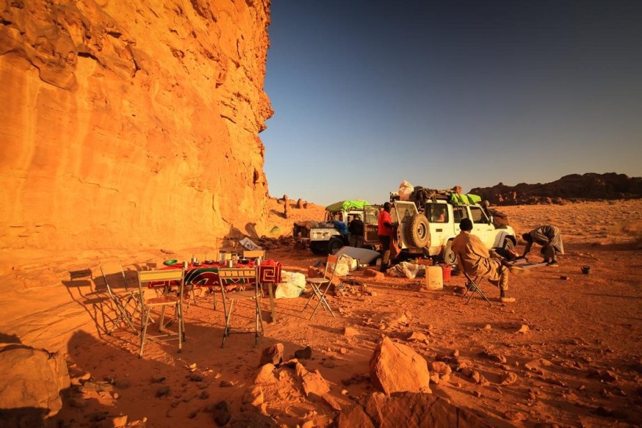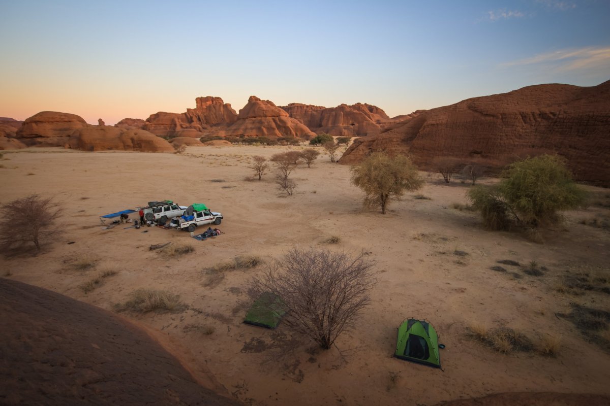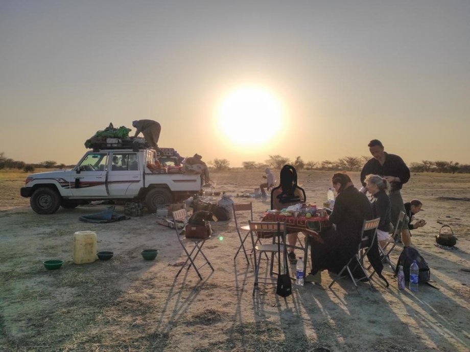 Kdekoliv v Africe jsme, vstáváme ráno brzy. Pokud to okolí (rozuměj lvi, hyeny a podobná havěť) dovolí, vstáváme za tmy abychom s prvními paprsky už byli na cestě a užili si relativně krátký africký den co nejvíc, také milujeme ty nej hodiny pro fotografa tzv. Golden hours. Tak tady se také snažíme vstávat brzy, ale trochu se to míjí účinkem, stejně z kempu vyjíždíme až kolem 7:30-8h. :-( Ráno pobalíme věci, proběhne nějaká ranní hygiena a snídaně, máme s sebou i kuchaře, takže není žádný stres kdo a co se bude vařit. Tedy tady by stres stejně nebyl, když tu toho moc není. Trojka čadského doprovodu bylí auta a vyrážíme dál dle plánu. Kolem 12:30-14h je pauza na oběd (za mě tedy zbytečně dlouhý a celkem i zbytečný oběd, ale chápu náročnost trasy a teplota není pro řidiče úplně jednoduchá, odpočinek potřebují). Po obědě další kus plánu, zastavujeme na fotky na kukačku prostě si ta místa prohlédnout a užít. Je vedro! Kolem 17h se hleá pěkné místo na kempování. Zakempuje se, postaví stany a je čas na větší denní hygienu. Každý má na celý den pouze 3litry užitkové vody na mytí a cokoliv co potřebuje. To je ještě dobré množství :-) . Každý si pak dělá co chce, náš bivouac je většinou na krásném fotogenickém místě, často nás kuchař musí volat ke stolu :-). Následuje večeře, večerní čajík, volná zábava většinou jako diskuze o celém dni a příprava na den další. A za tichého dutí větru uleháme ke spánku v tom nejluxusnějším hotelu světa - milionstar hotel uprostřed úchvatné Sahary. V poušti jsou miliony nádherných míst přímo lákajících na kempování. Říká se "cheš-li poznat Afriku, zapomeň na lodže a postav stan".