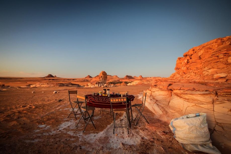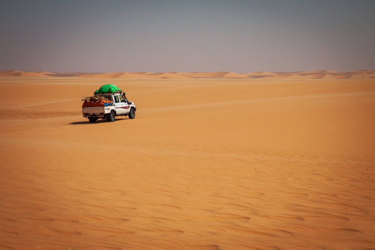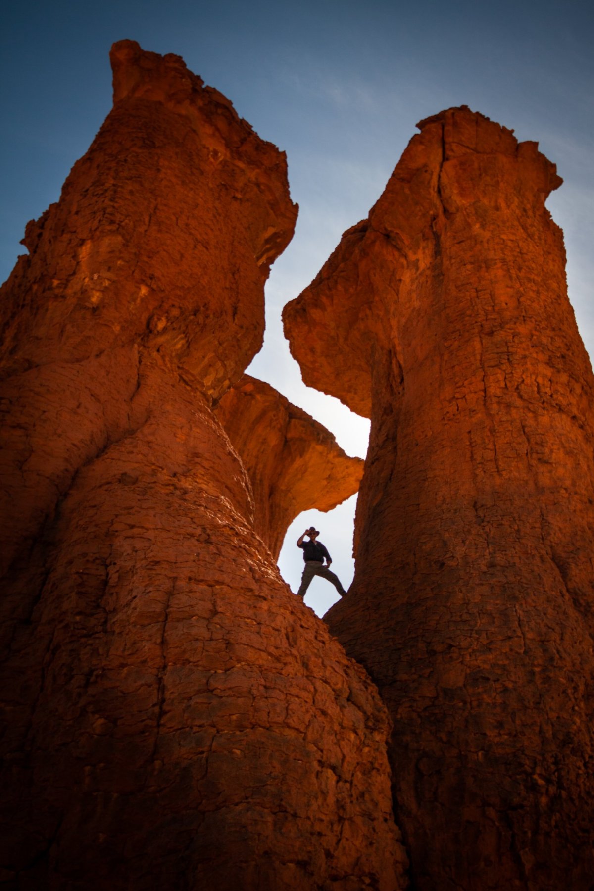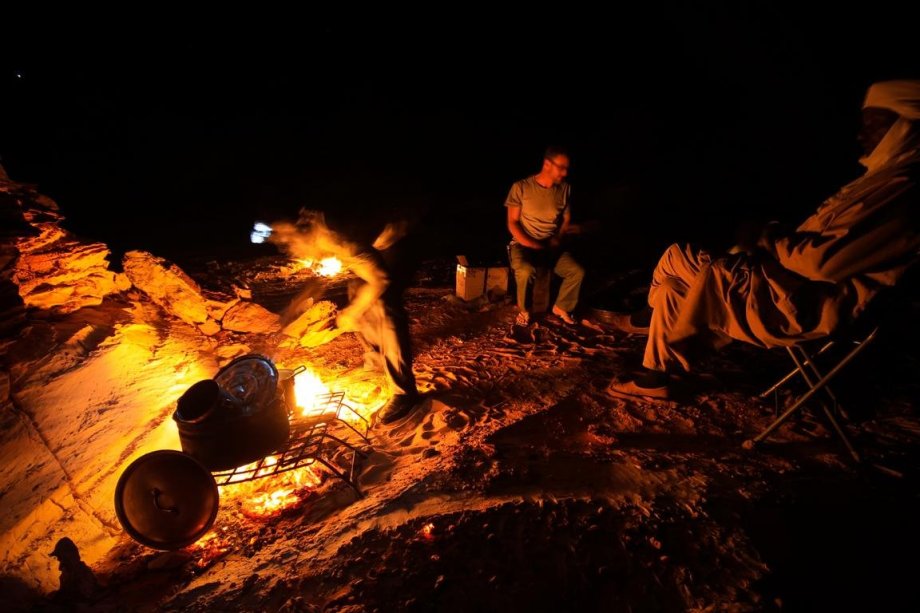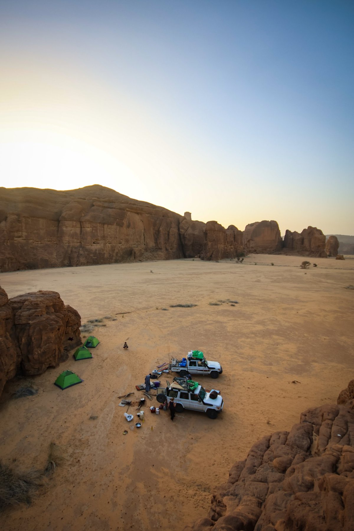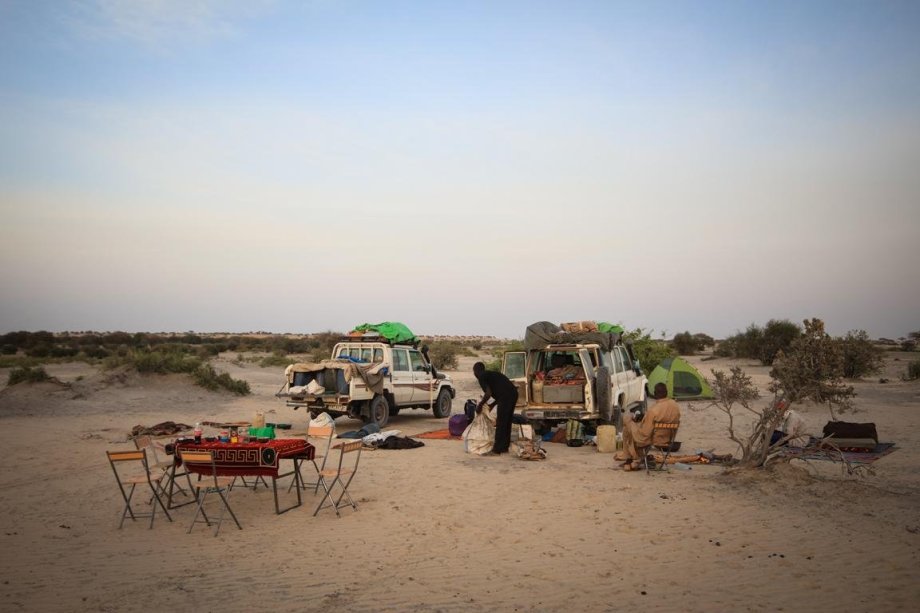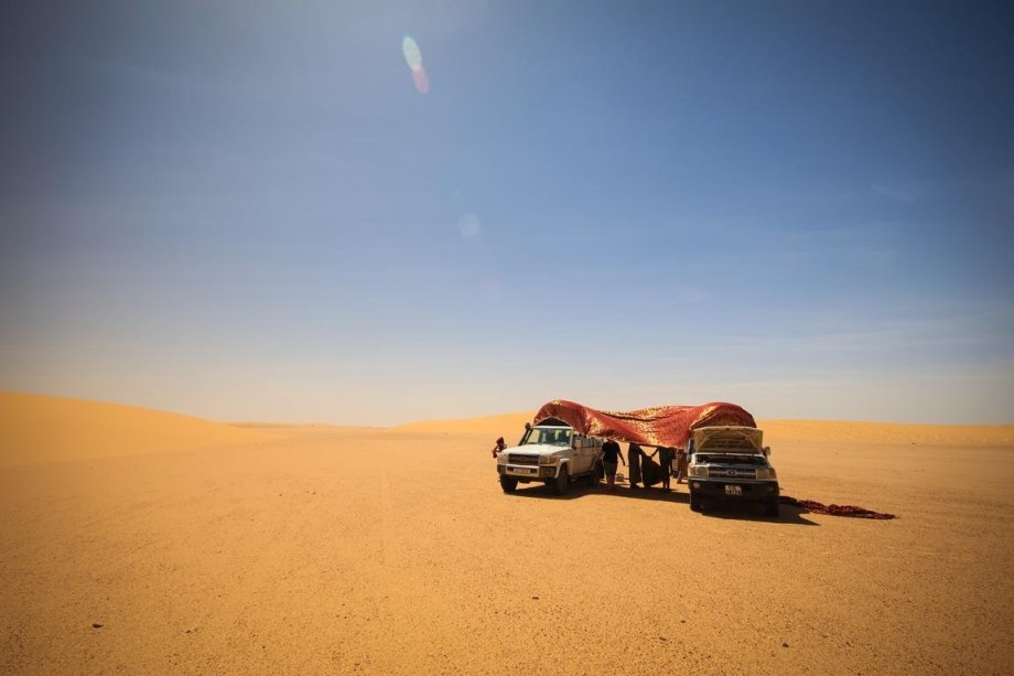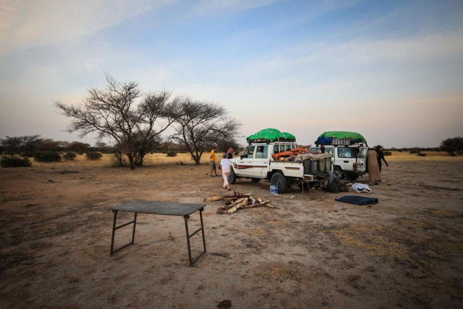 Kdekoliv v Africe jsme, vstáváme ráno brzy. Pokud to okolí (rozuměj lvi, hyeny a podobná havěť) dovolí, vstáváme za tmy abychom s prvními paprsky už byli na cestě a užili si relativně krátký africký den co nejvíc, také milujeme ty nej hodiny pro fotografa tzv. Golden hours. Tak tady se také snažíme vstávat brzy, ale trochu se to míjí účinkem, stejně z kempu vyjíždíme až kolem 7:30-8h. :-( Ráno pobalíme věci, proběhne nějaká ranní hygiena a snídaně, máme s sebou i kuchaře, takže není žádný stres kdo a co se bude vařit. Tedy tady by stres stejně nebyl, když tu toho moc není. Trojka čadského doprovodu bylí auta a vyrážíme dál dle plánu. Kolem 12:30-14h je pauza na oběd (za mě tedy zbytečně dlouhý a celkem i zbytečný oběd, ale chápu náročnost trasy a teplota není pro řidiče úplně jednoduchá, odpočinek potřebují). Po obědě další kus plánu, zastavujeme na fotky na kukačku prostě si ta místa prohlédnout a užít. Je vedro! Kolem 17h se hleá pěkné místo na kempování. Zakempuje se, postaví stany a je čas na větší denní hygienu. Každý má na celý den pouze 3litry užitkové vody na mytí a cokoliv co potřebuje. To je ještě dobré množství :-) . Každý si pak dělá co chce, náš bivouac je většinou na krásném fotogenickém místě, často nás kuchař musí volat ke stolu :-). Následuje večeře, večerní čajík, volná zábava většinou jako diskuze o celém dni a příprava na den další. A za tichého dutí větru uleháme ke spánku v tom nejluxusnějším hotelu světa - milionstar hotel uprostřed úchvatné Sahary. V poušti jsou miliony nádherných míst přímo lákajících na kempování. Říká se "cheš-li poznat Afriku, zapomeň na lodže a postav stan".